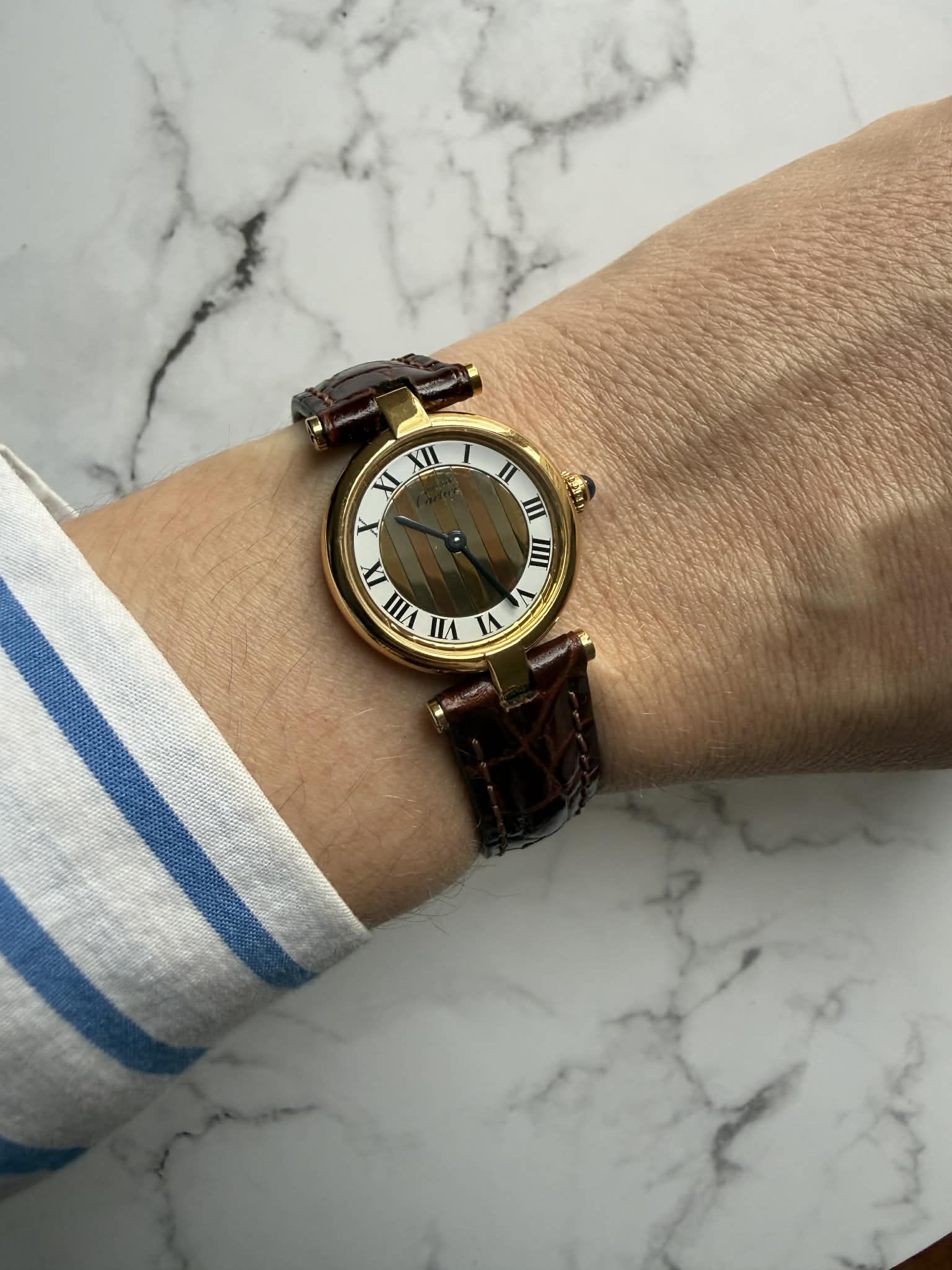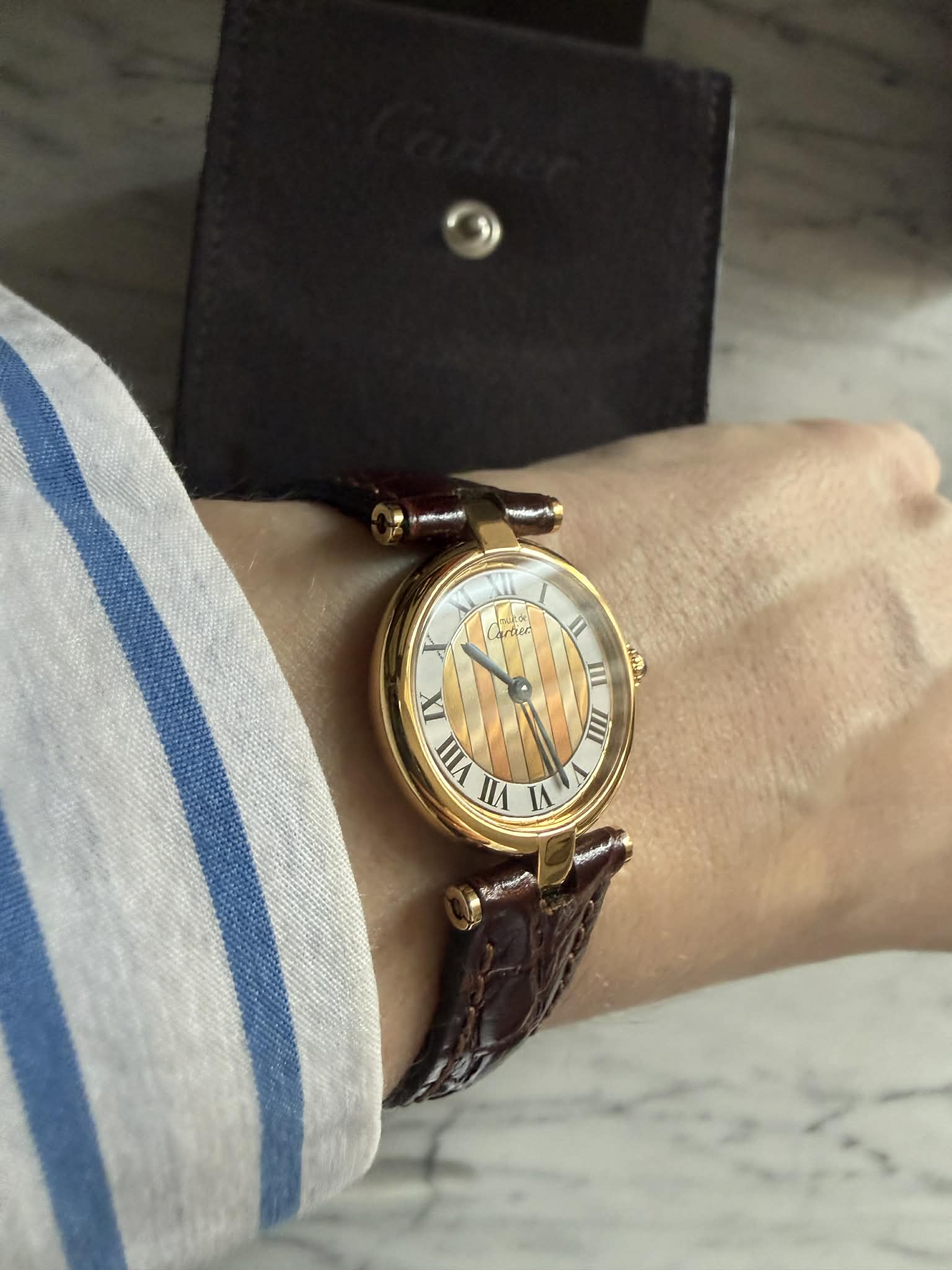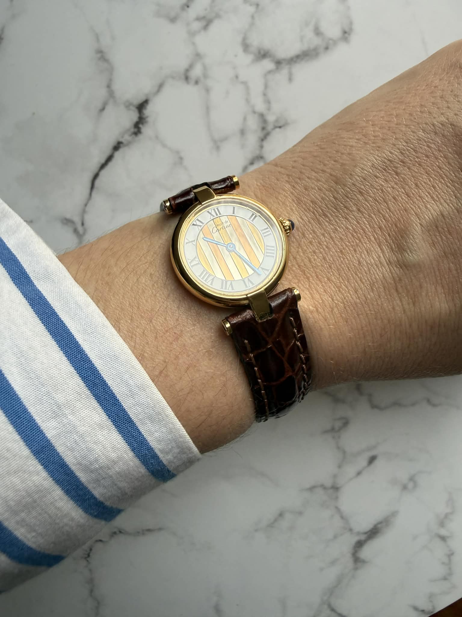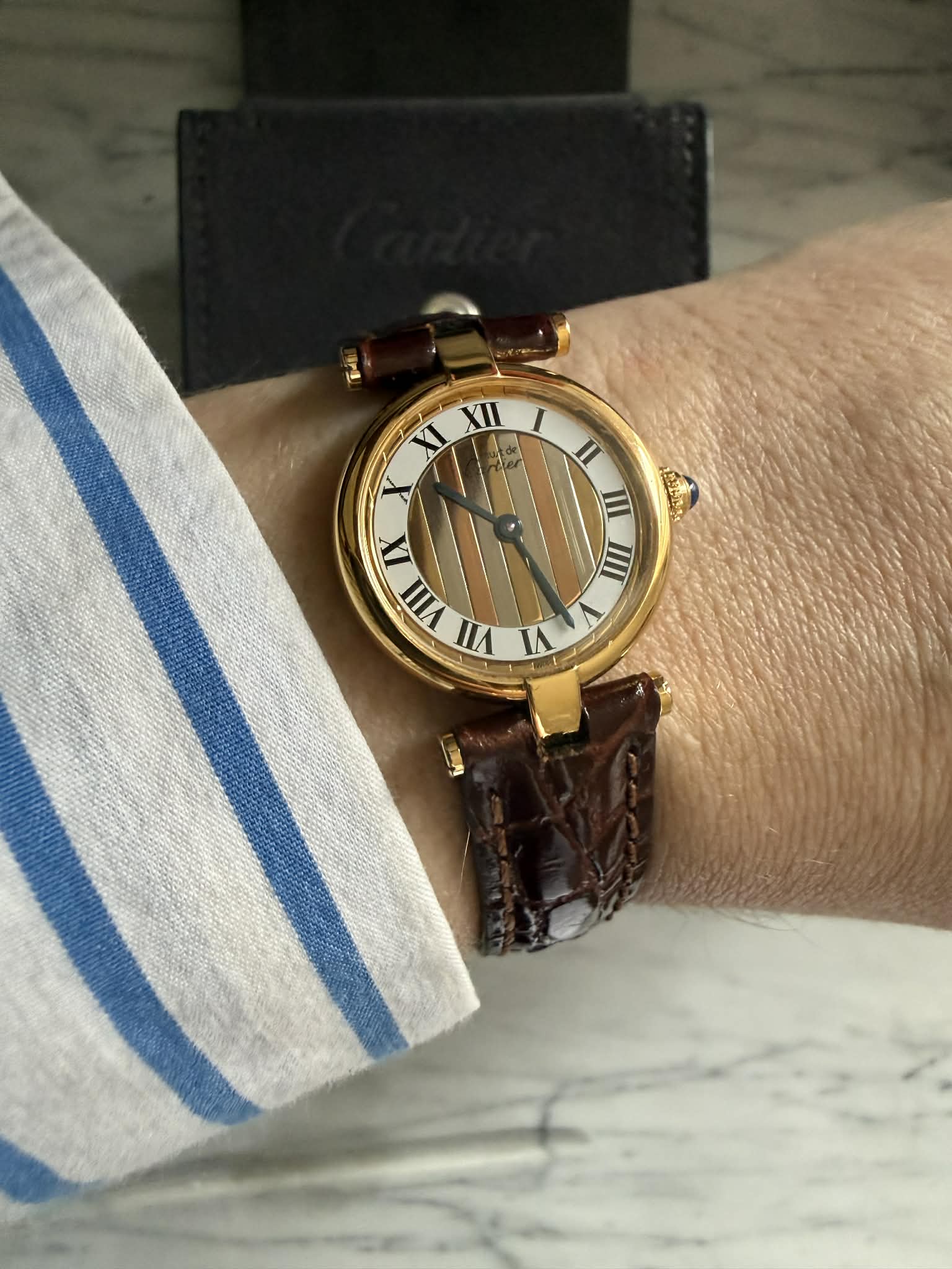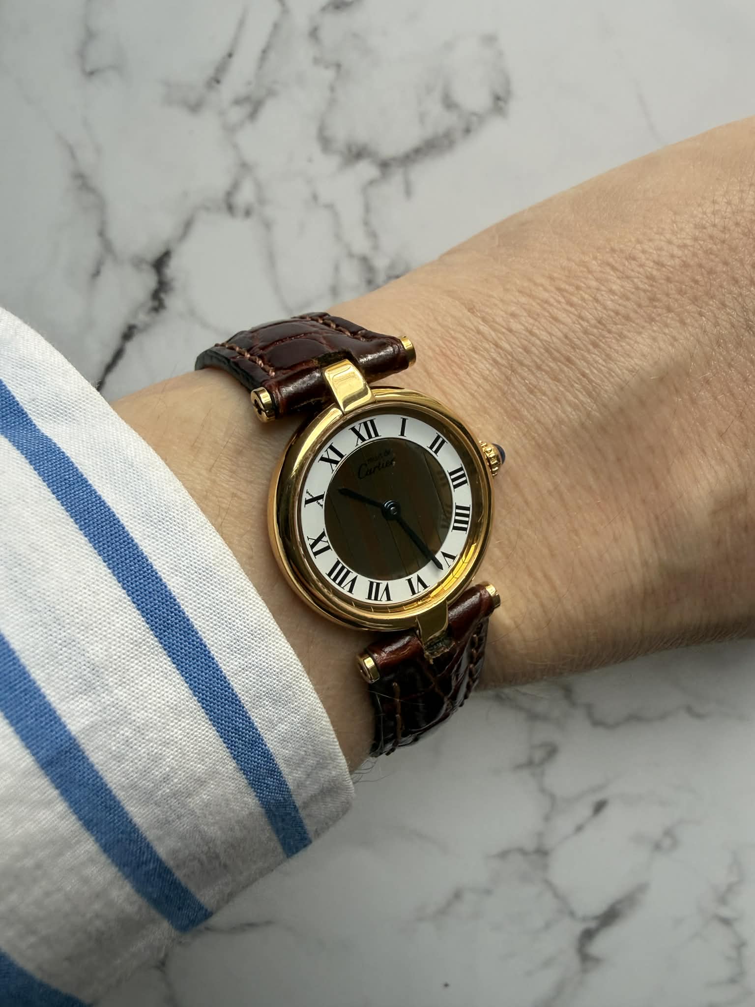 Oryginalny zegarek Cartier Must Vendome Vermeil w eleganckim i bardzo rzadko spotykanym połączeniu trzech kolorów! Piękny, ponadczasowy dodatek dla miłośników luksusowych akcesoriów. Model kwarcowy, w pełni sprawny, z wymienioną baterią. Zegarek idealny na prezent lub do kolekcji.