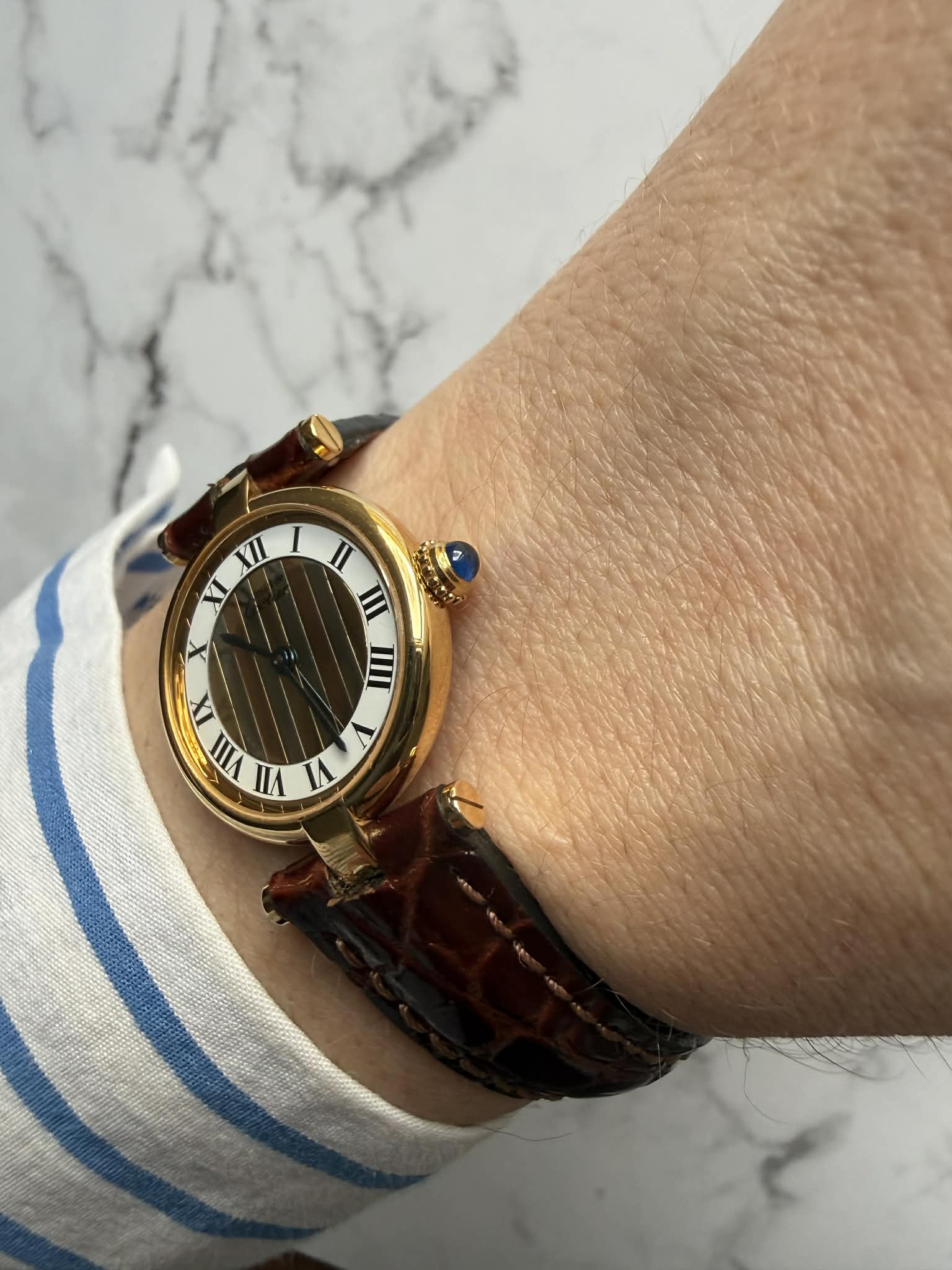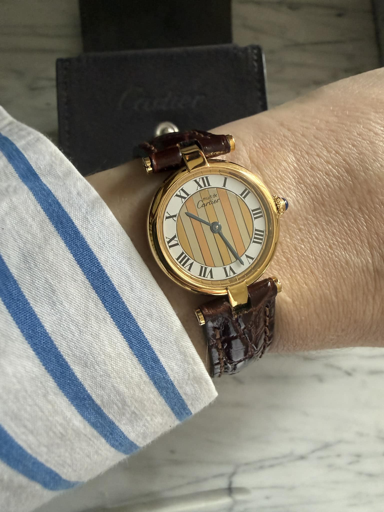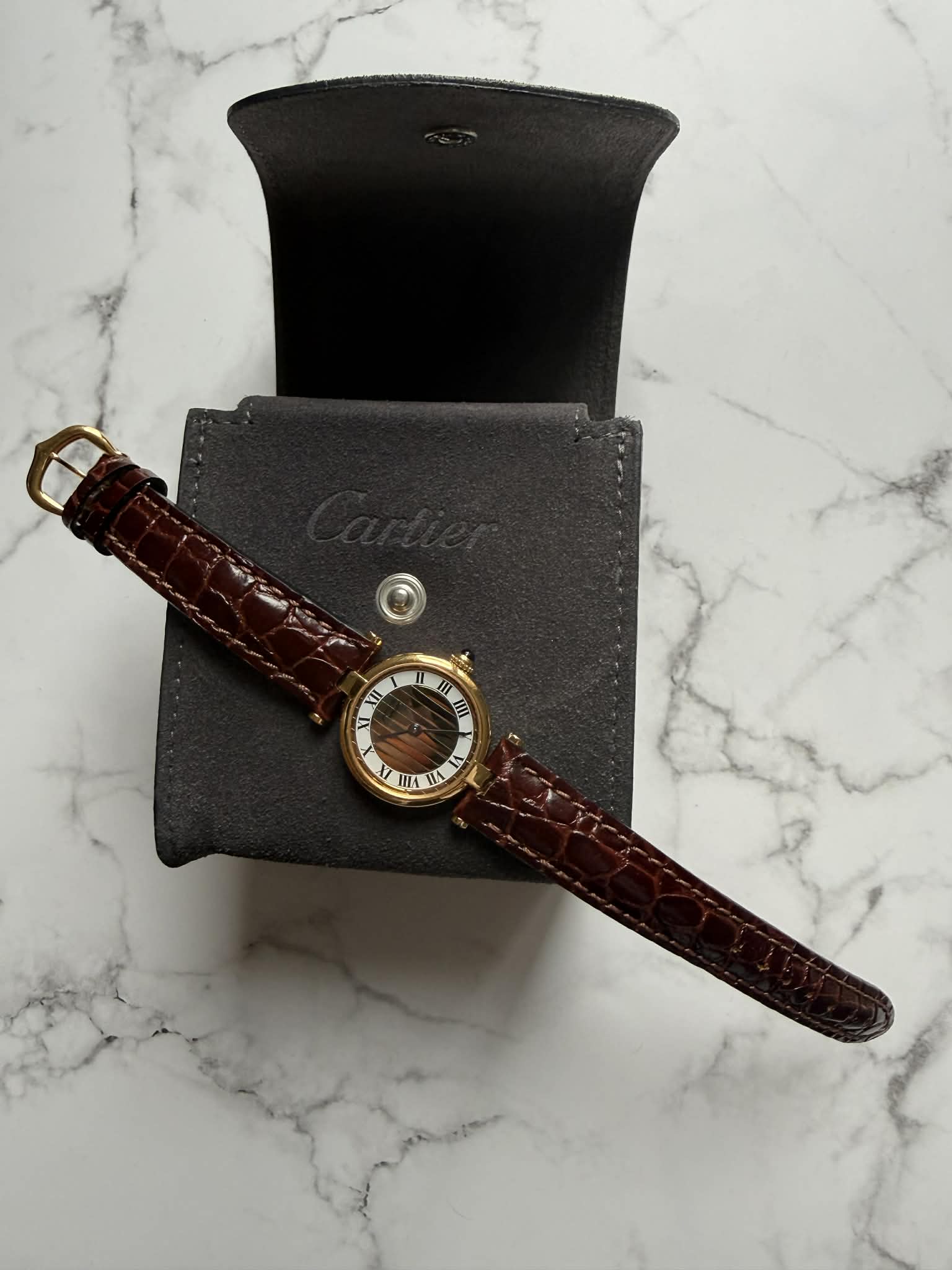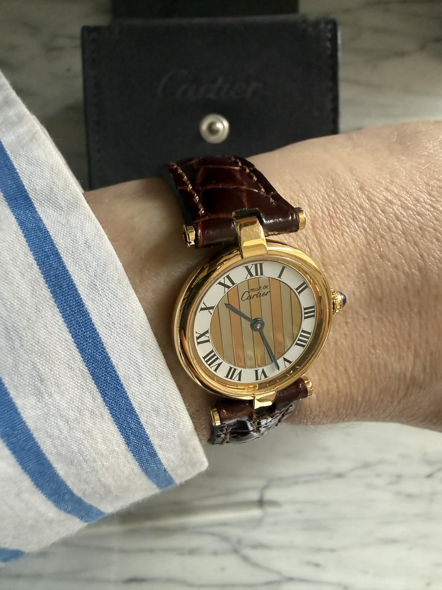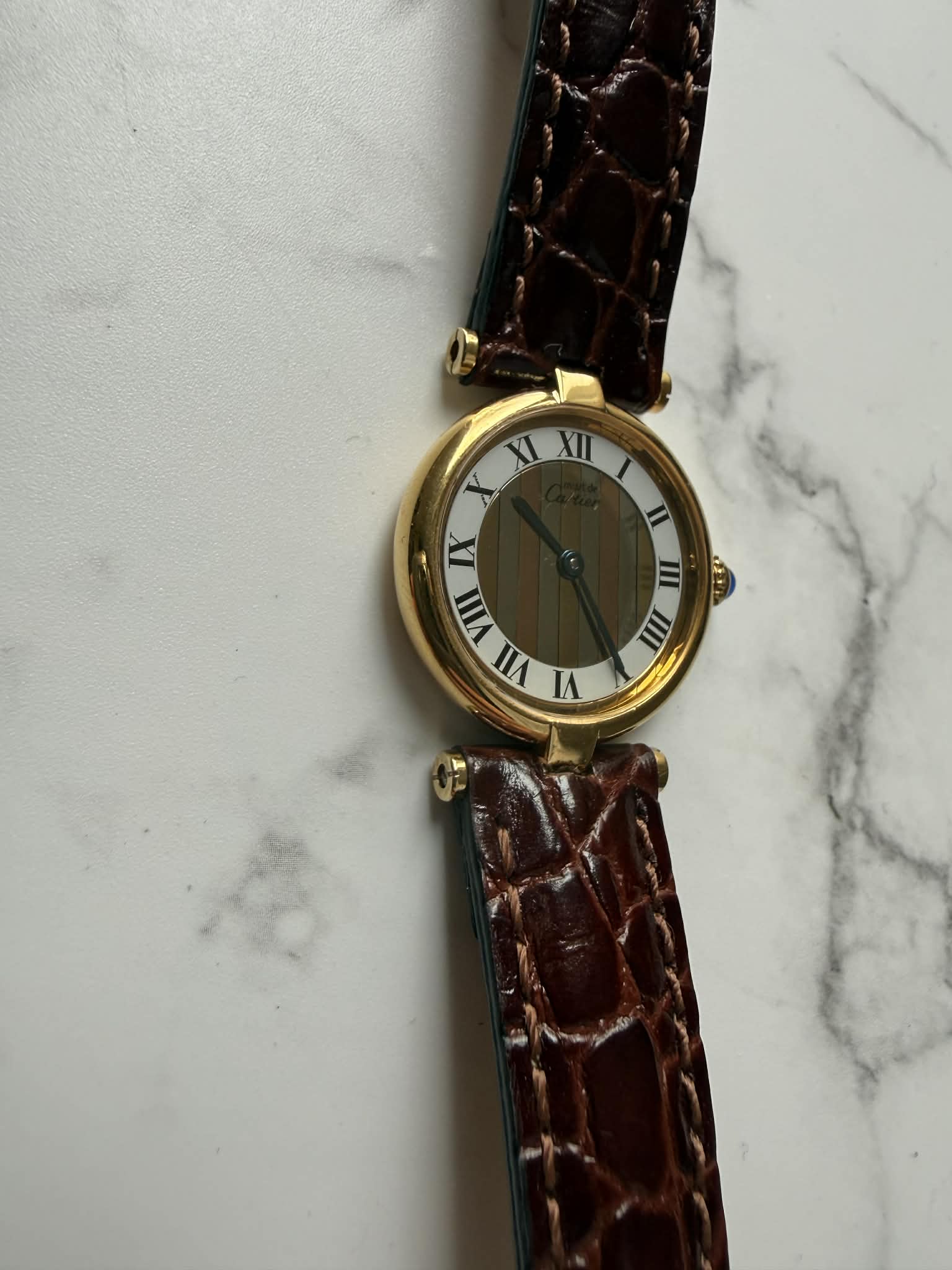 Oryginalny zegarek Cartier Must Vendome Vermeil w eleganckim i bardzo rzadko spotykanym połączeniu trzech kolorów! Piękny, ponadczasowy dodatek dla miłośników luksusowych akcesoriów. Model kwarcowy, w pełni sprawny, z wymienioną baterią. Zegarek idealny na prezent lub do kolekcji.