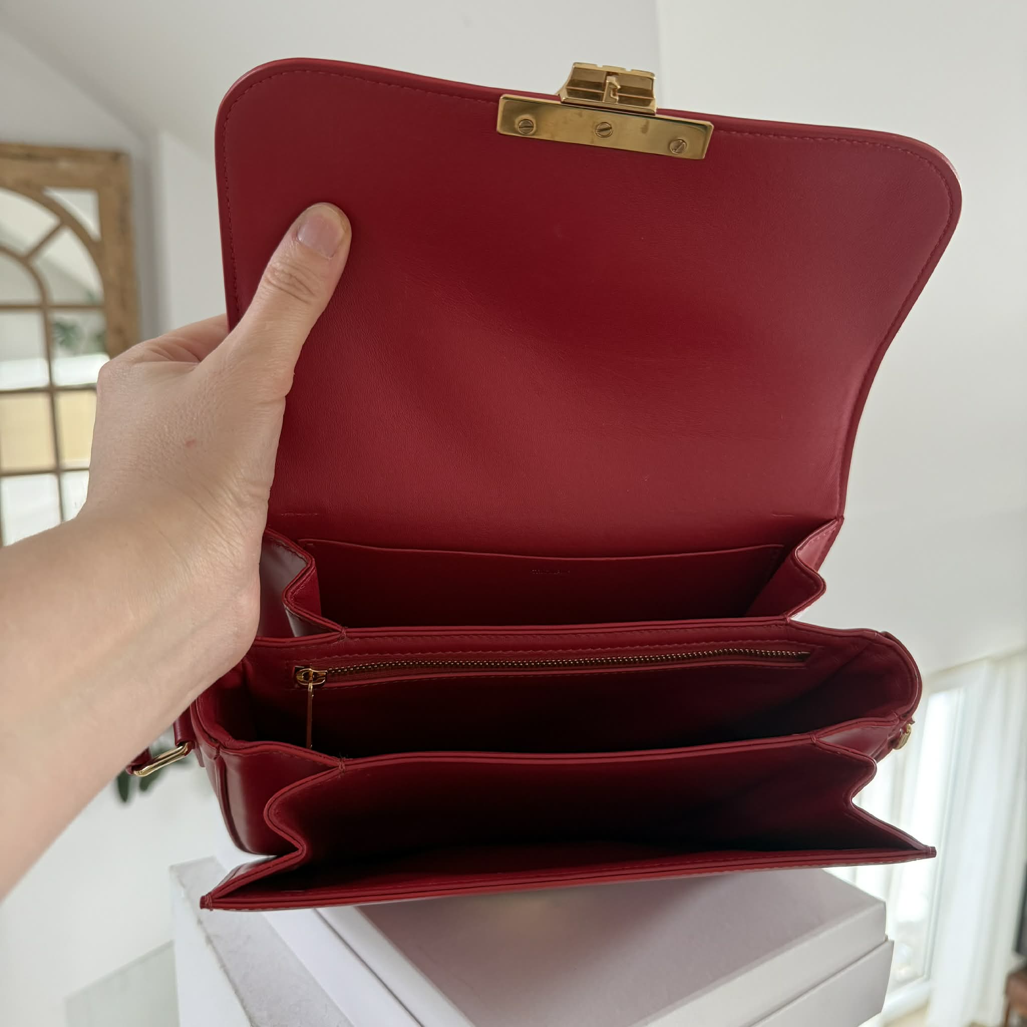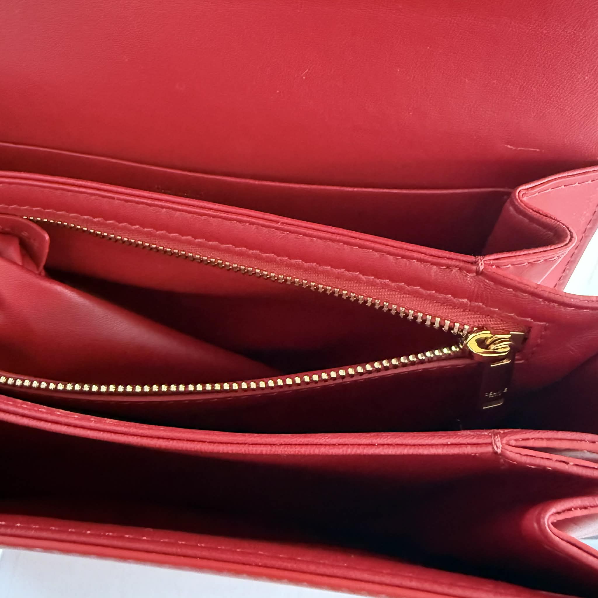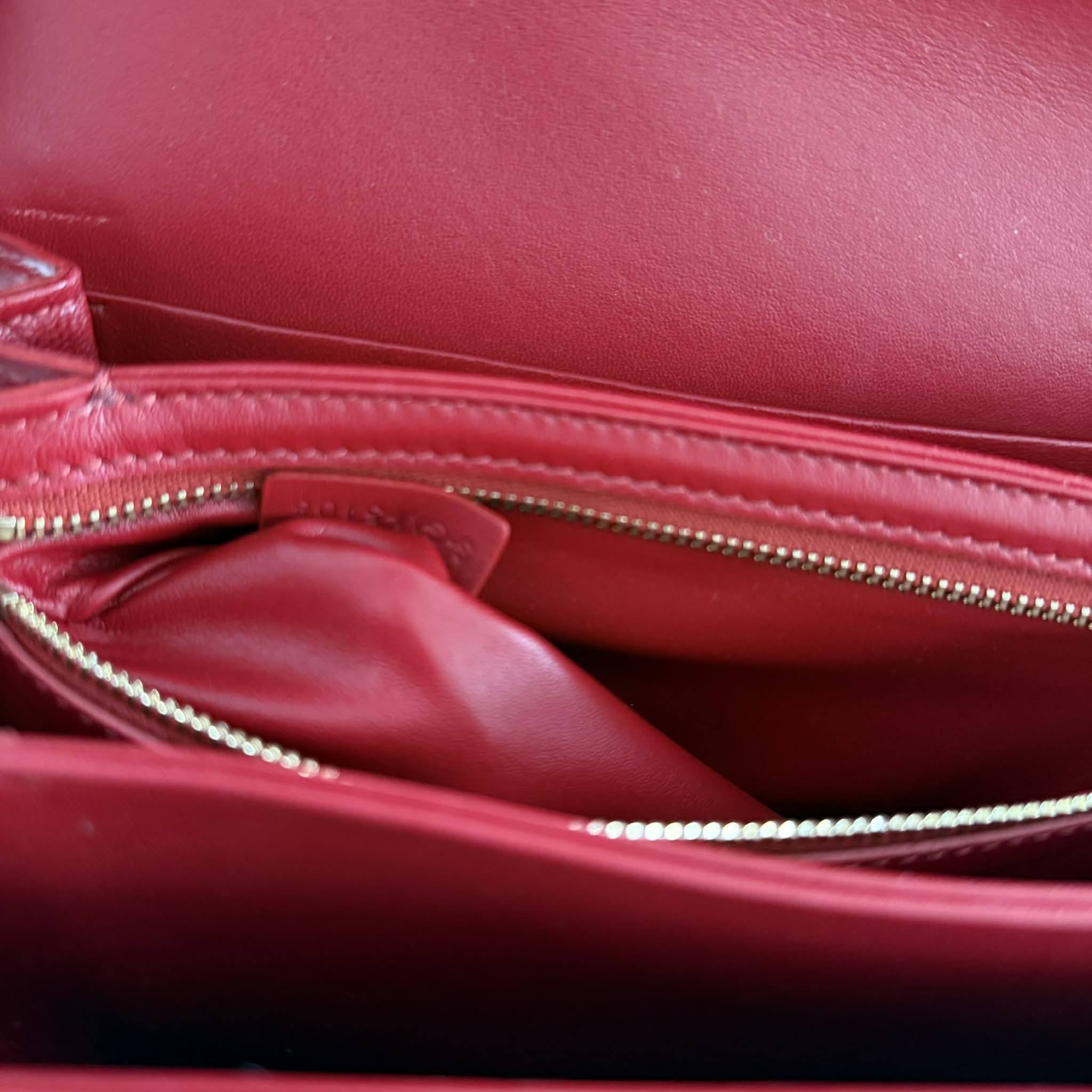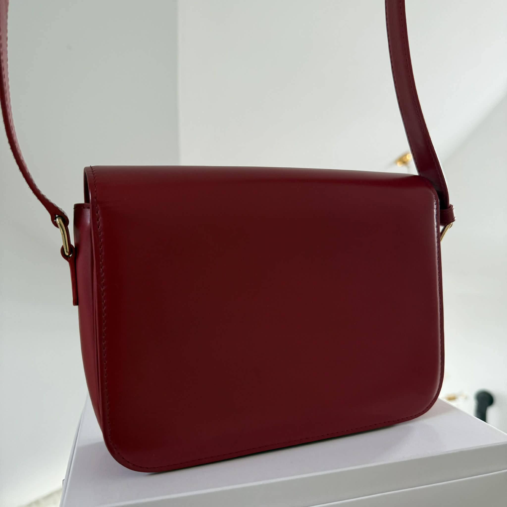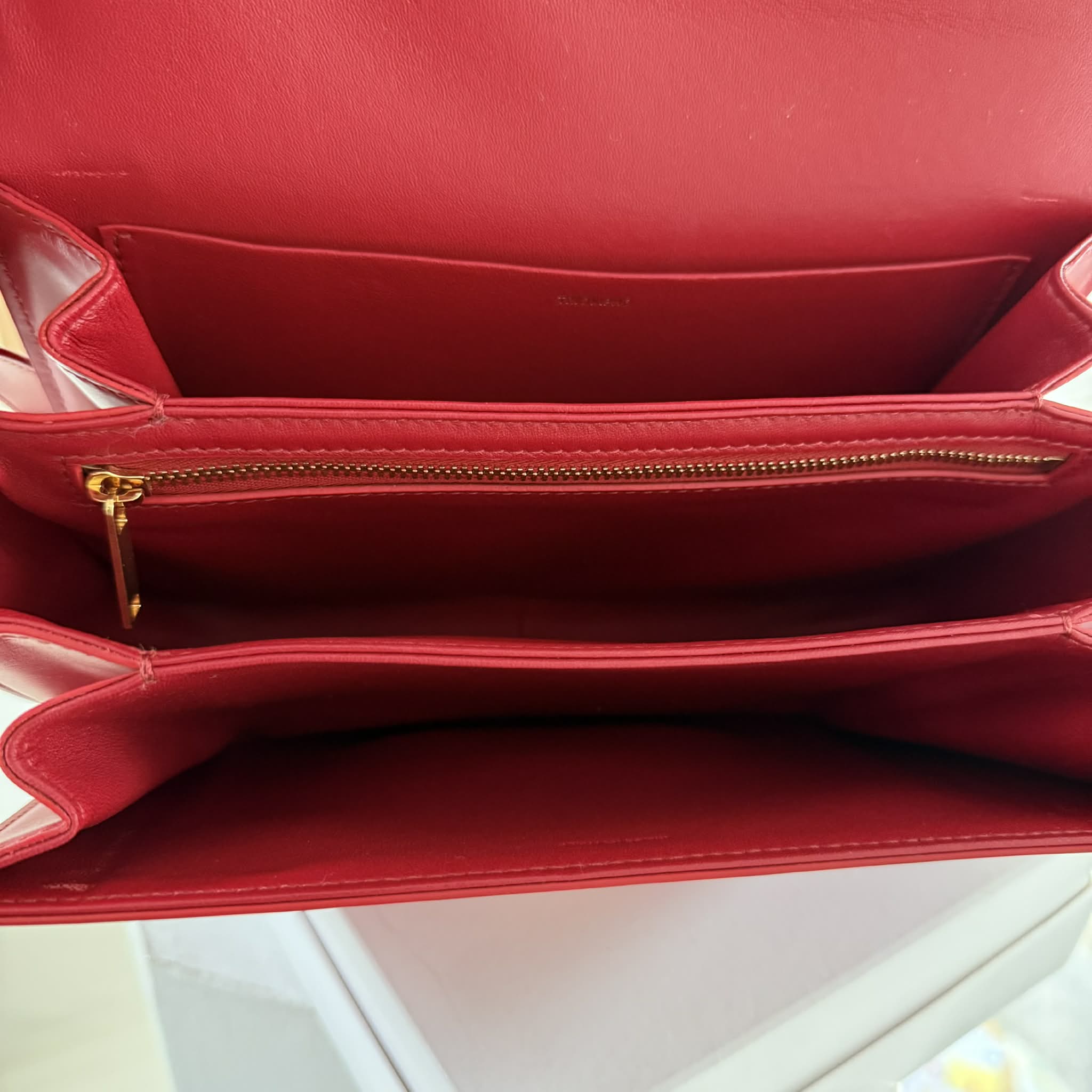 Wykonana w 100% z naturalnej skóry cielęcej – satynowej oraz w odcieniu tan – torebka Celine Triomphe zachwyca miękkością, strukturą i trwałością. Jej klasyczny, czerwony kolor oraz złote wykończenia tworzą wyjątkowe elegancki i ponadczasowy duet.