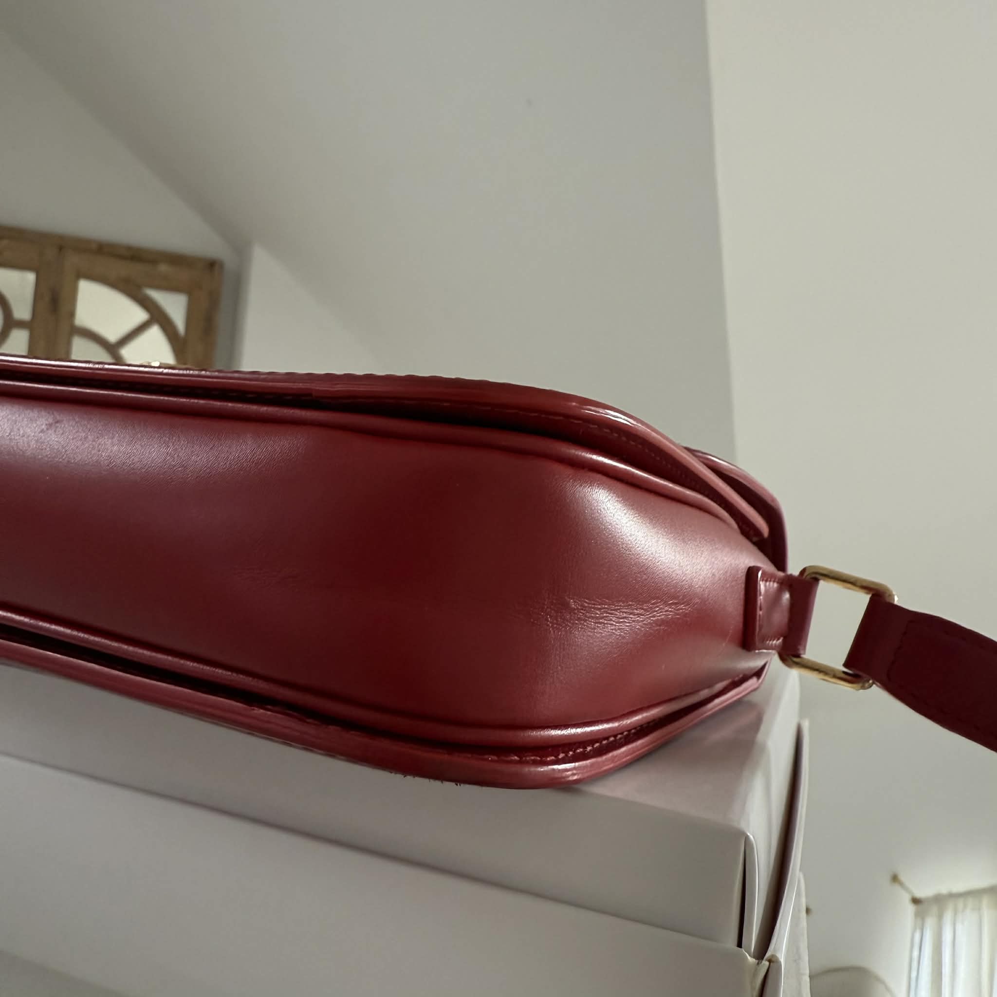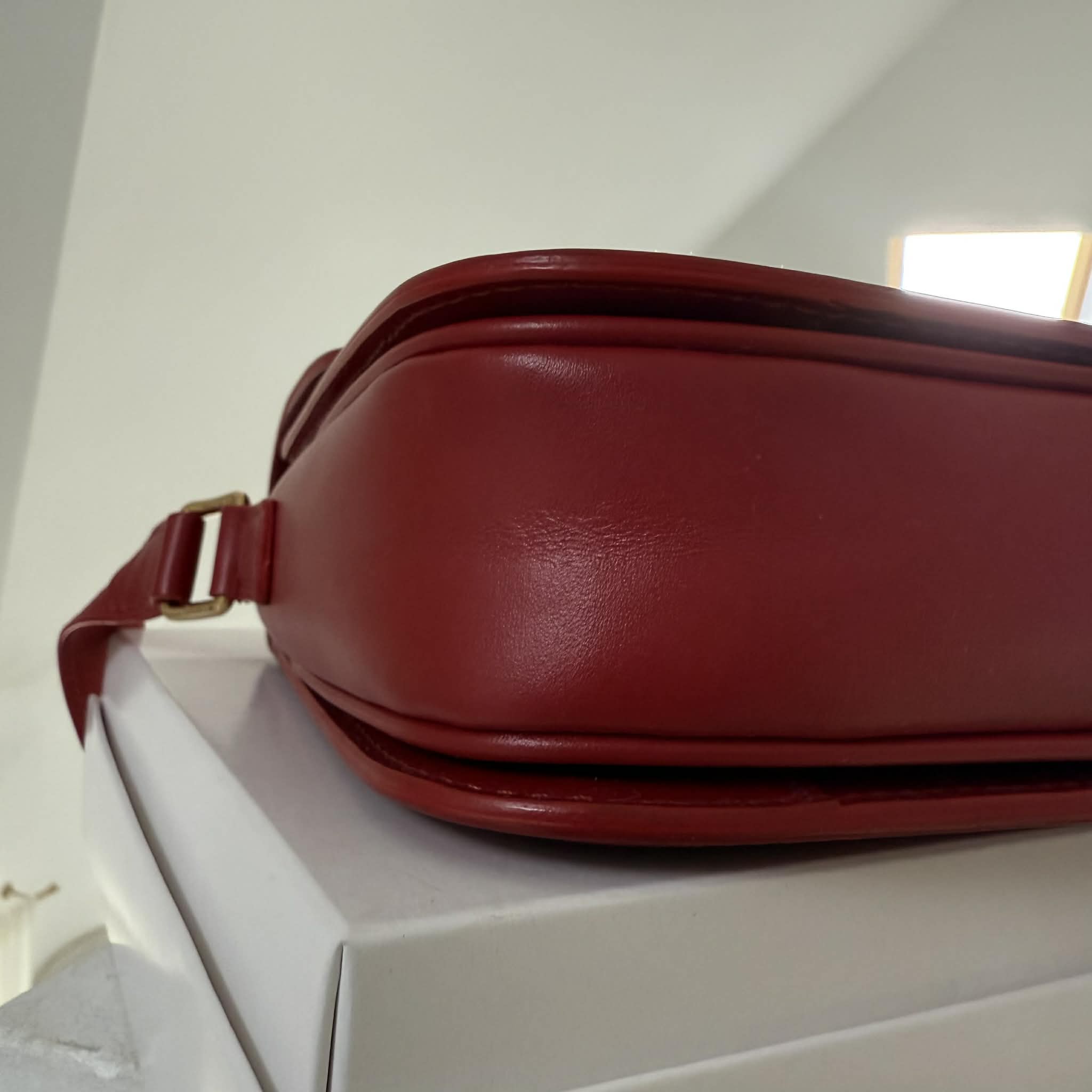 Skóra gładka, bez przetarć. Elementy metalowe w kolorze złota w bdb stanie. Klamra posiada delikatne zarysowania i ślady użytkowania, widać na zdjęciach. Zapięcie działa bez zarzutu. Delikatne ślady użytkowania typowe dla torebki wcześniej zakładanej – torba jest po odświeżeniu z zewnętrz.