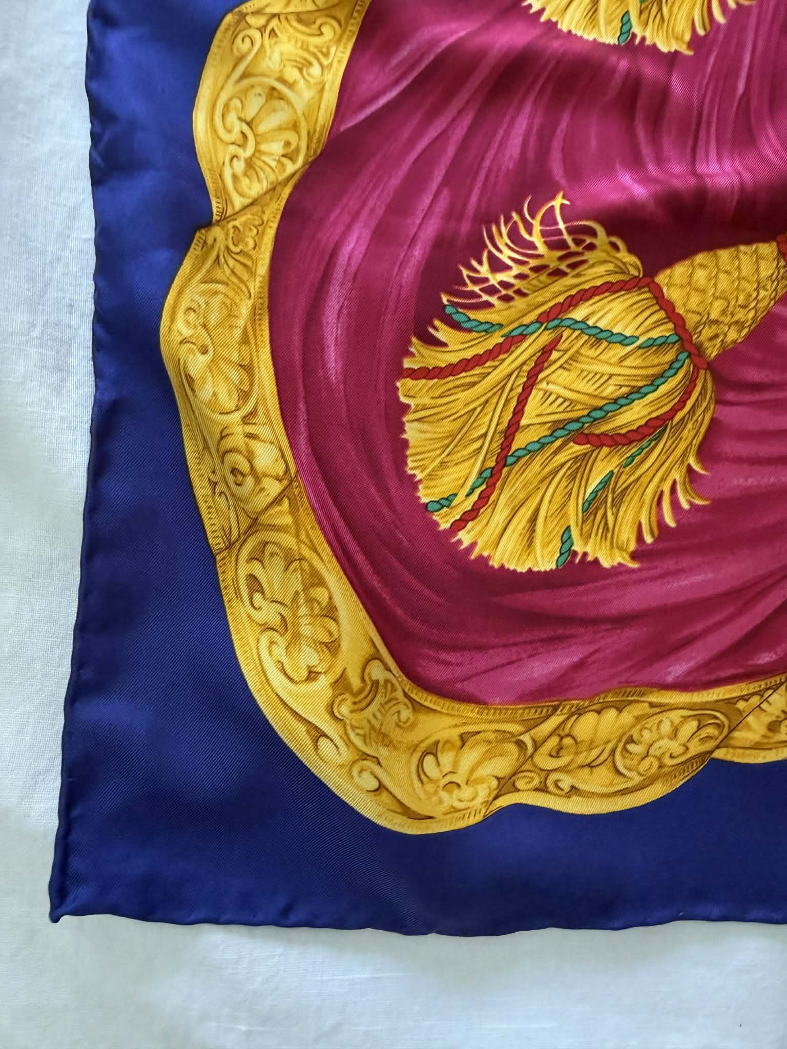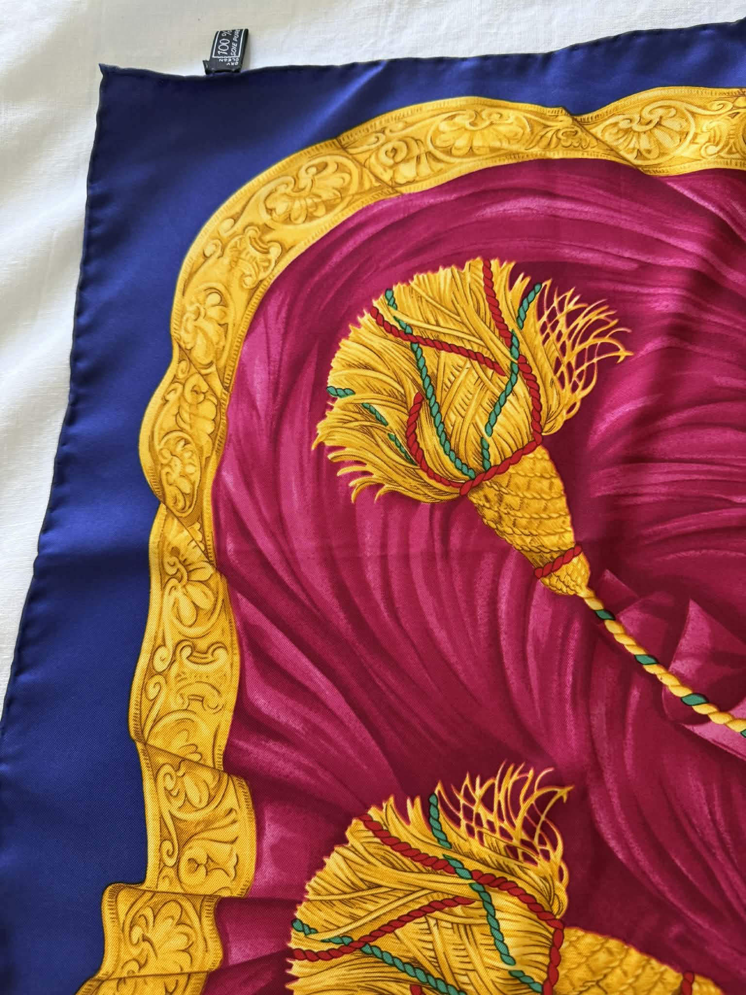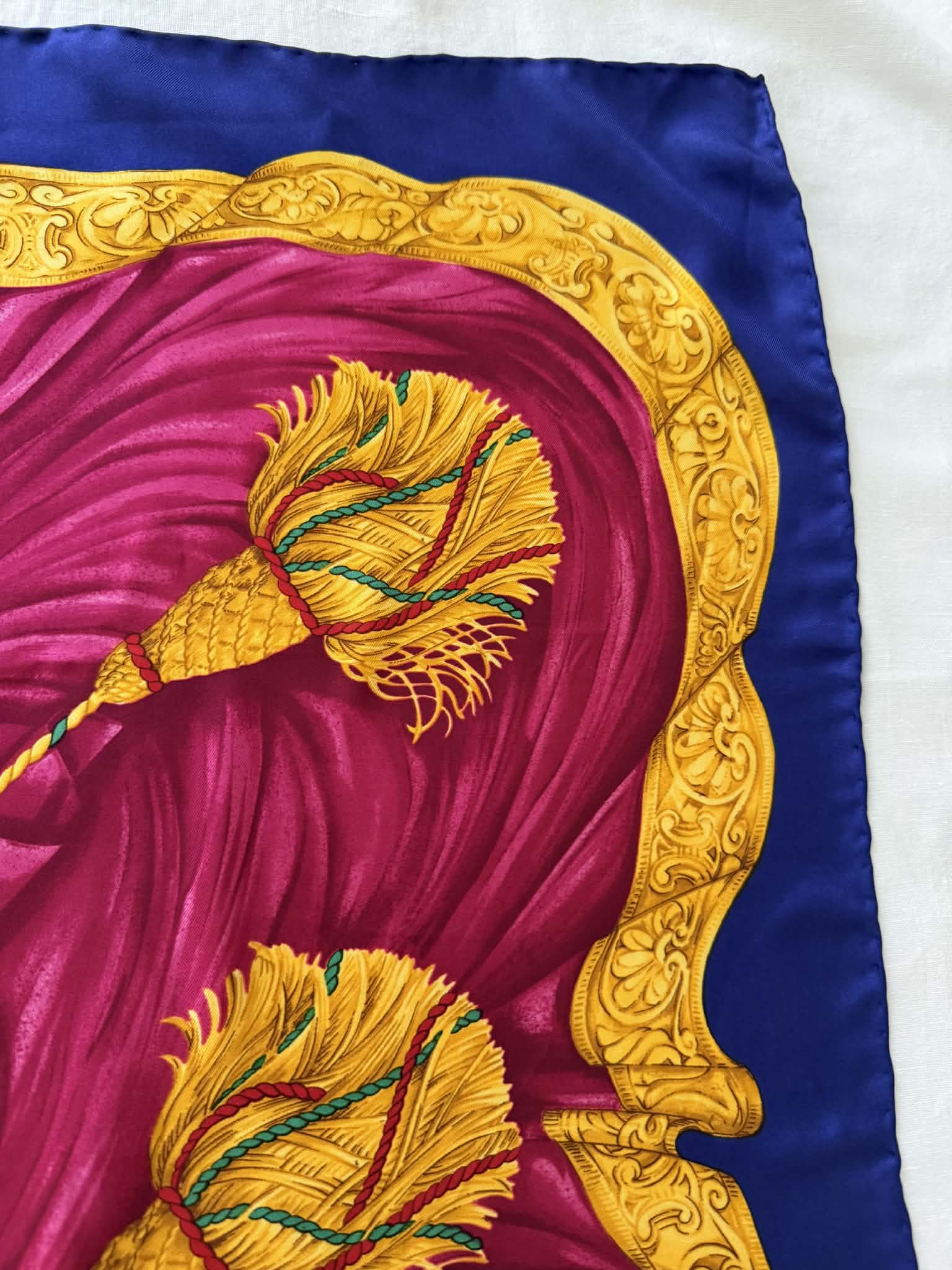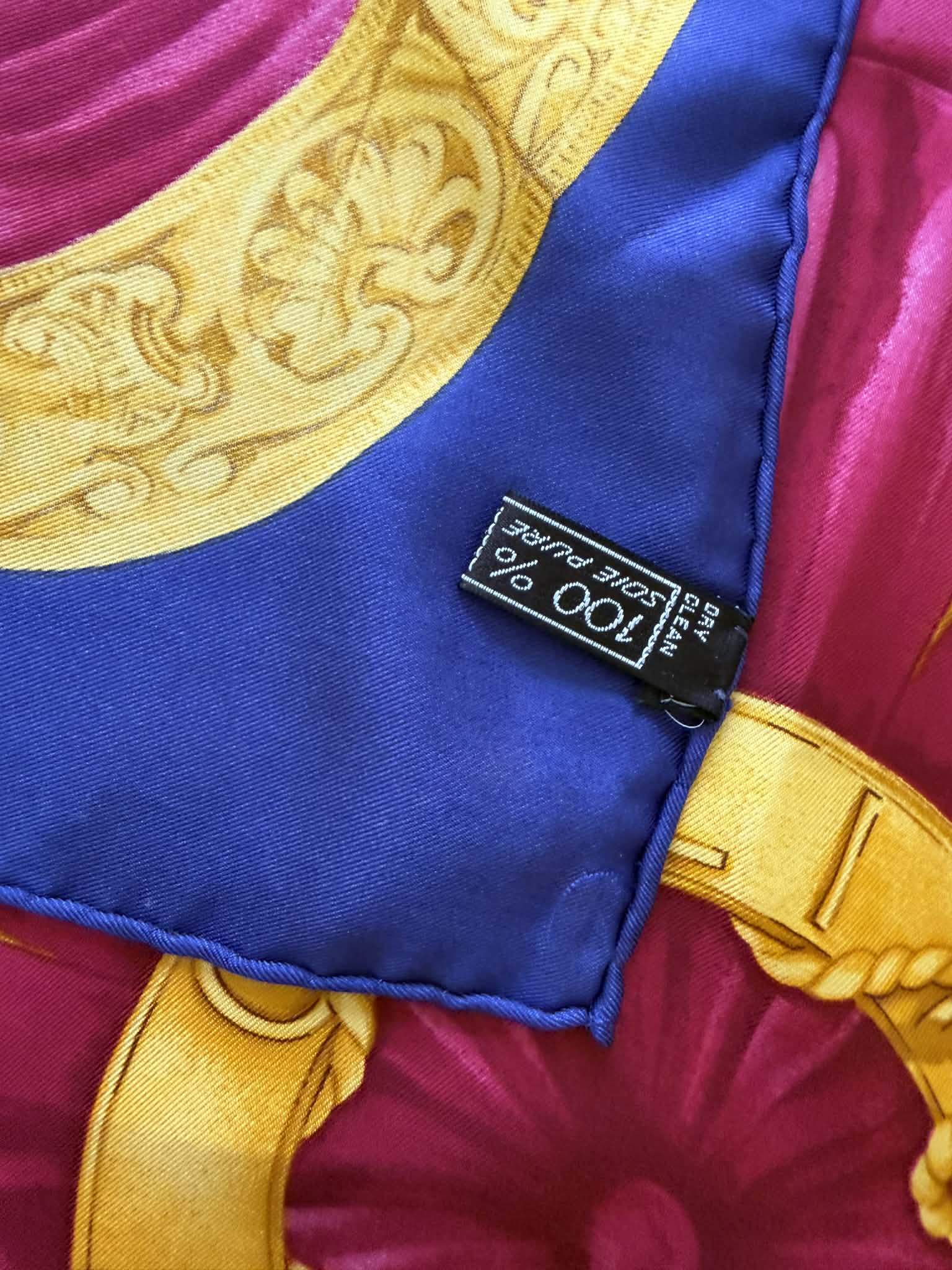 Ponadczasowy design, wyrazisty motyw triomphe/globusa i łuku trumfalnego sprawiają, że chusta prezentuje się wyjątkowo efektownie i stylowo. Produkt jest w bardzo dobrym stanie i posiada oryginalną metkę ze składem, co potwierdza jego autentyczność.