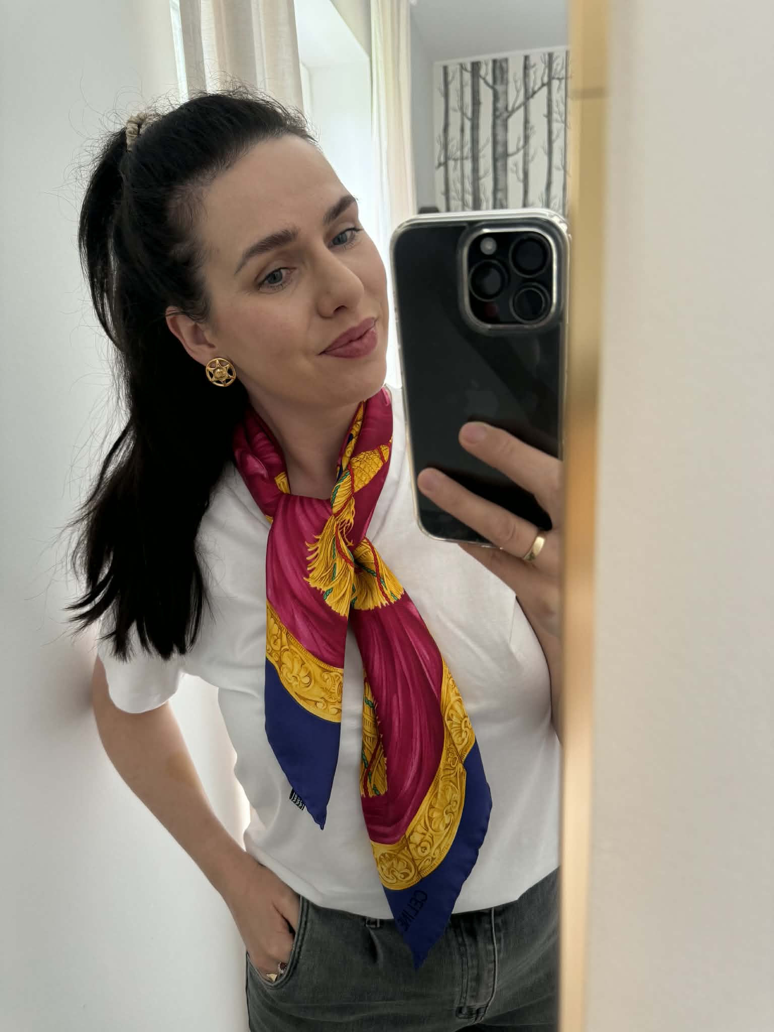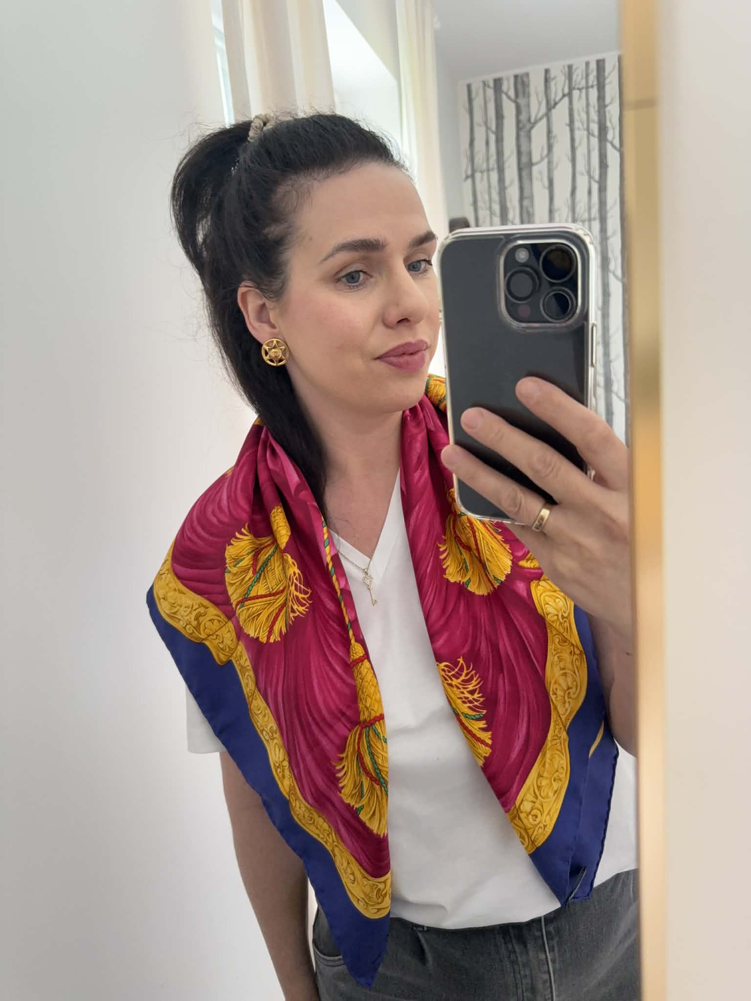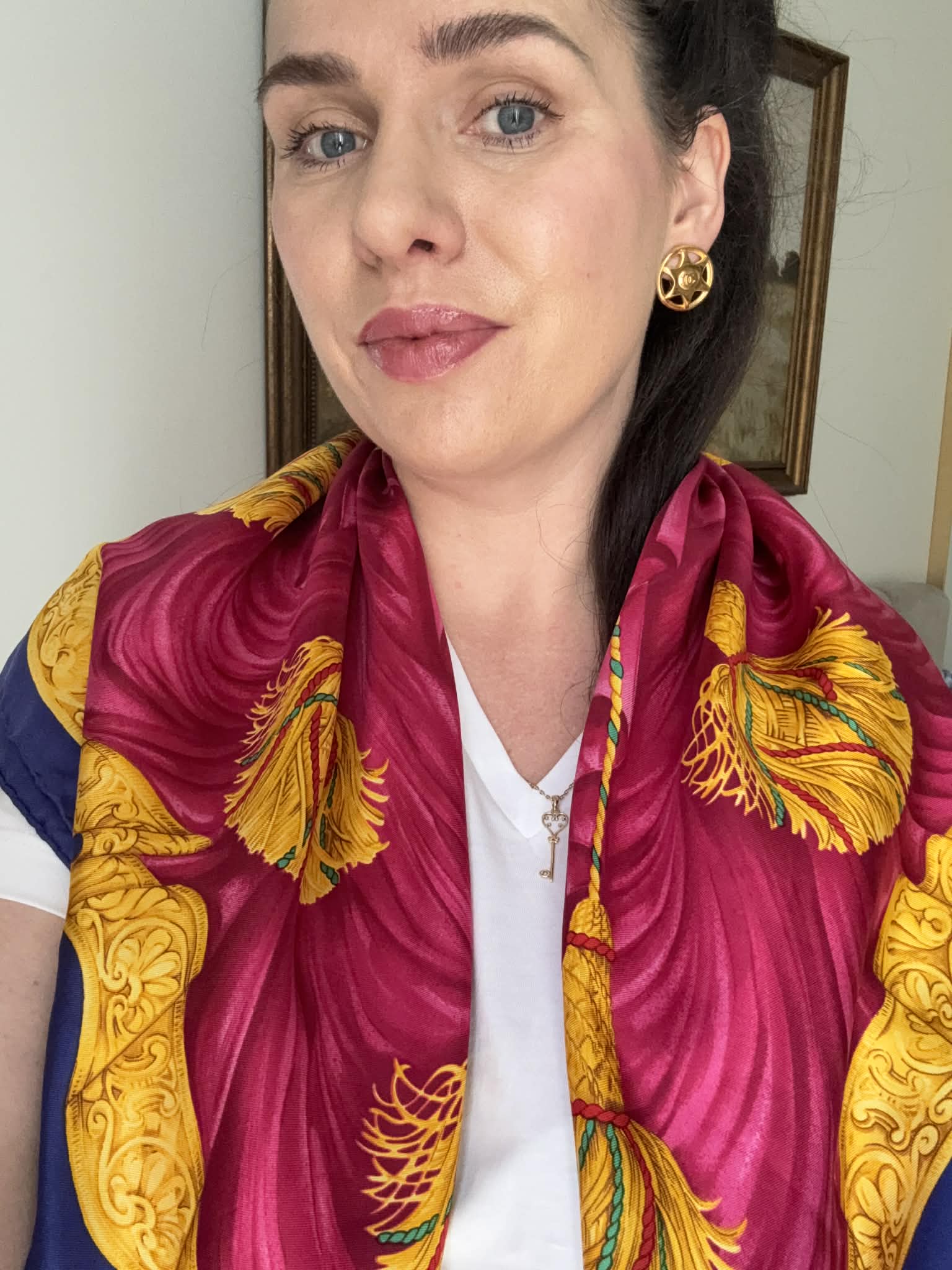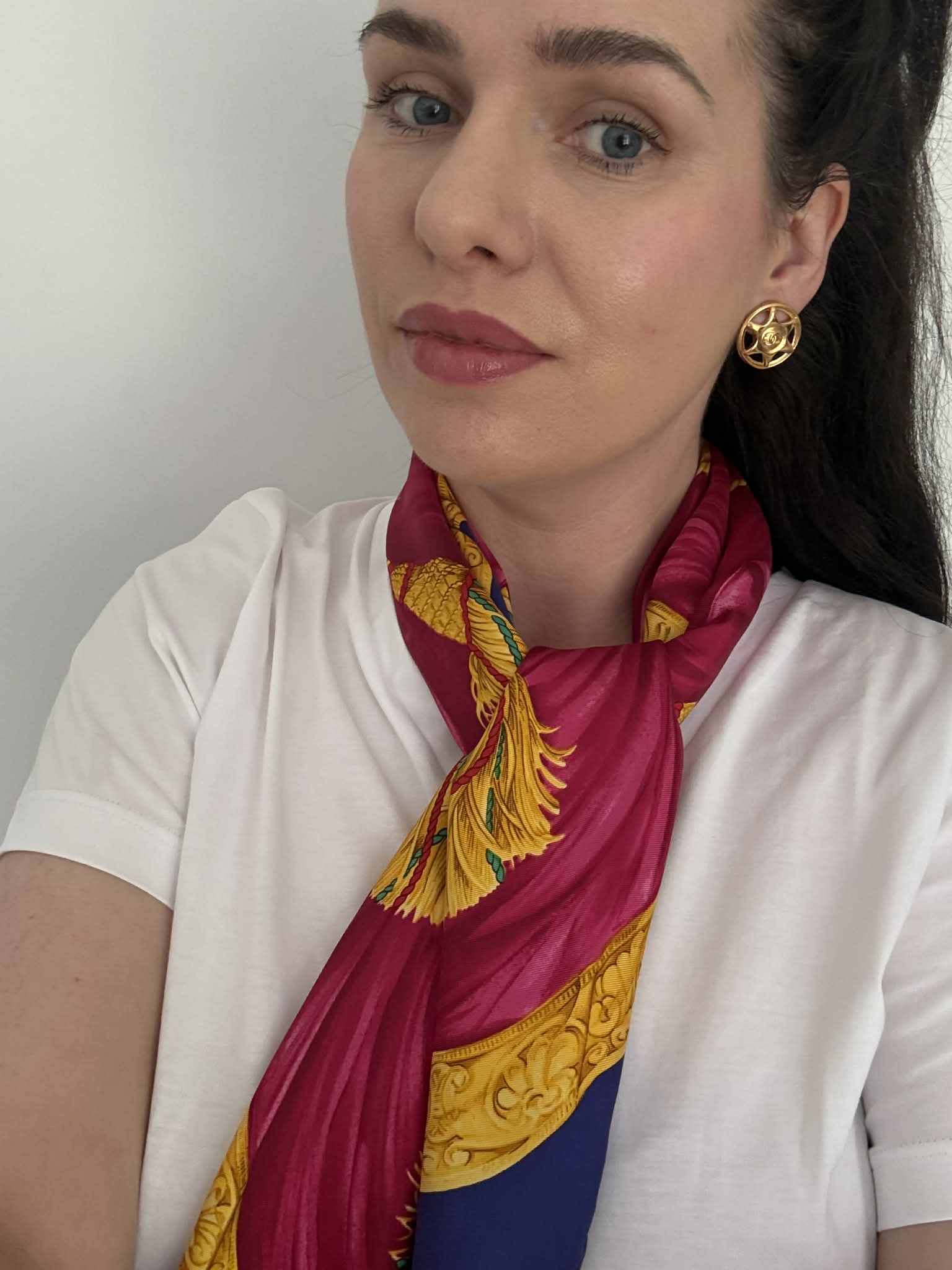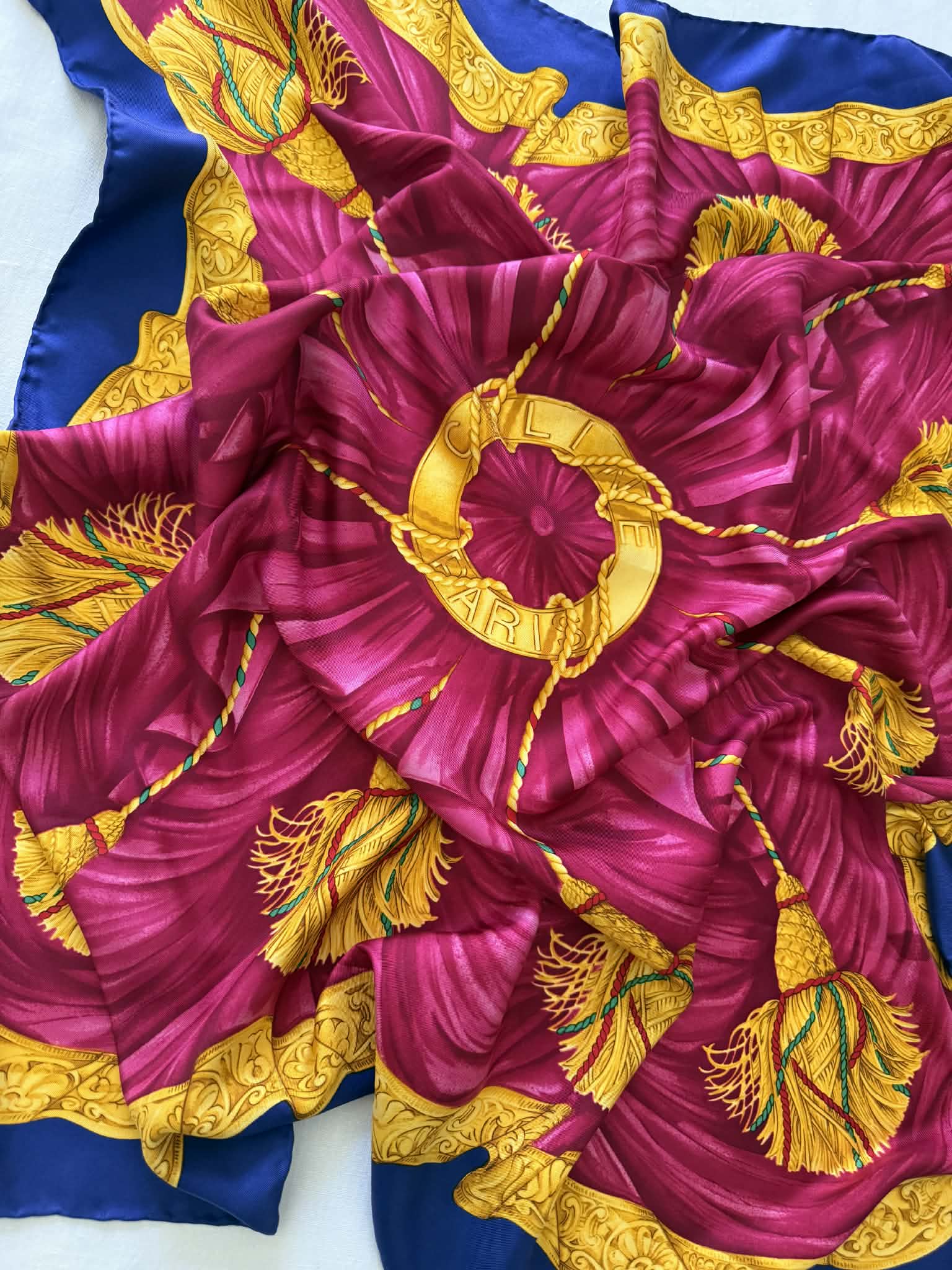 Ponadczasowy design, wyrazisty motyw triomphe/globusa i łuku trumfalnego sprawiają, że chusta prezentuje się wyjątkowo efektownie i stylowo. Produkt jest w bardzo dobrym stanie i posiada oryginalną metkę ze składem, co potwierdza jego autentyczność.