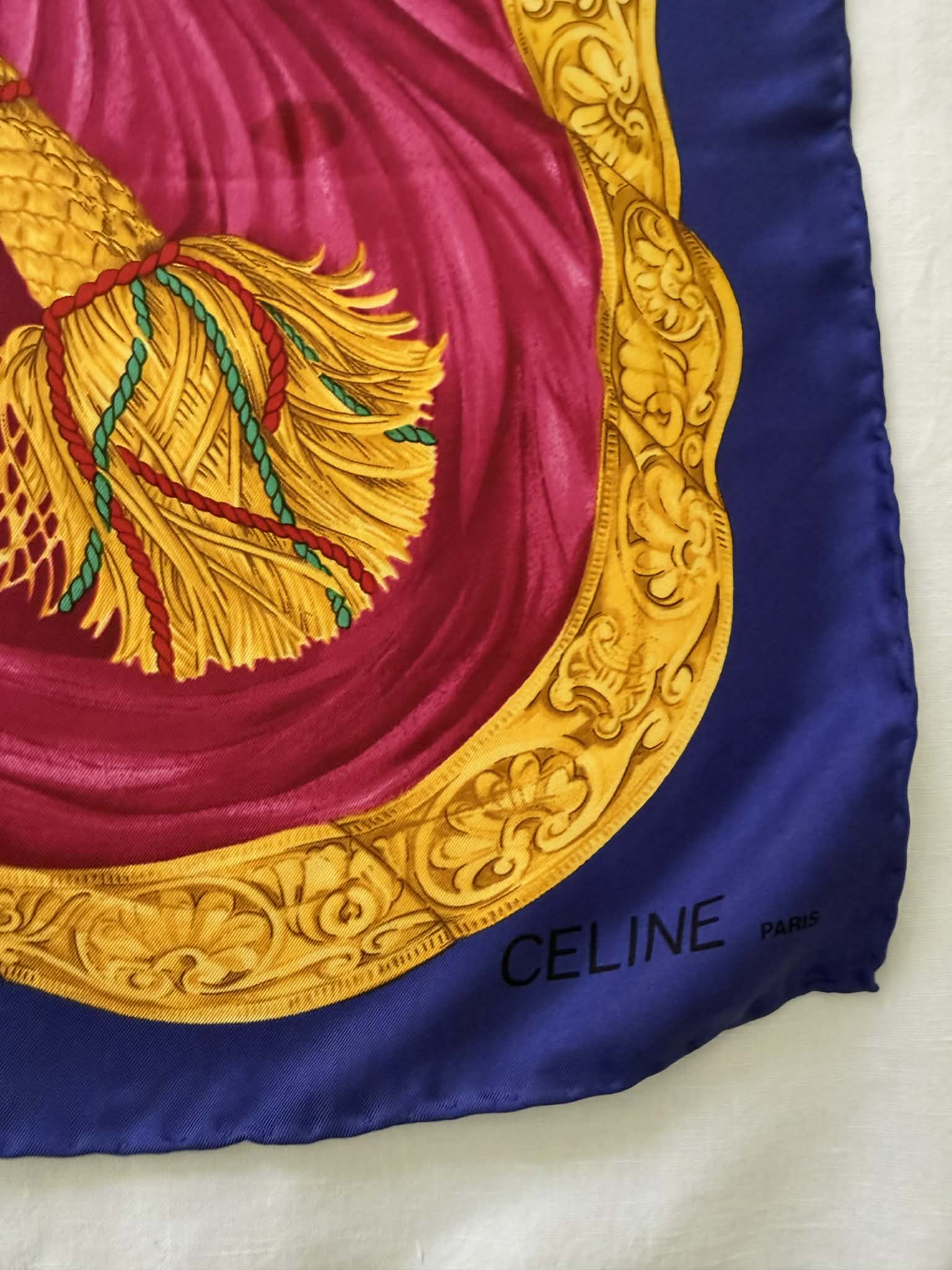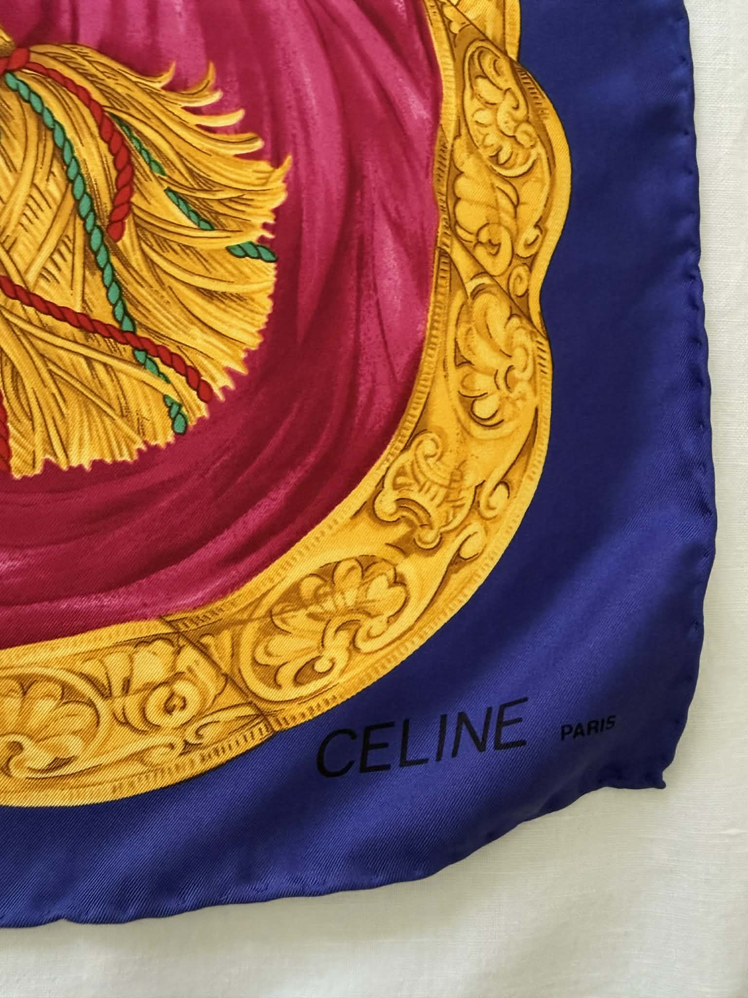 Model posiada ręcznie rolowane brzegi, świadczące o rzemieślniczej precyzji i jakości typowej dla francuskiego domu mody Celine. Dzięki dużemu formatowi chusta może być stylizowana na wiele sposobów — noszona na szyi, we włosach, jako ozdoba torebki lub eleganckie okrycie na ramiona.