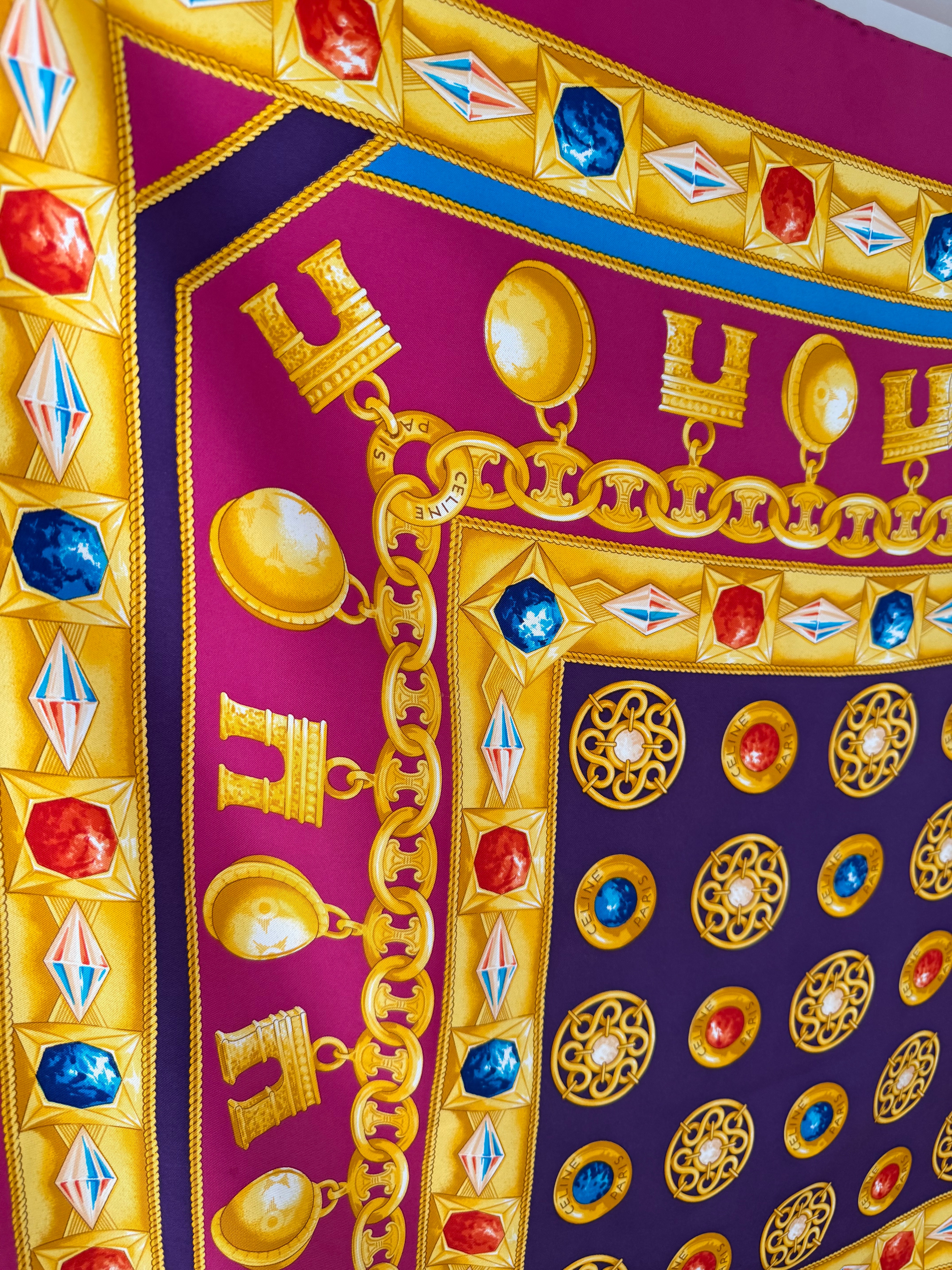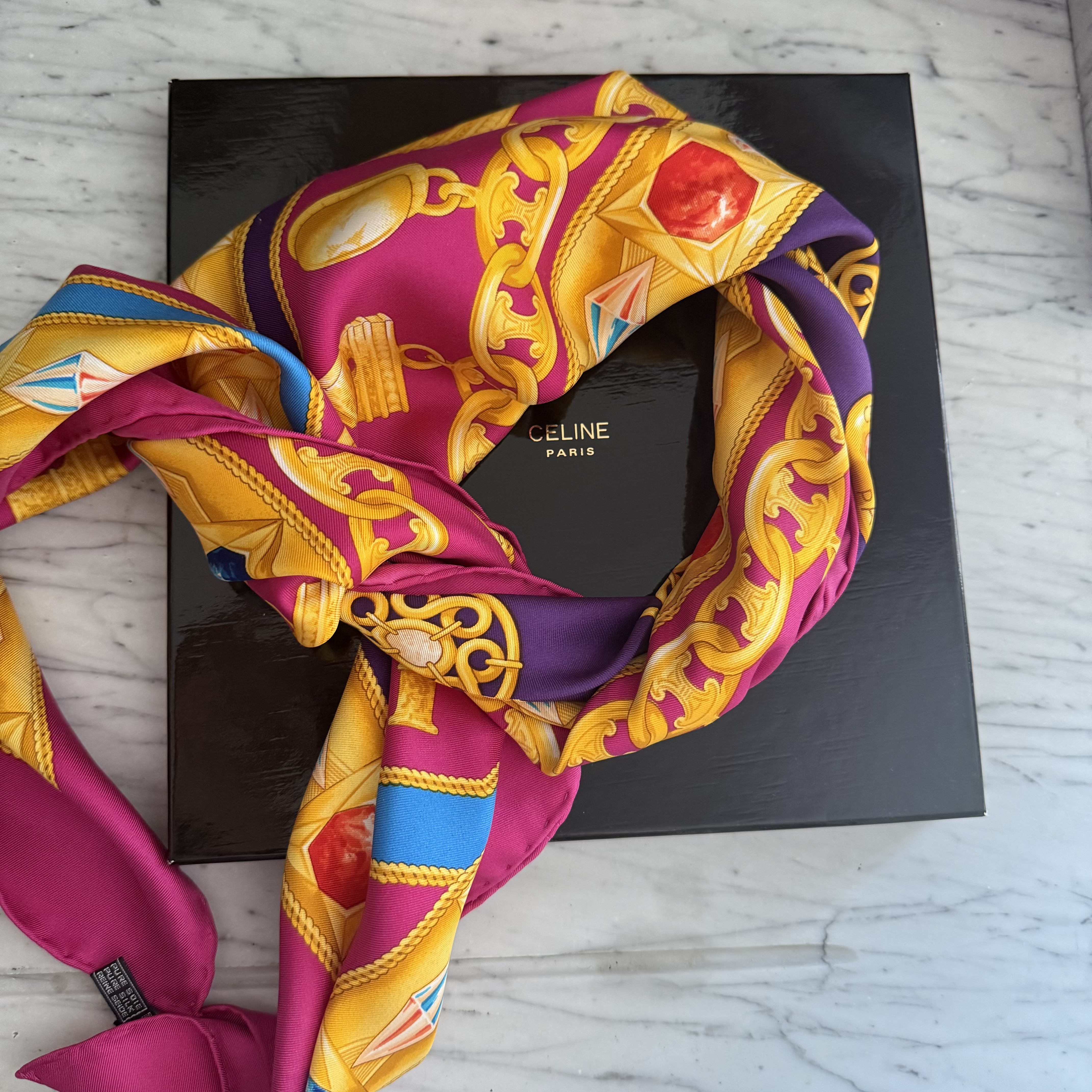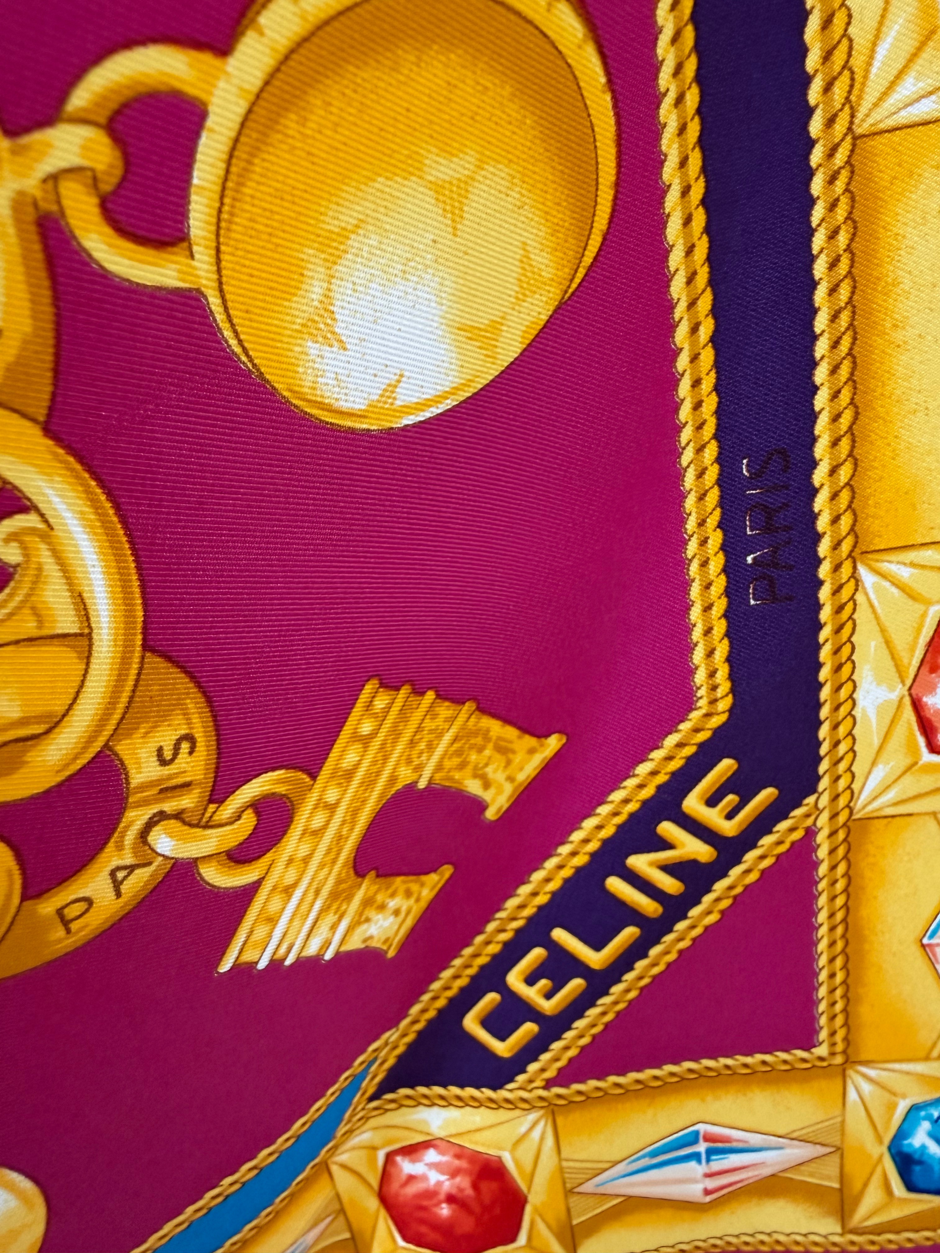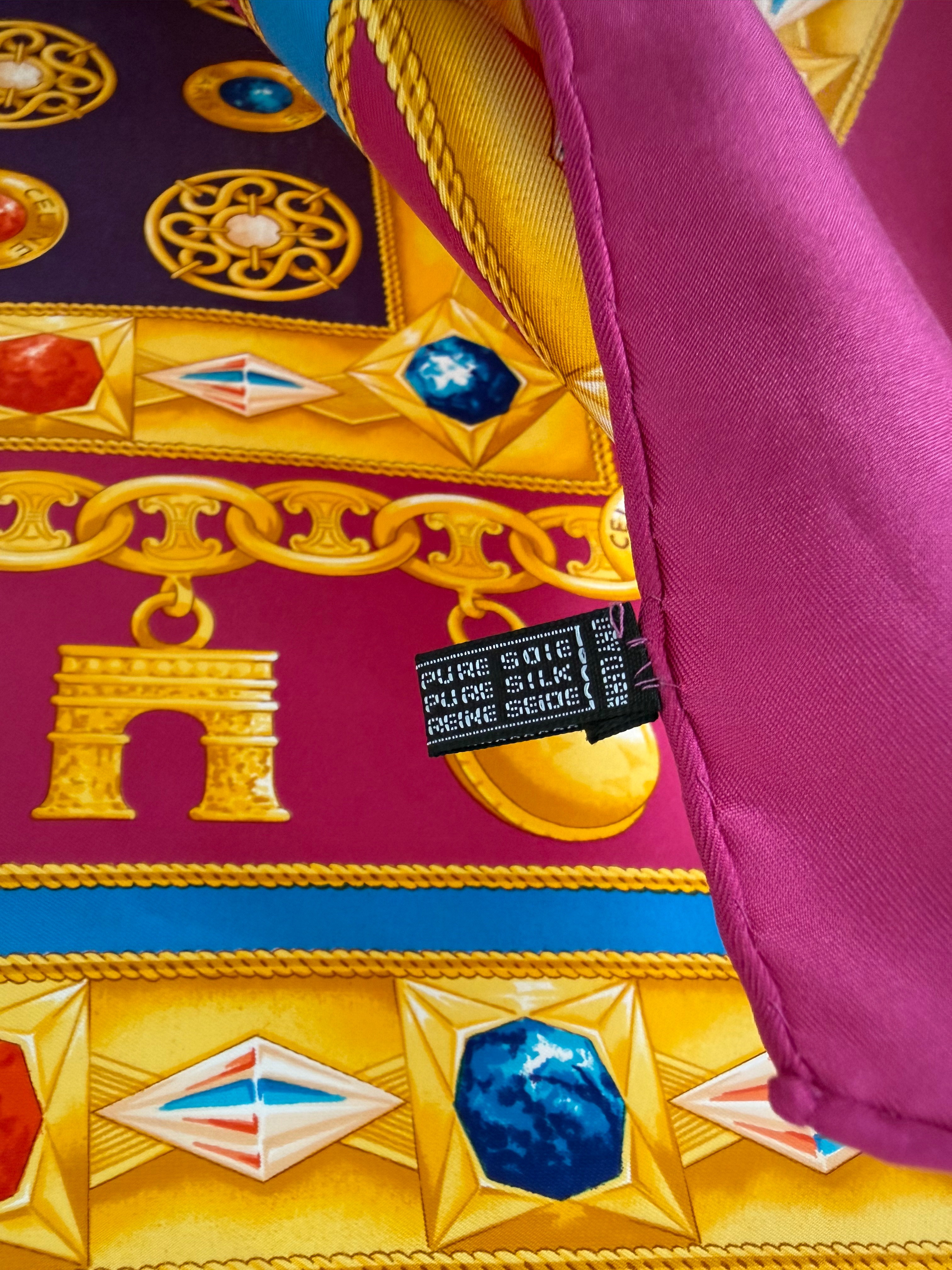 Elegancka jedwabna chusta marki Celine z charakterystycznym motywem łańcucha z biżuterią we wzór logo marki, utrzymana w szlachetnej kolorystyce różu, fioletu, żółci i niebieskiego. Wykonana w 100% z wysokogatunkowego, mięsistego jedwabiu, który pięknie się układa i podkreśla luksusowy charakter dodatku.