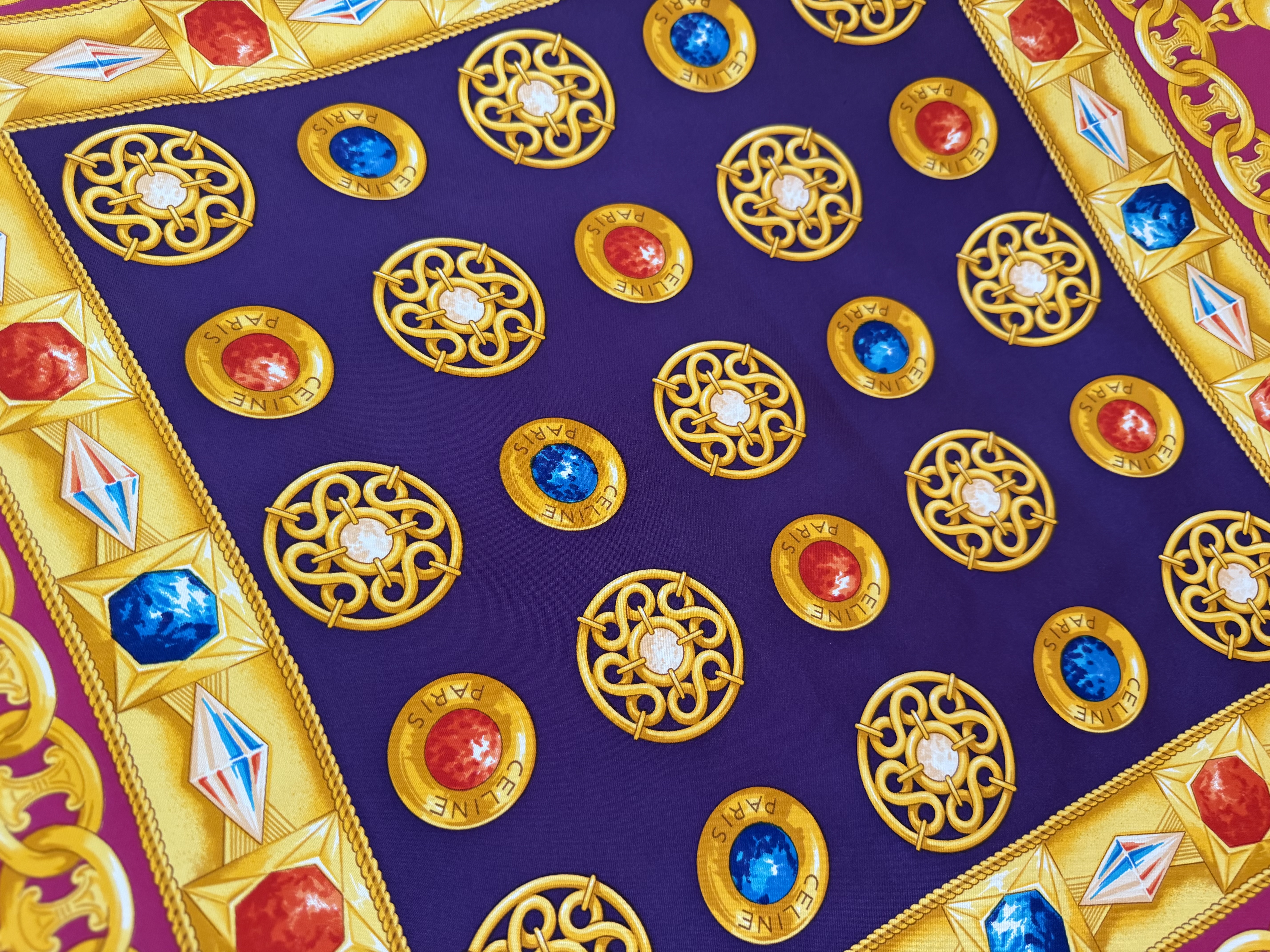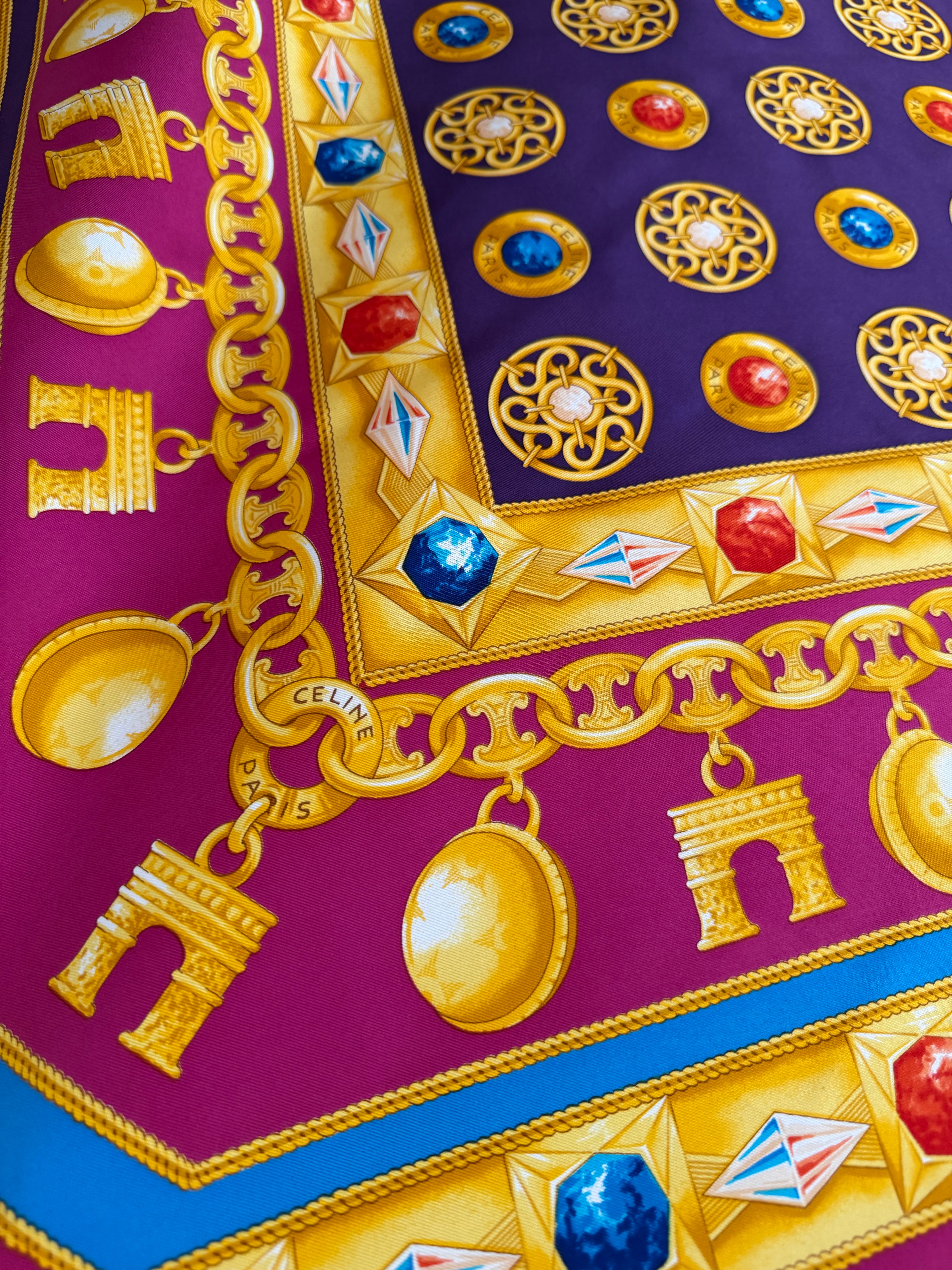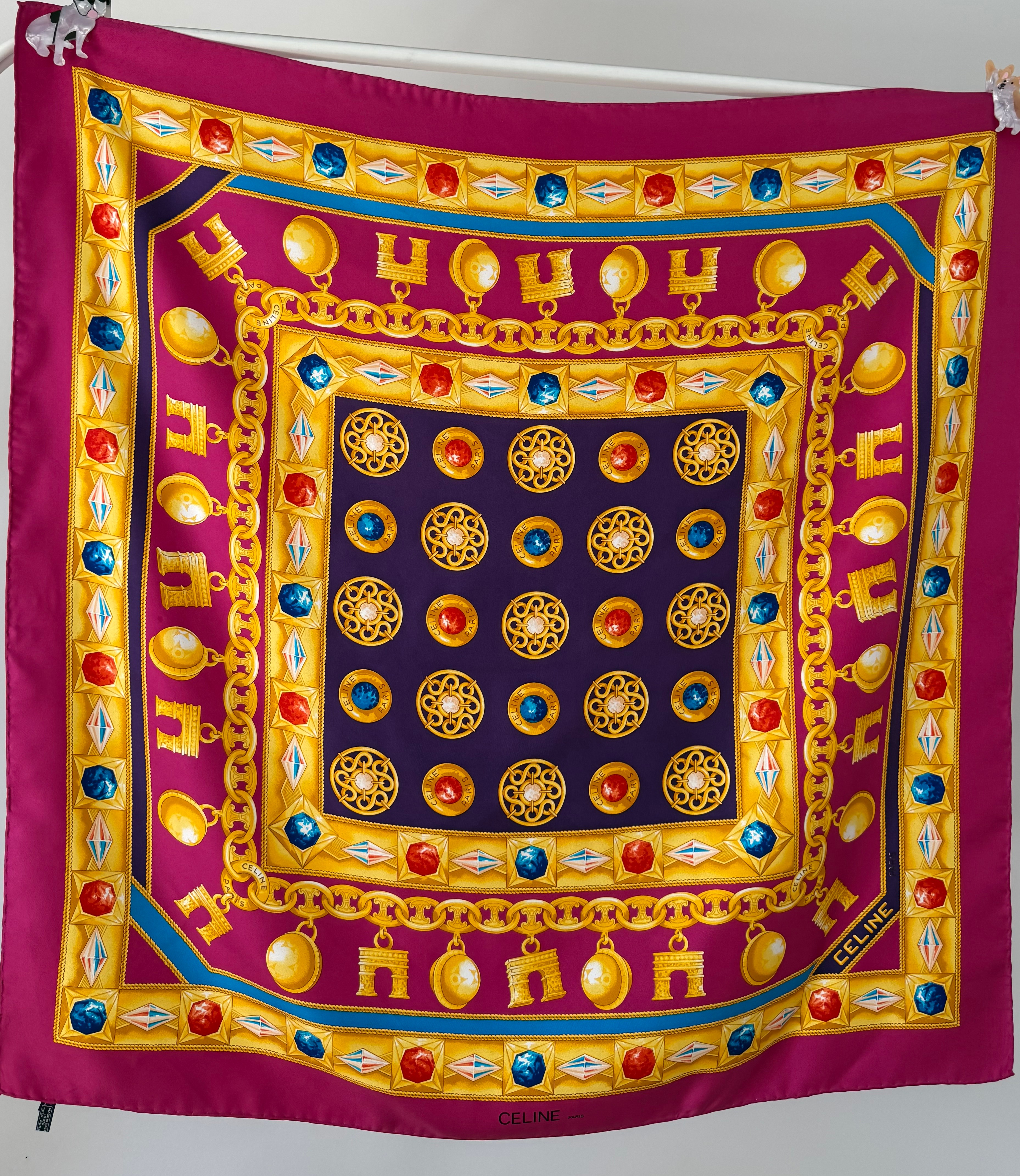 Elegancka jedwabna chusta marki Celine z charakterystycznym motywem łańcucha z biżuterią we wzór logo marki, utrzymana w szlachetnej kolorystyce różu, fioletu, żółci i niebieskiego. Wykonana w 100% z wysokogatunkowego, mięsistego jedwabiu, który pięknie się układa i podkreśla luksusowy charakter dodatku.