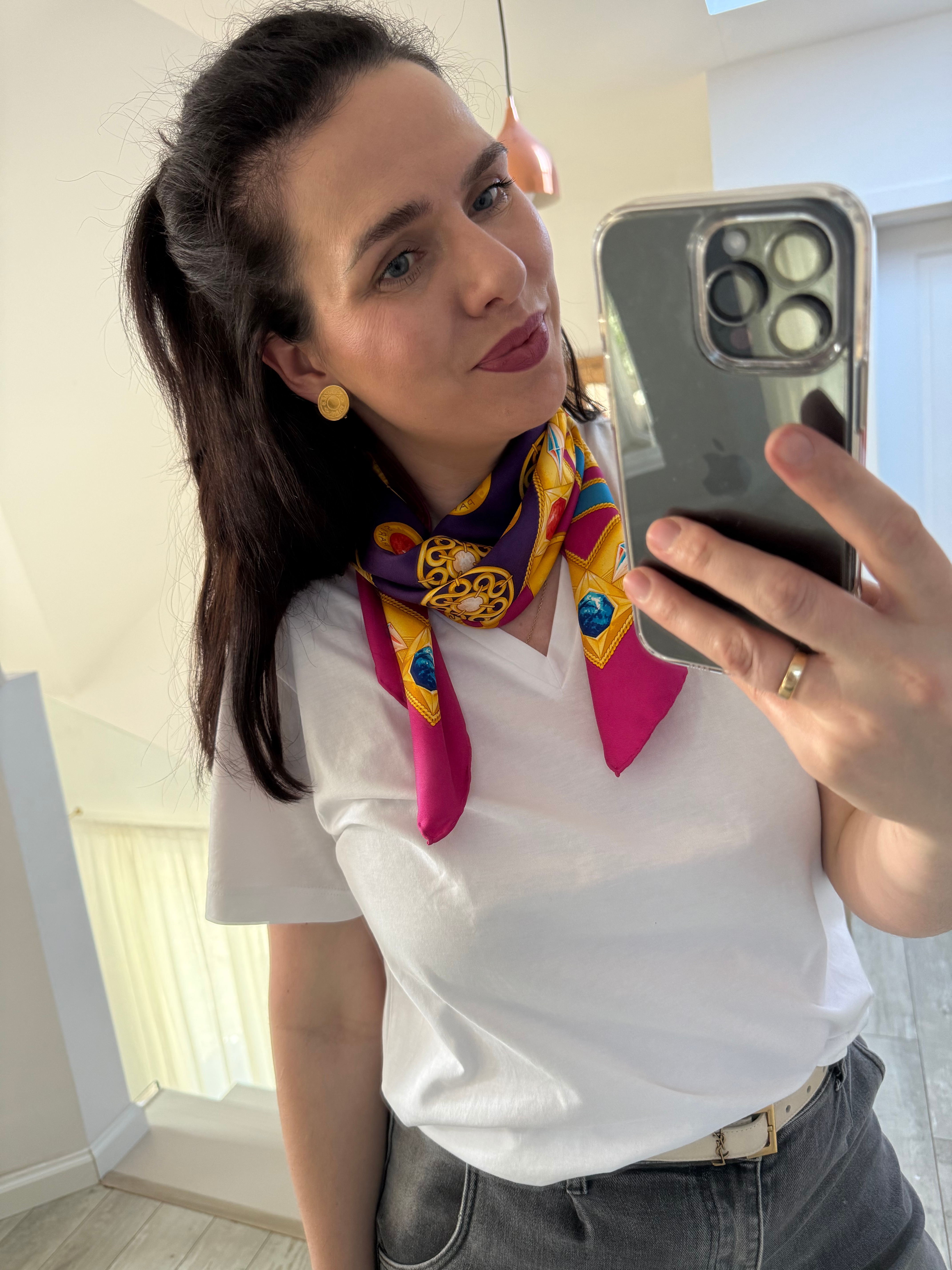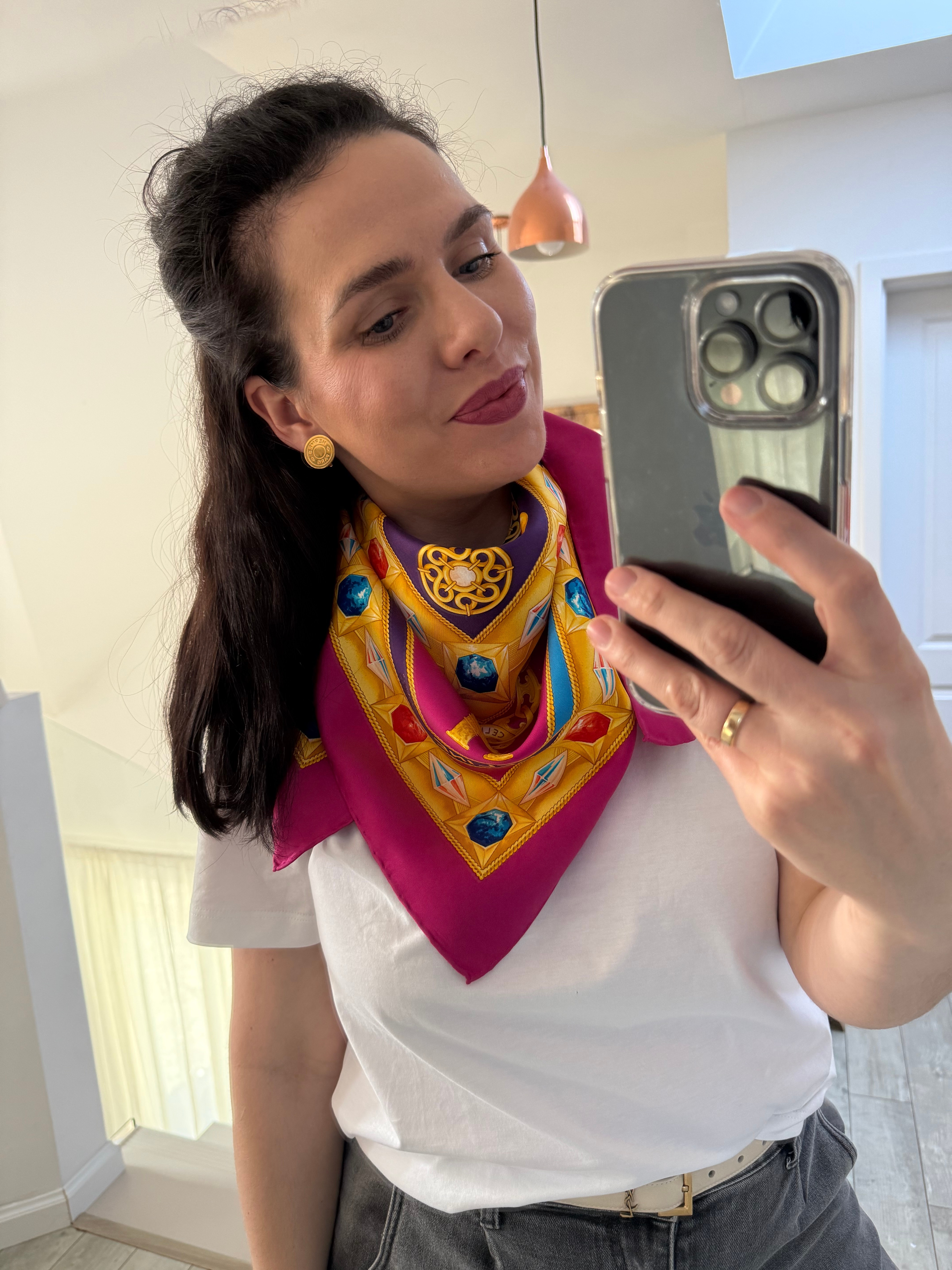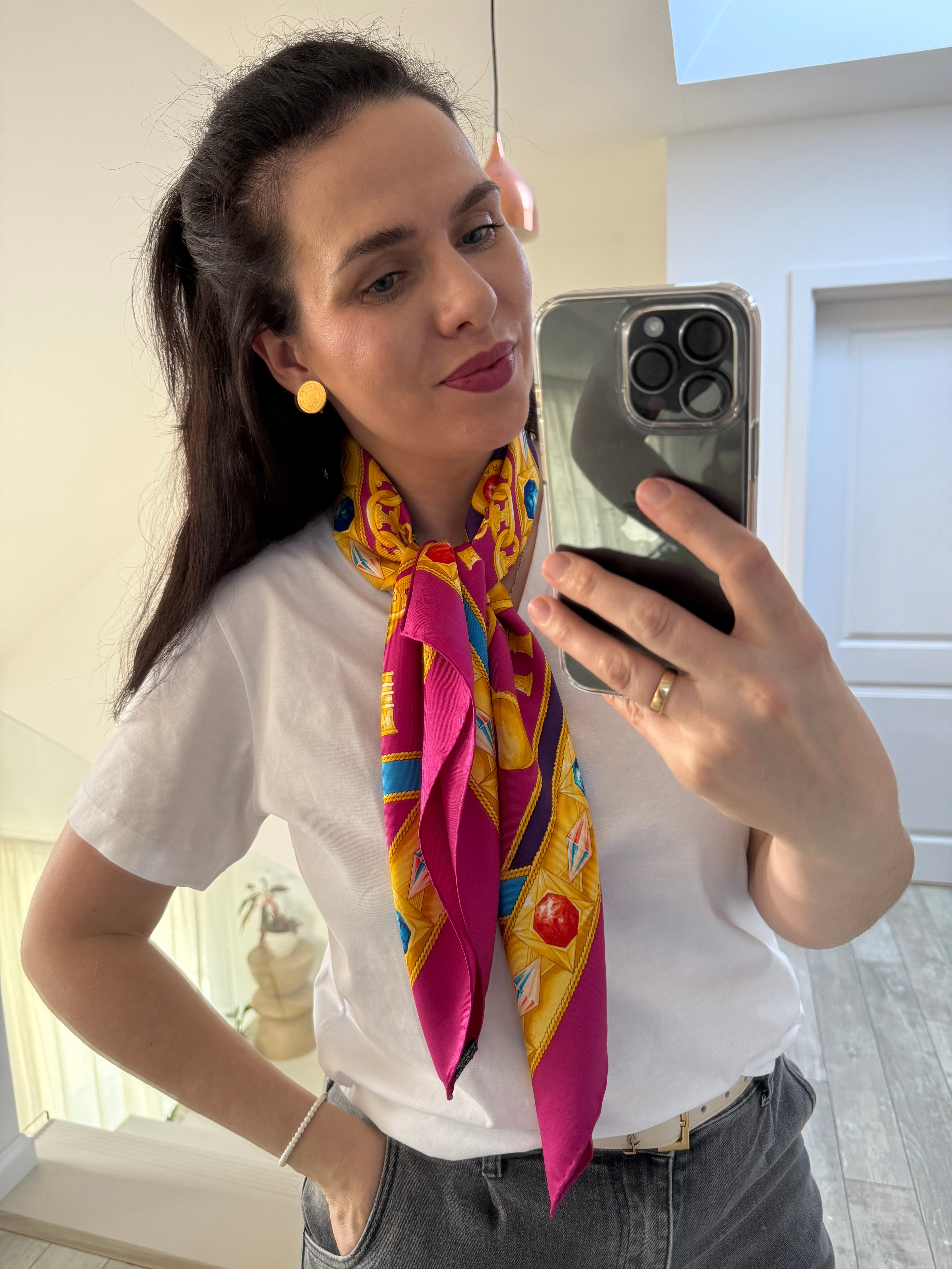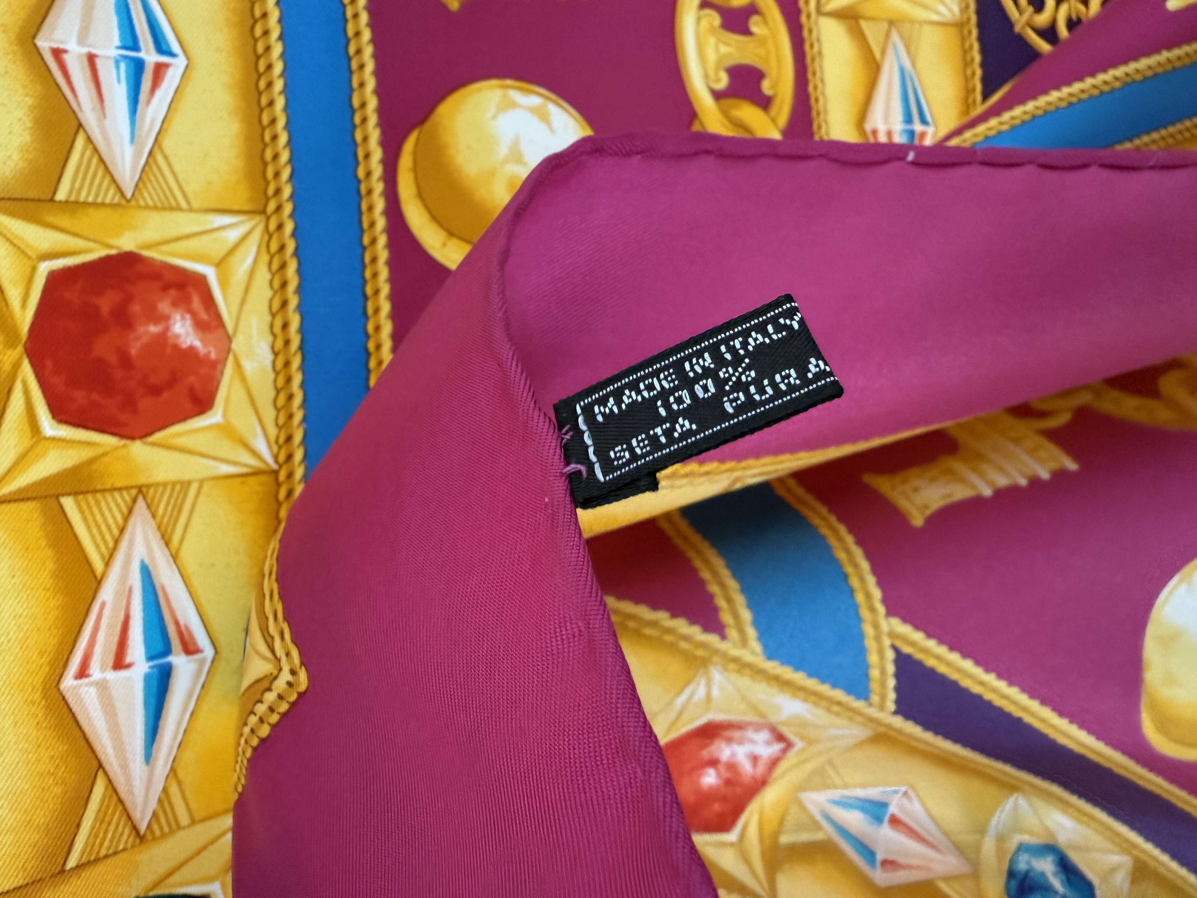 Elegancka jedwabna chusta marki Celine z charakterystycznym motywem łańcucha z biżuterią we wzór logo marki, utrzymana w szlachetnej kolorystyce różu, fioletu, żółci i niebieskiego. Wykonana w 100% z wysokogatunkowego, mięsistego jedwabiu, który pięknie się układa i podkreśla luksusowy charakter dodatku.