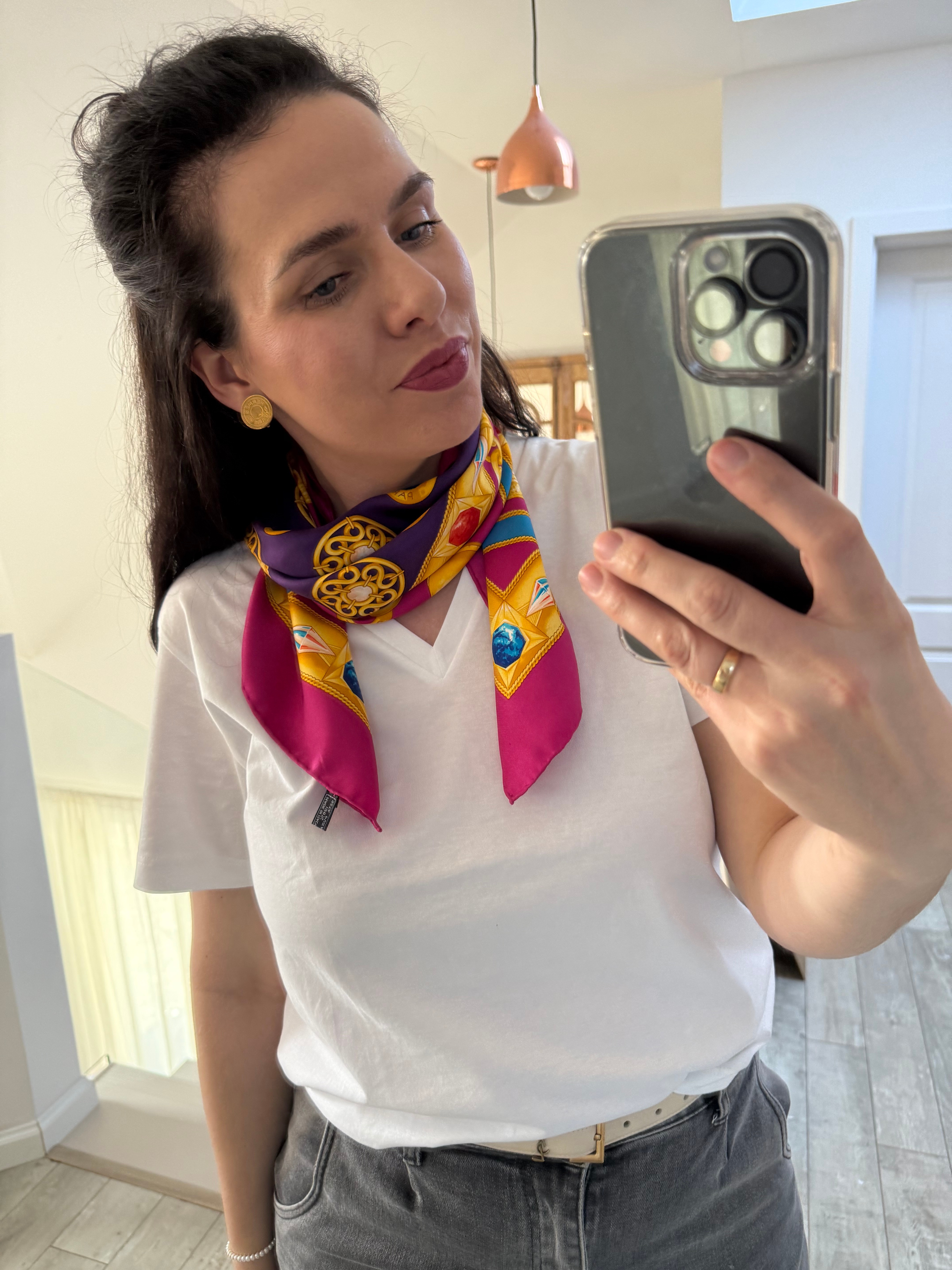 Ponadczasowy design, wyrazisty motyw triomphe/globusa i łuku trumfalnego sprawiają, że chusta prezentuje się wyjątkowo efektownie i stylowo. Produkt jest w bardzo dobrym stanie i posiada oryginalną metkę ze składem, co potwierdza jego autentyczność.