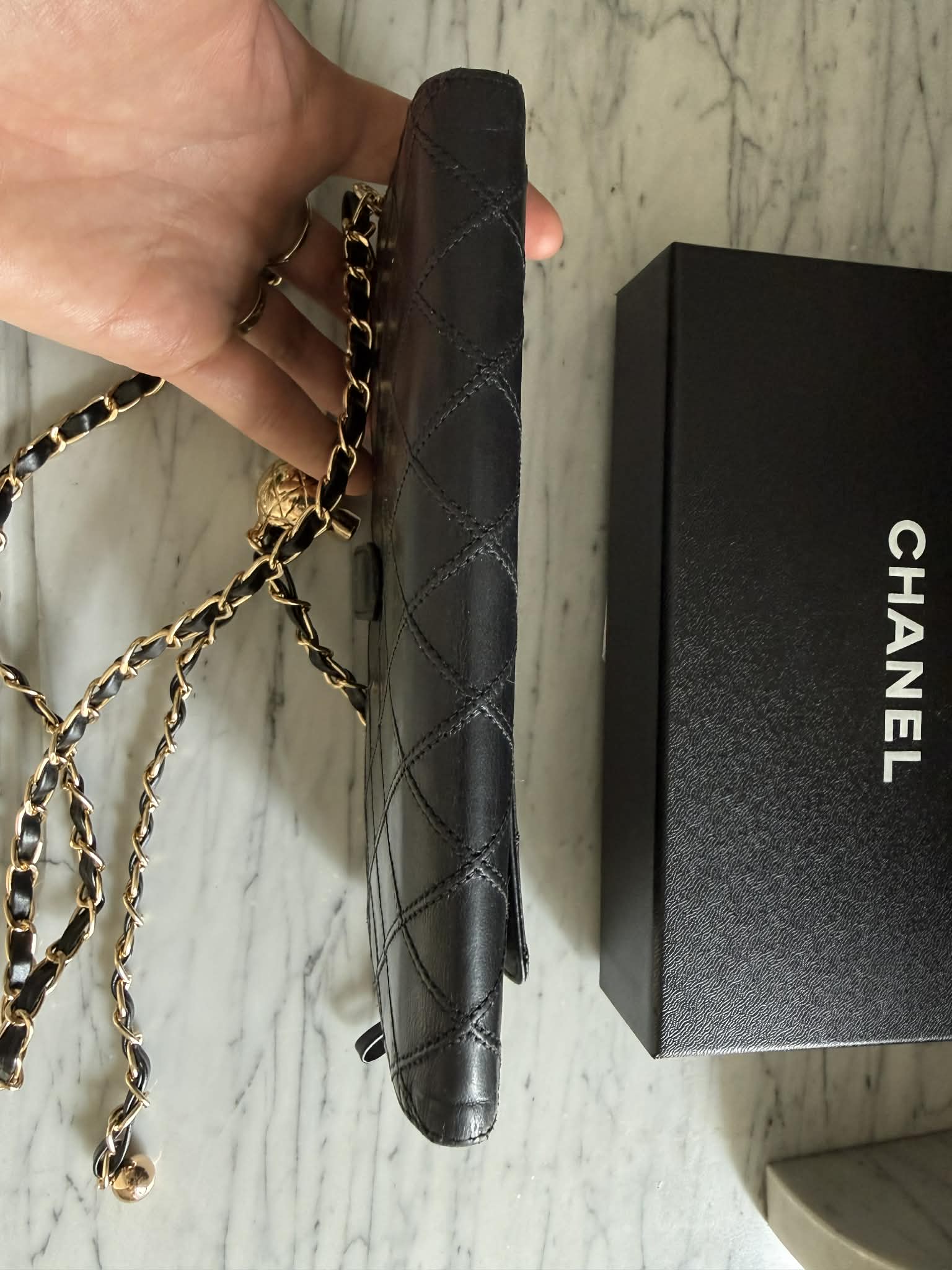 Dzięki specjalnej wkładce portfel można nosić również jako małą torebkę – idealną na szybkie wyjścia po mieście (pomieści m.in. telefon bez etui). Dołączony łańcuszek oraz wkładka nie są produktem marki Chanel, ale zwiększają funkcjonalność modelu.