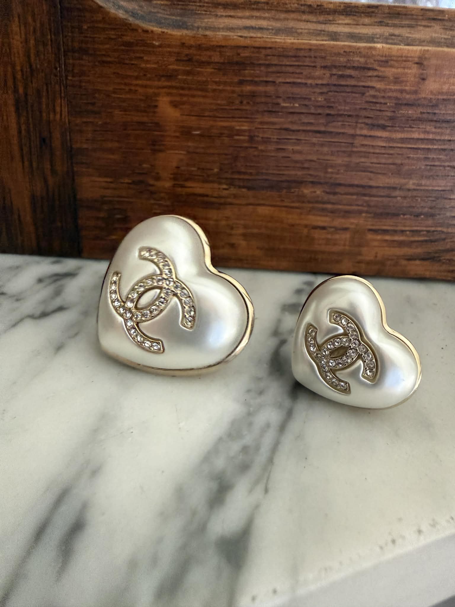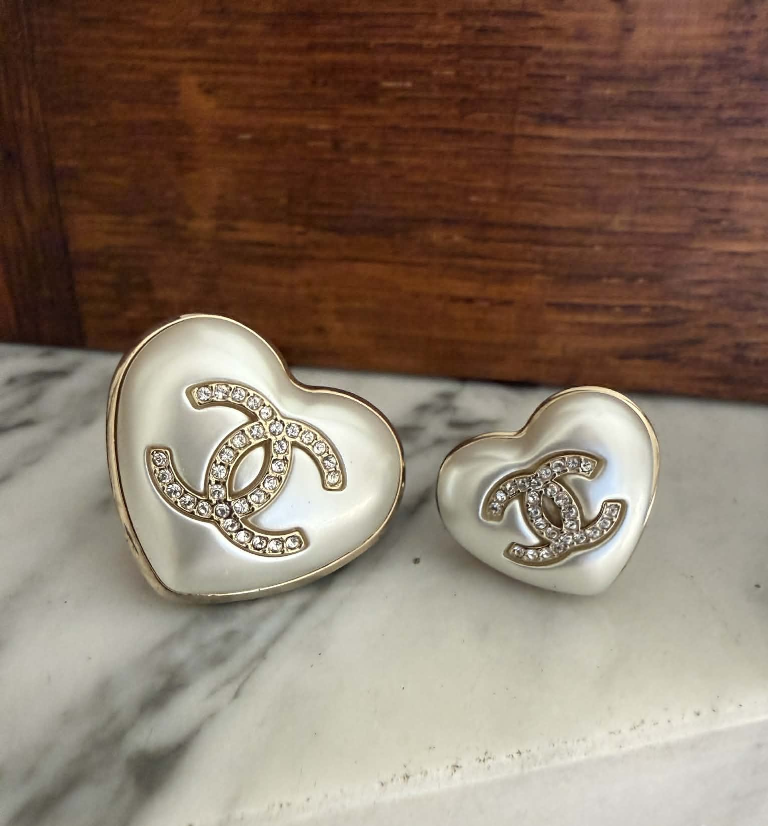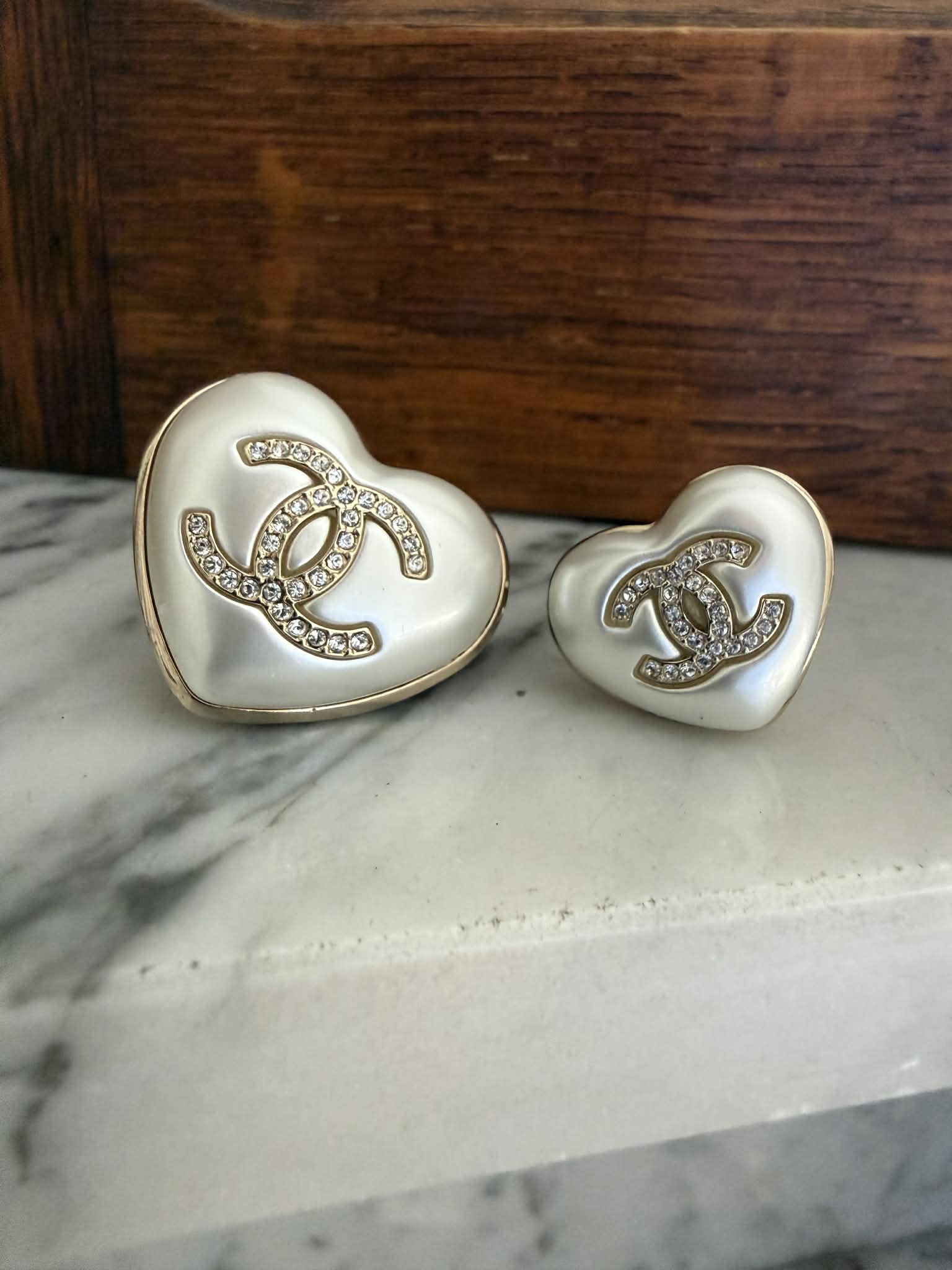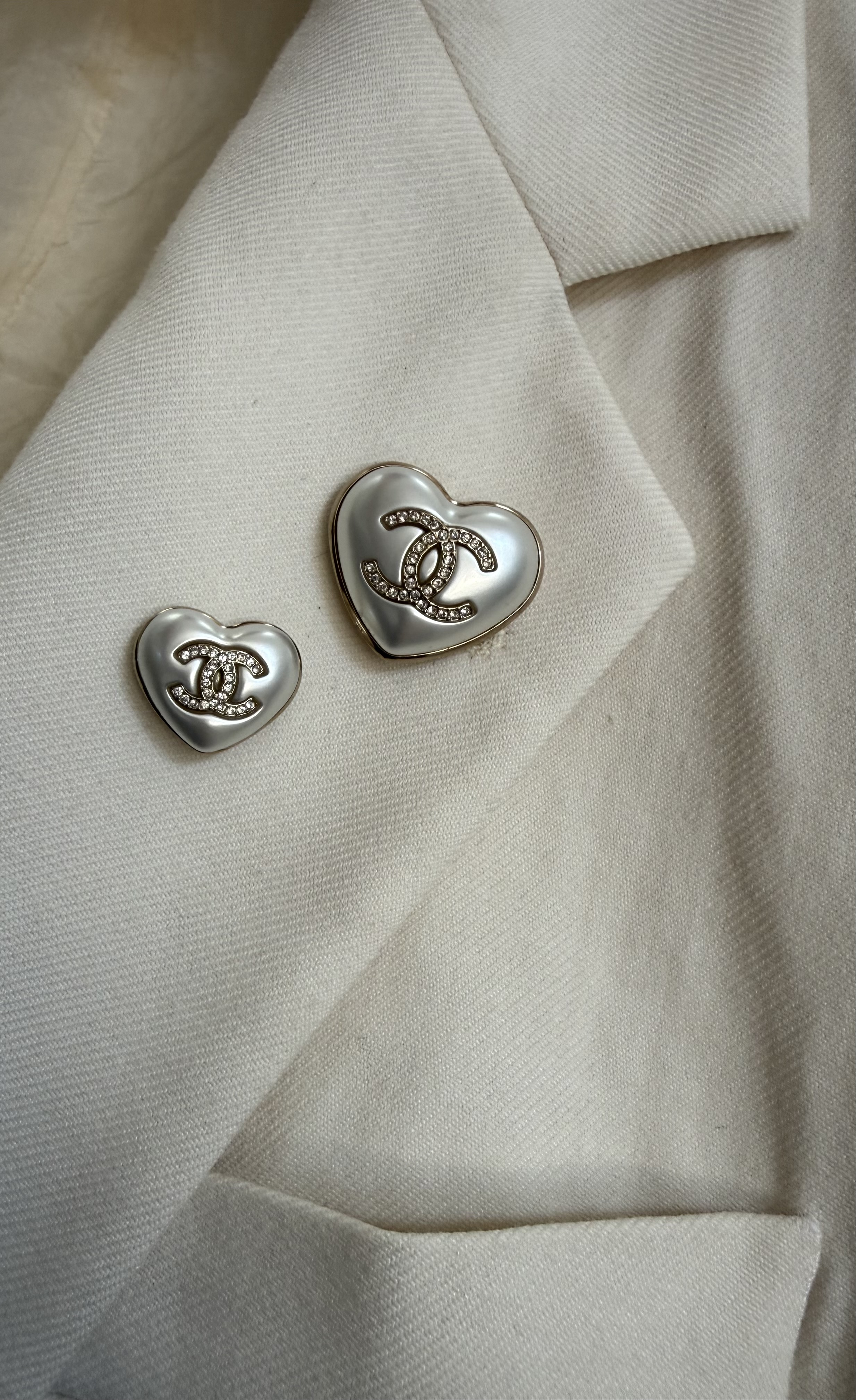 Zestaw dwóch broszek Chanel w kształcie serca to elegancki komplet biżuterii inspirowany ponadczasową estetyką domu mody Chanel. Charakterystyczne logo CC w kolorze złotym połączone z perłowym wykończeniem tworzy klasyczny i rozpoznawalny design.
