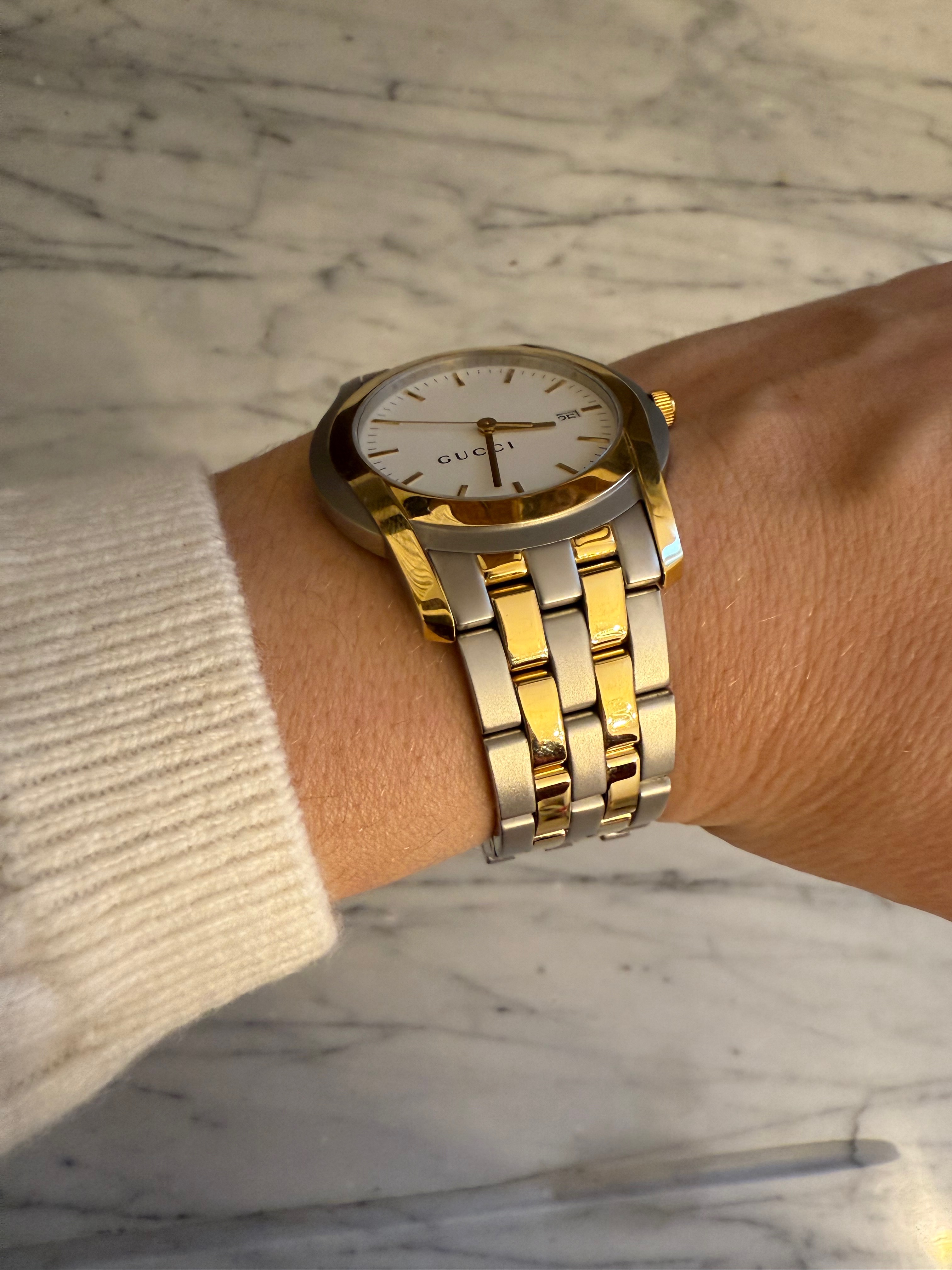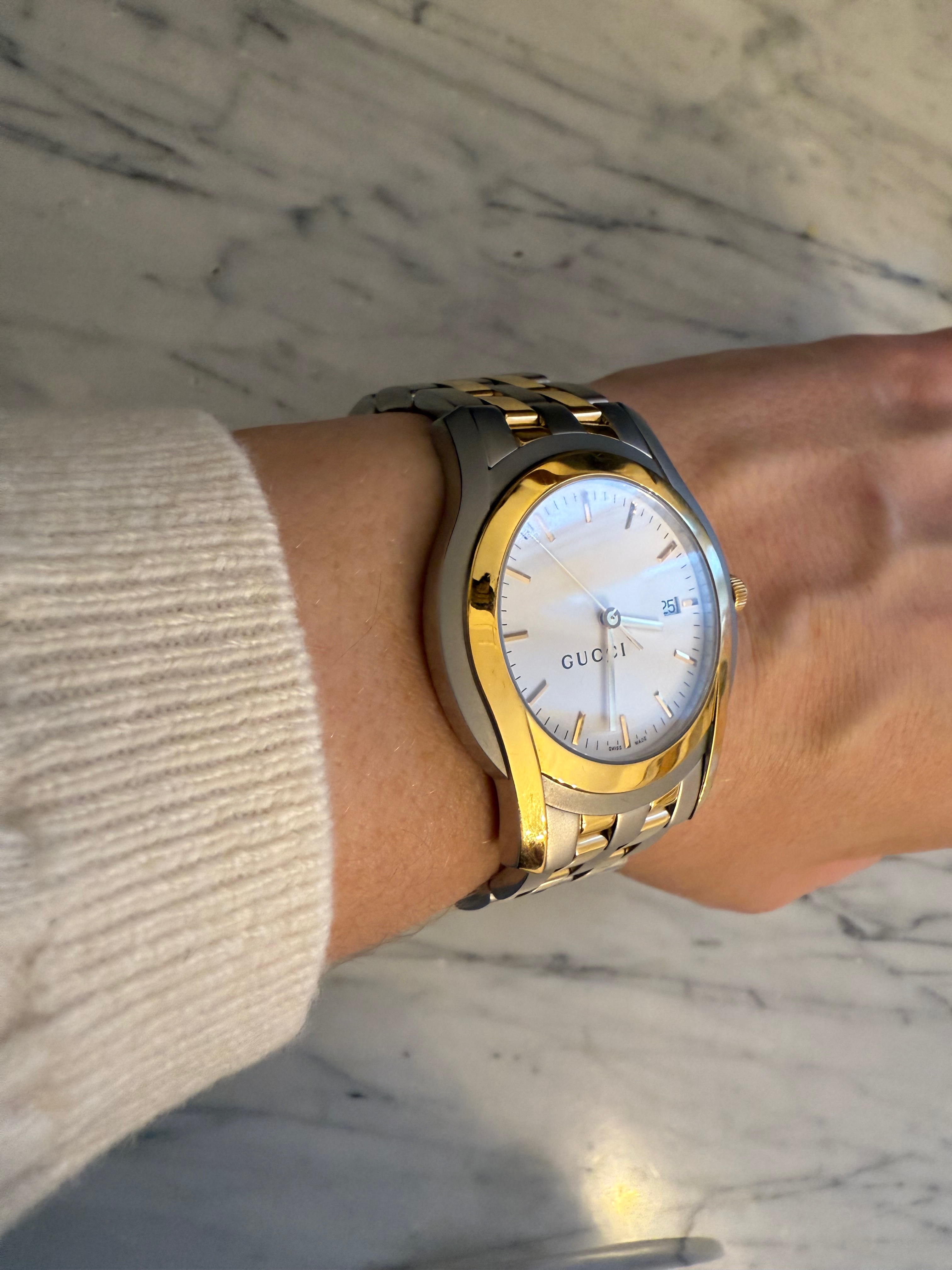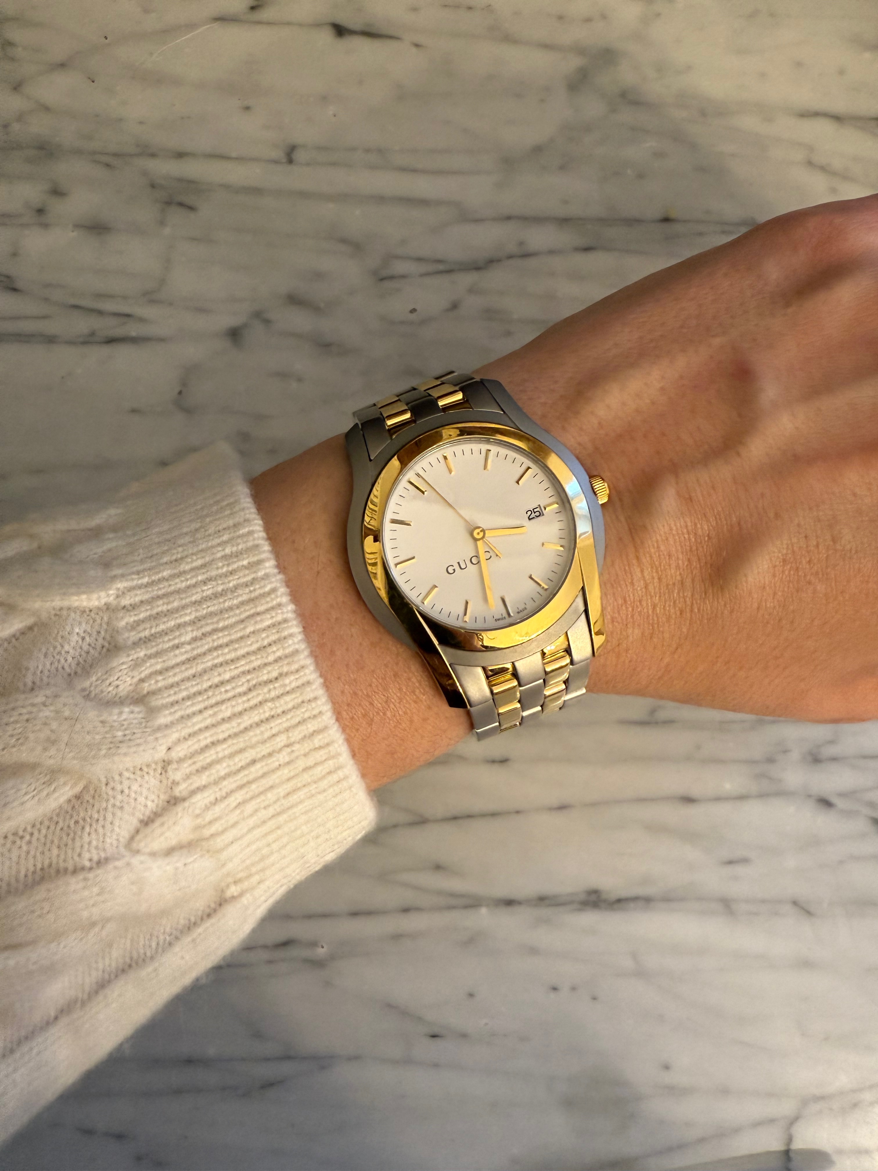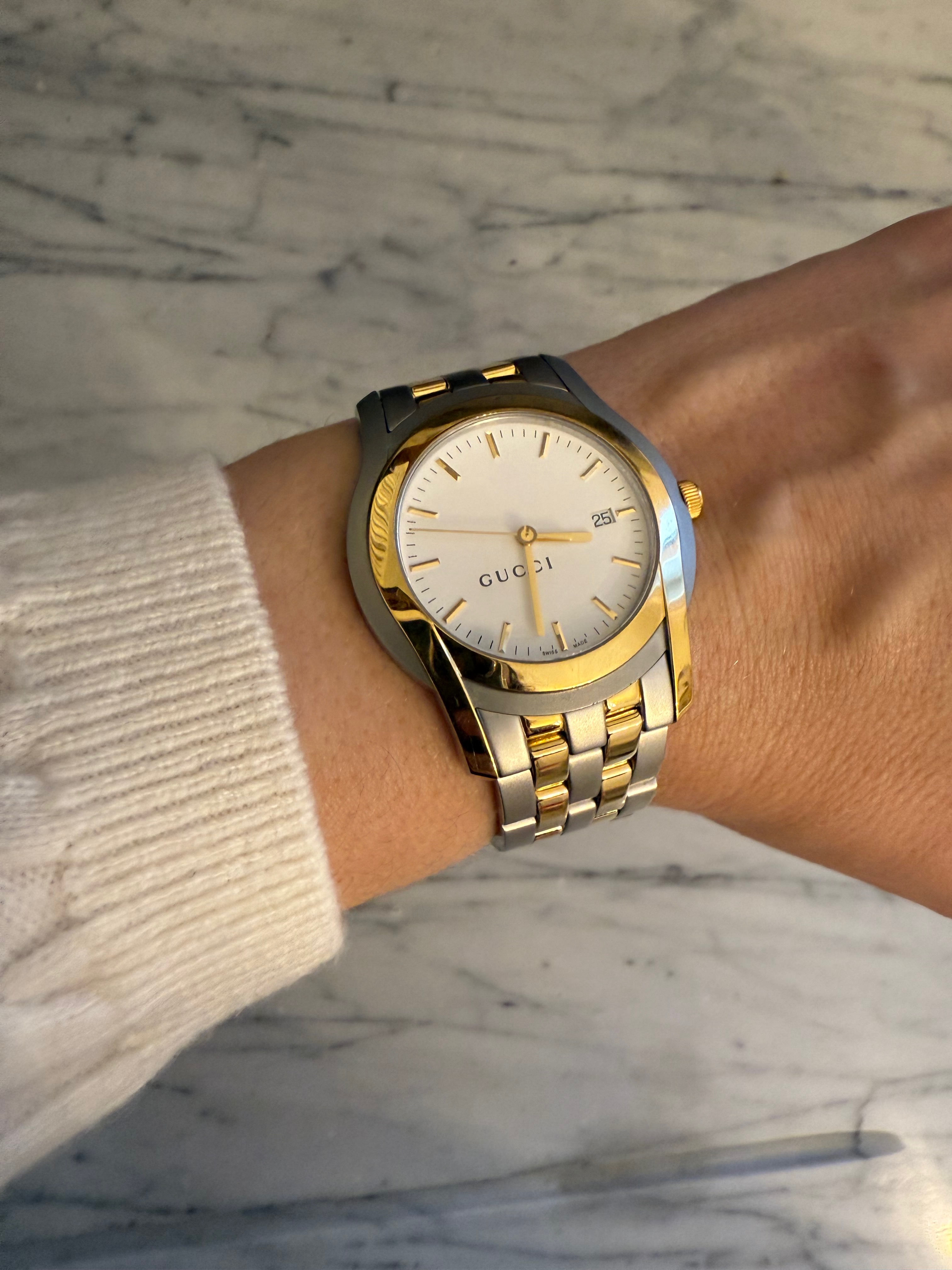 GUCCI szwajcarski zegarek męski, koperta 40mm, oryginalny na złoto-srebrnej bransolecie + pudełko