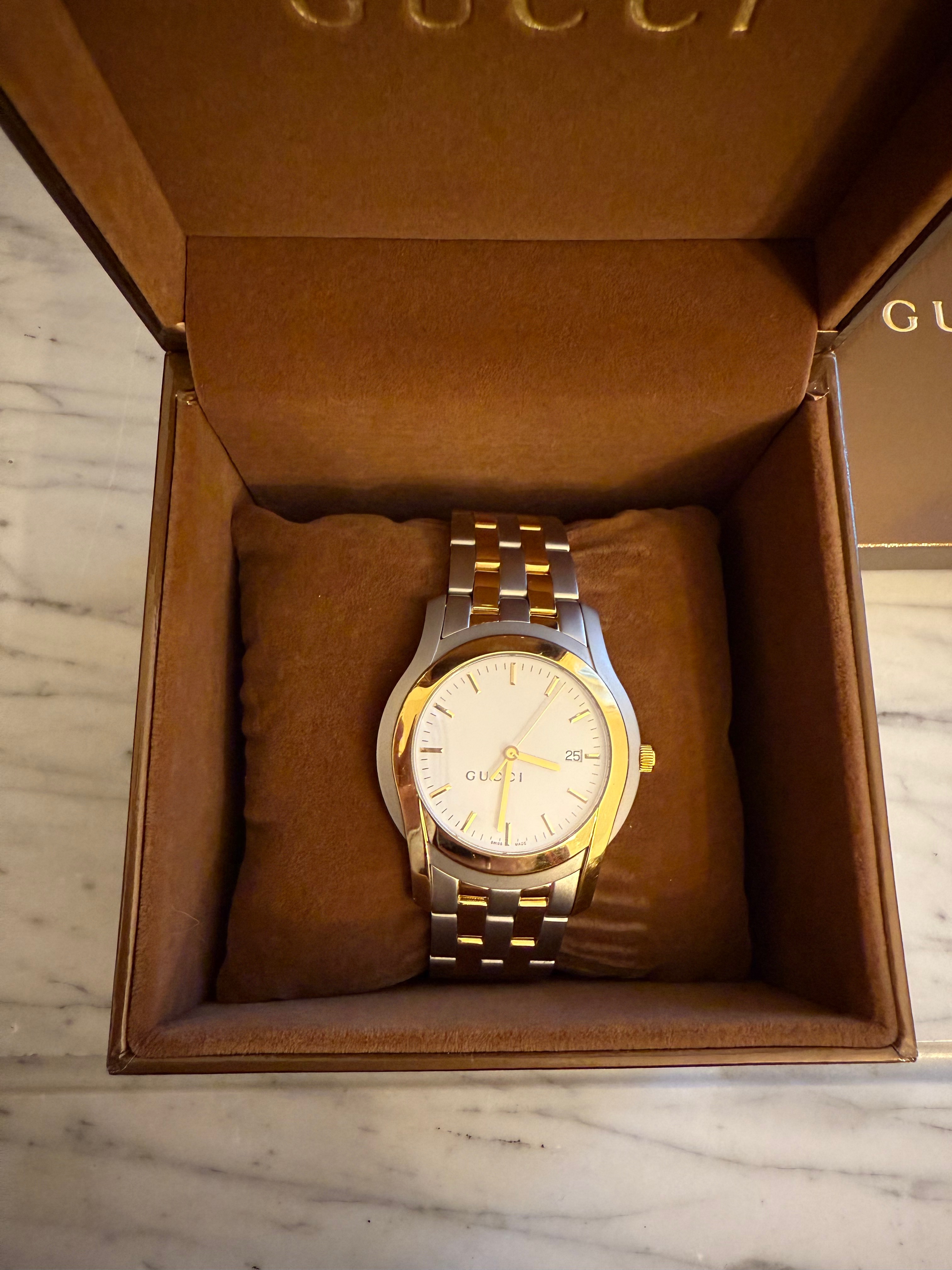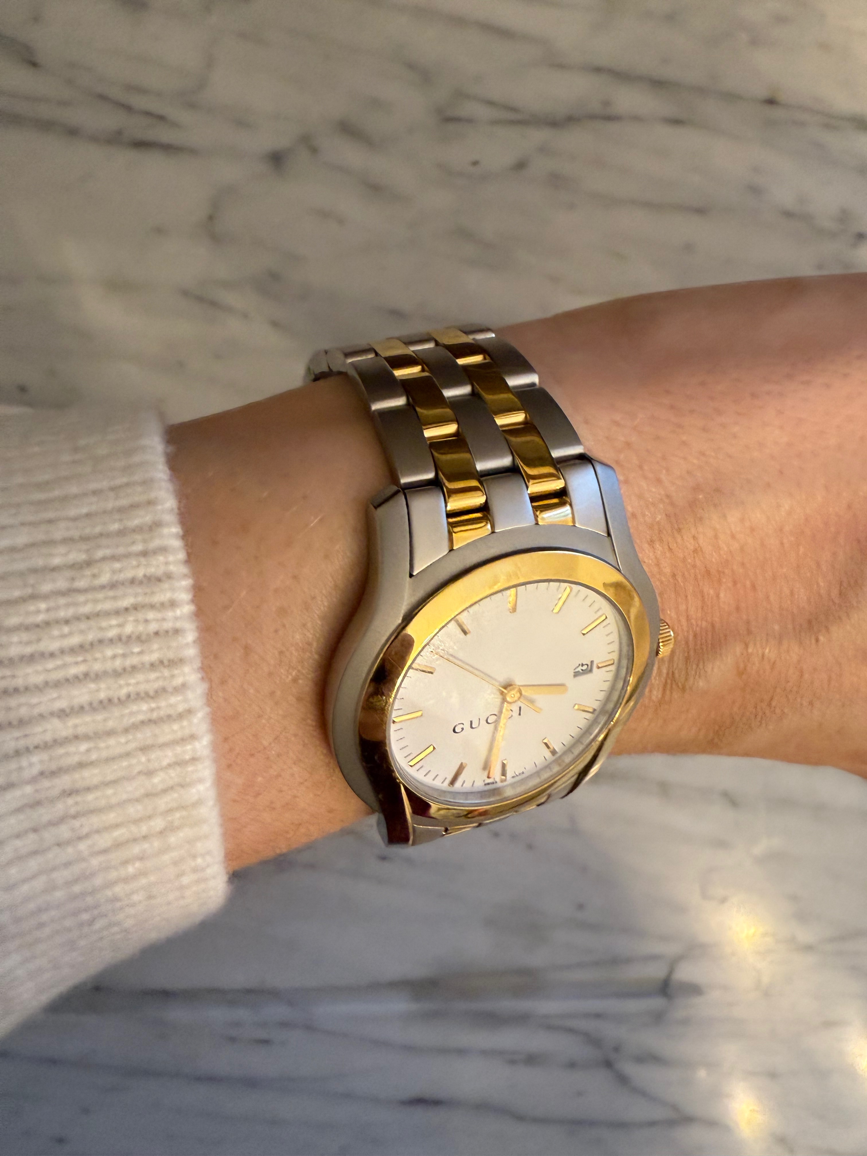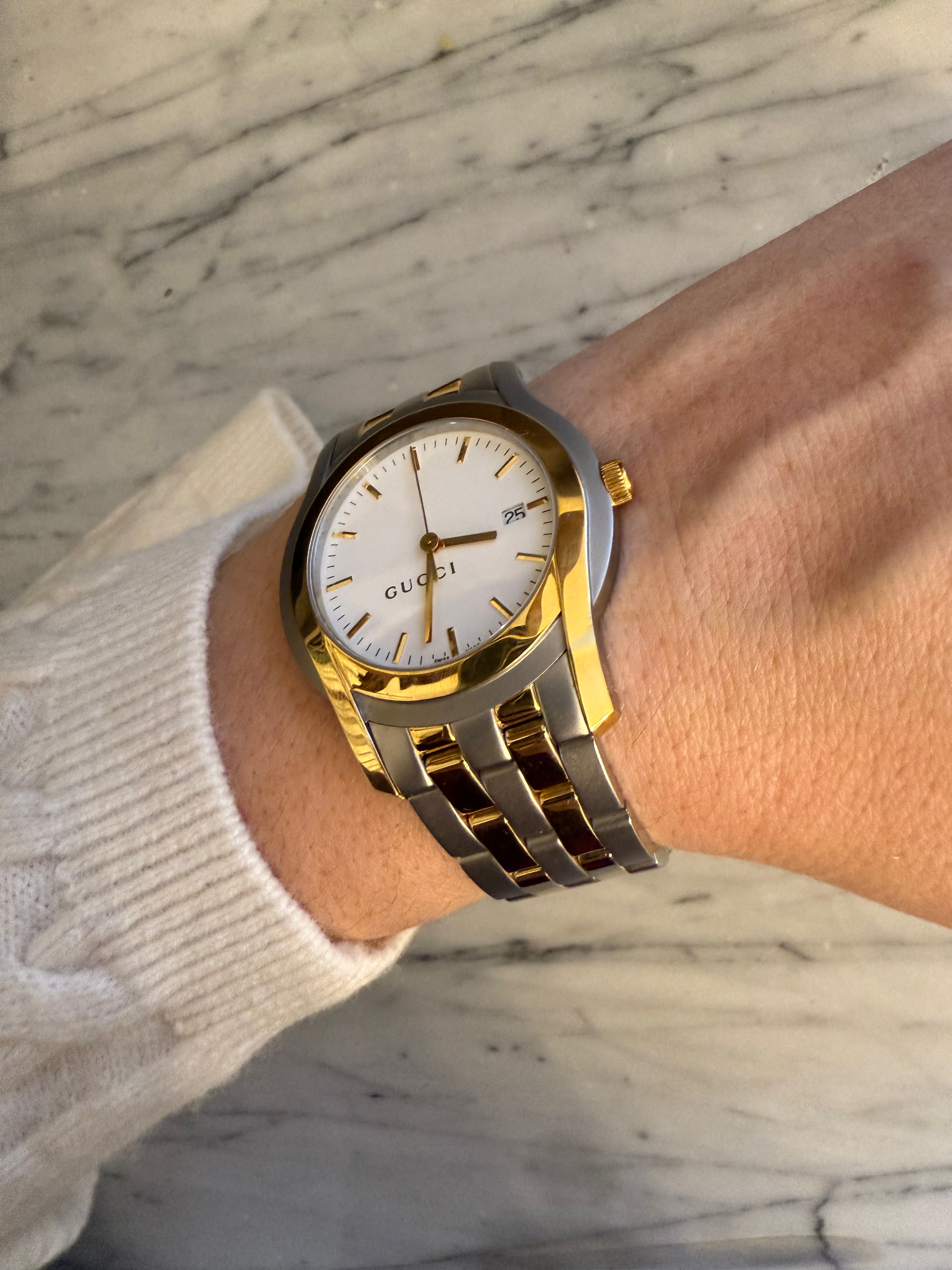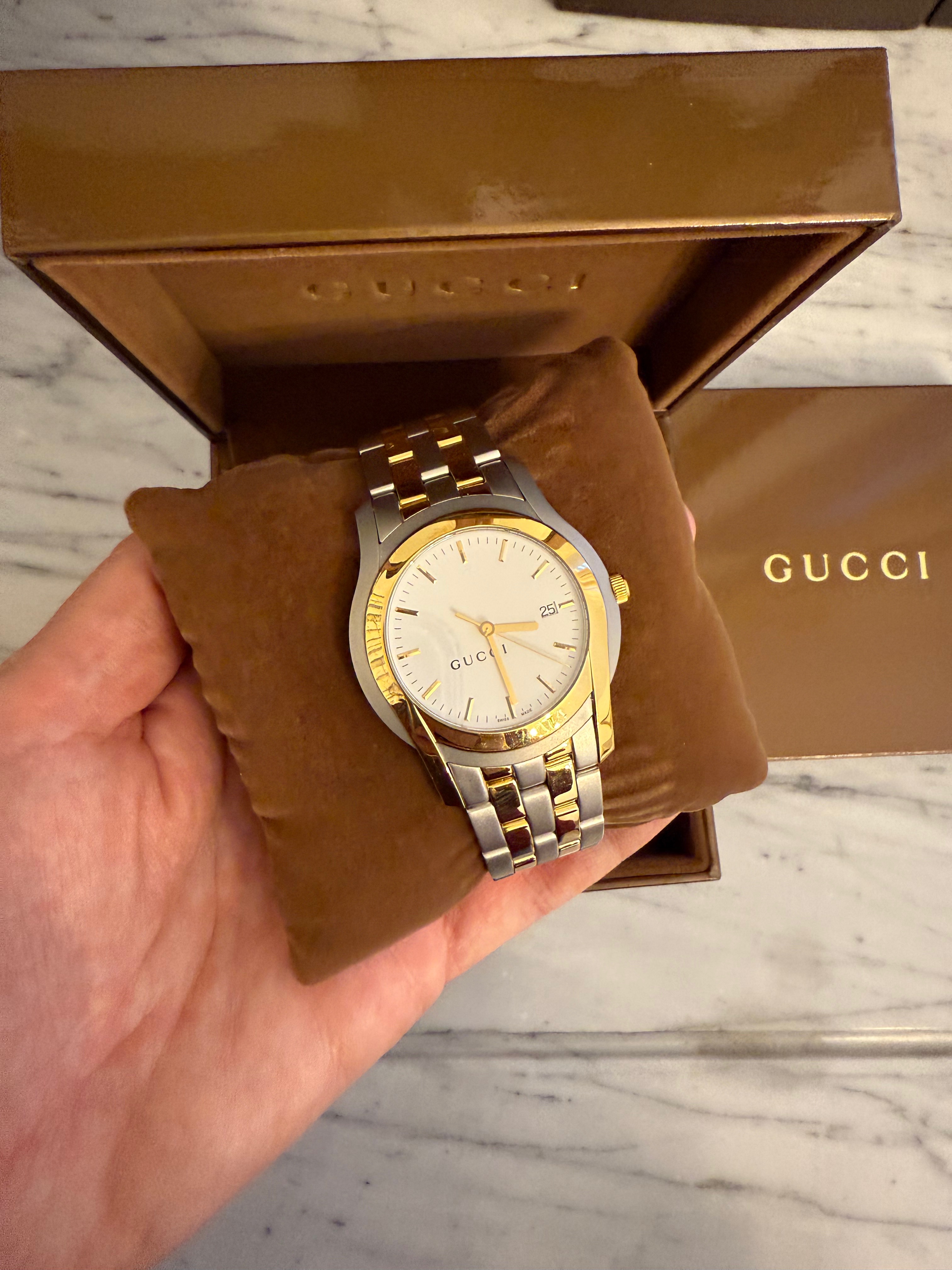 GUCCI szwajcarski zegarek męski, koperta 40mm, oryginalny na złoto-srebrnej bransolecie + pudełko
