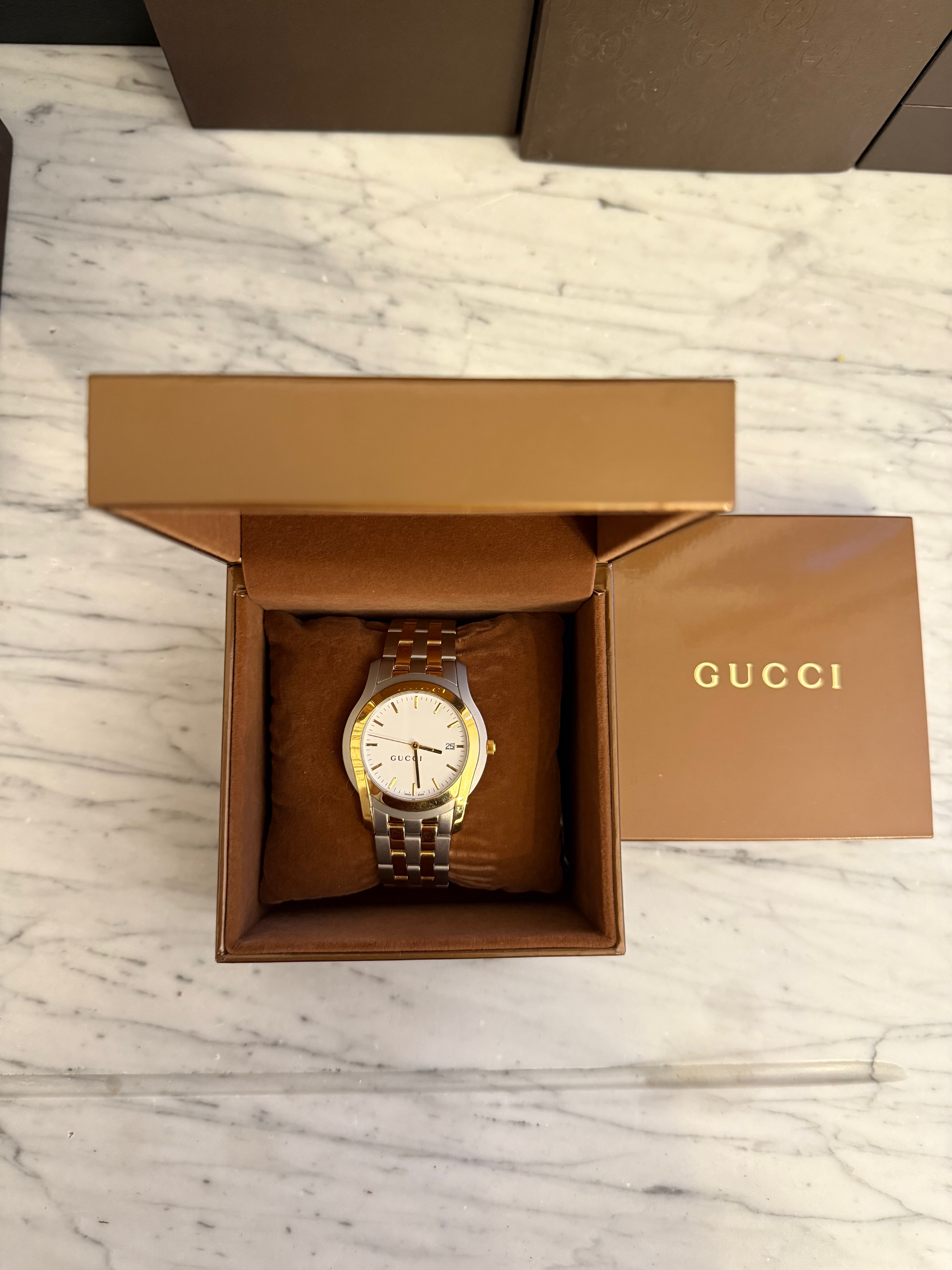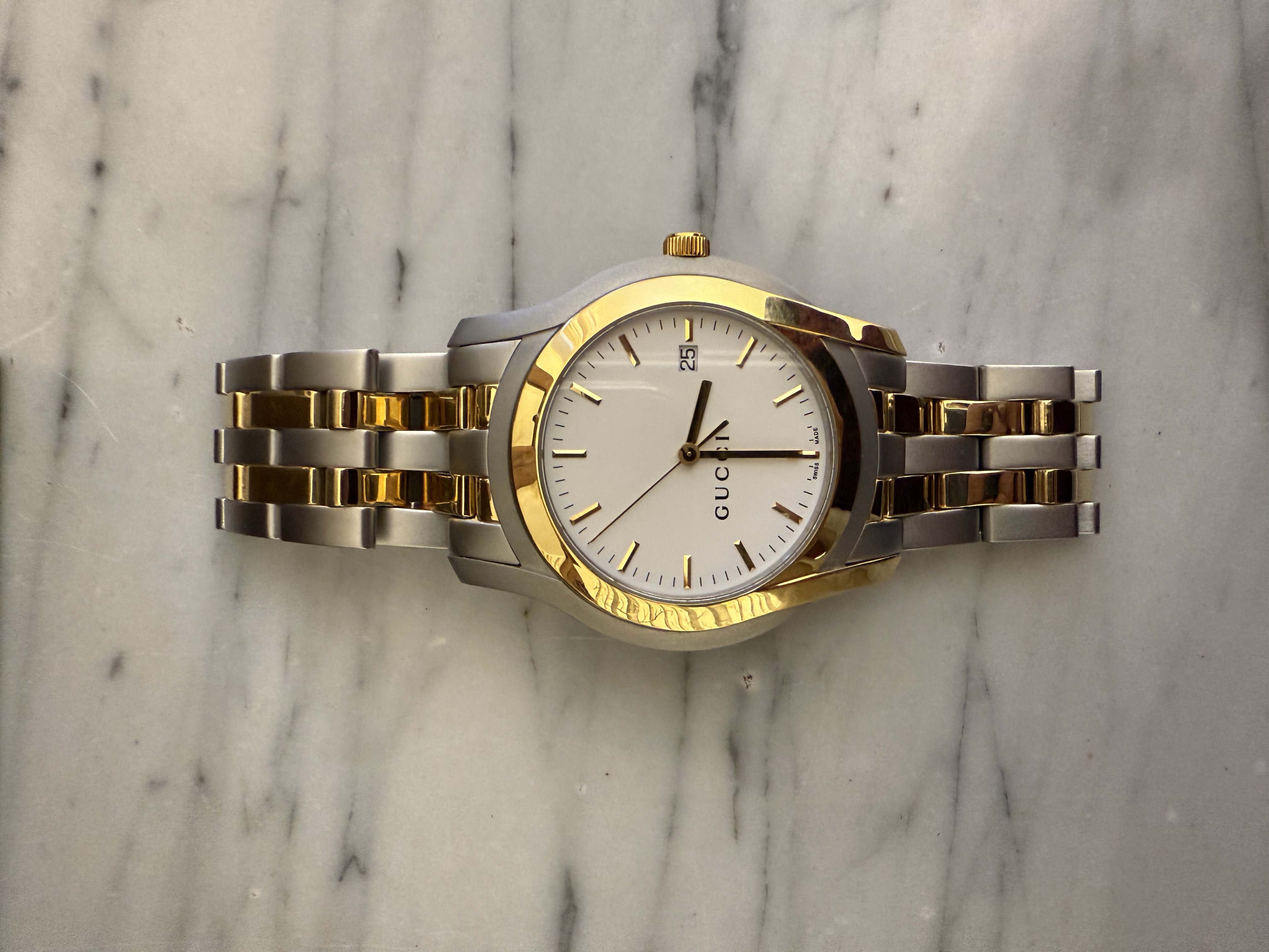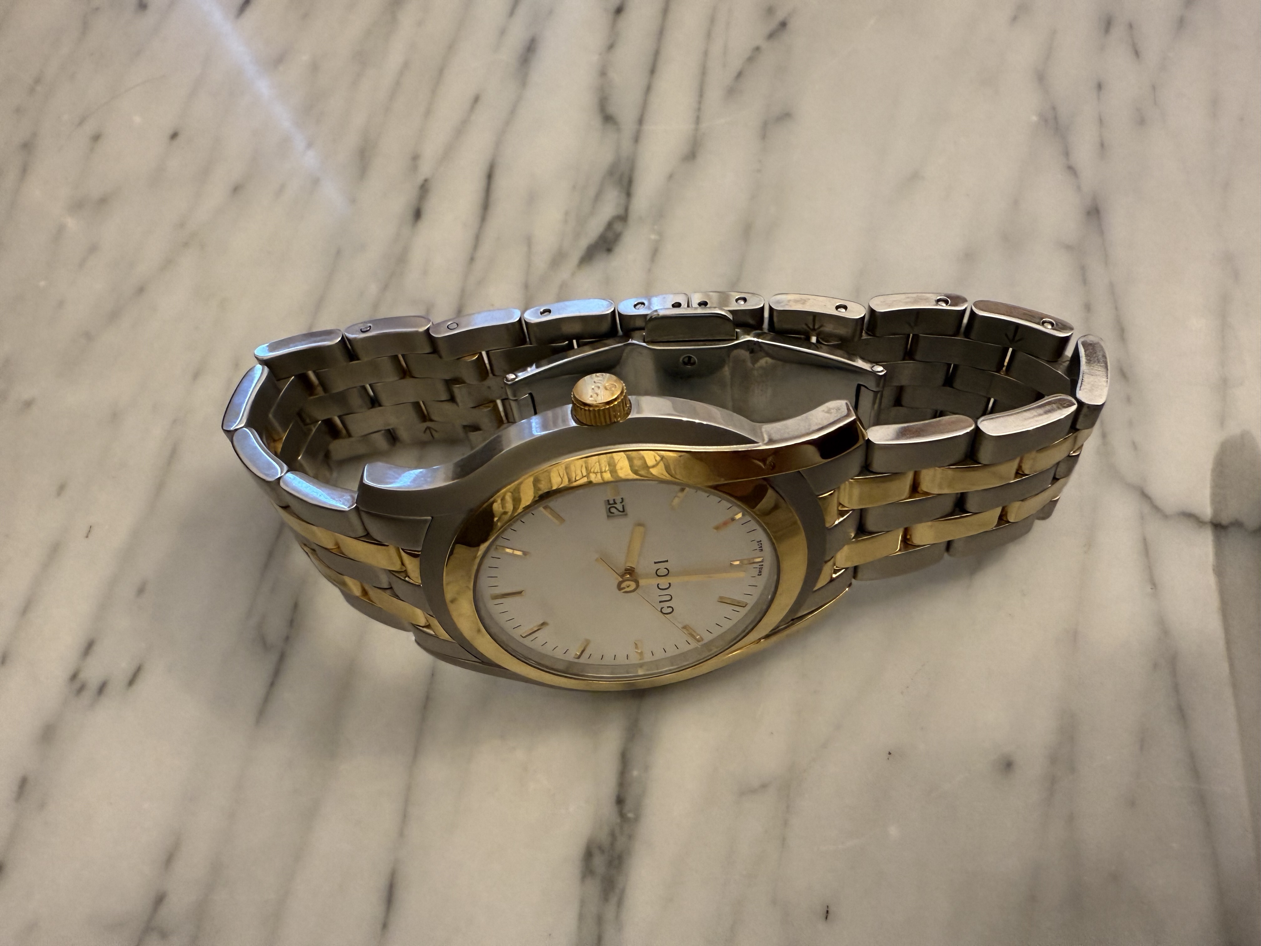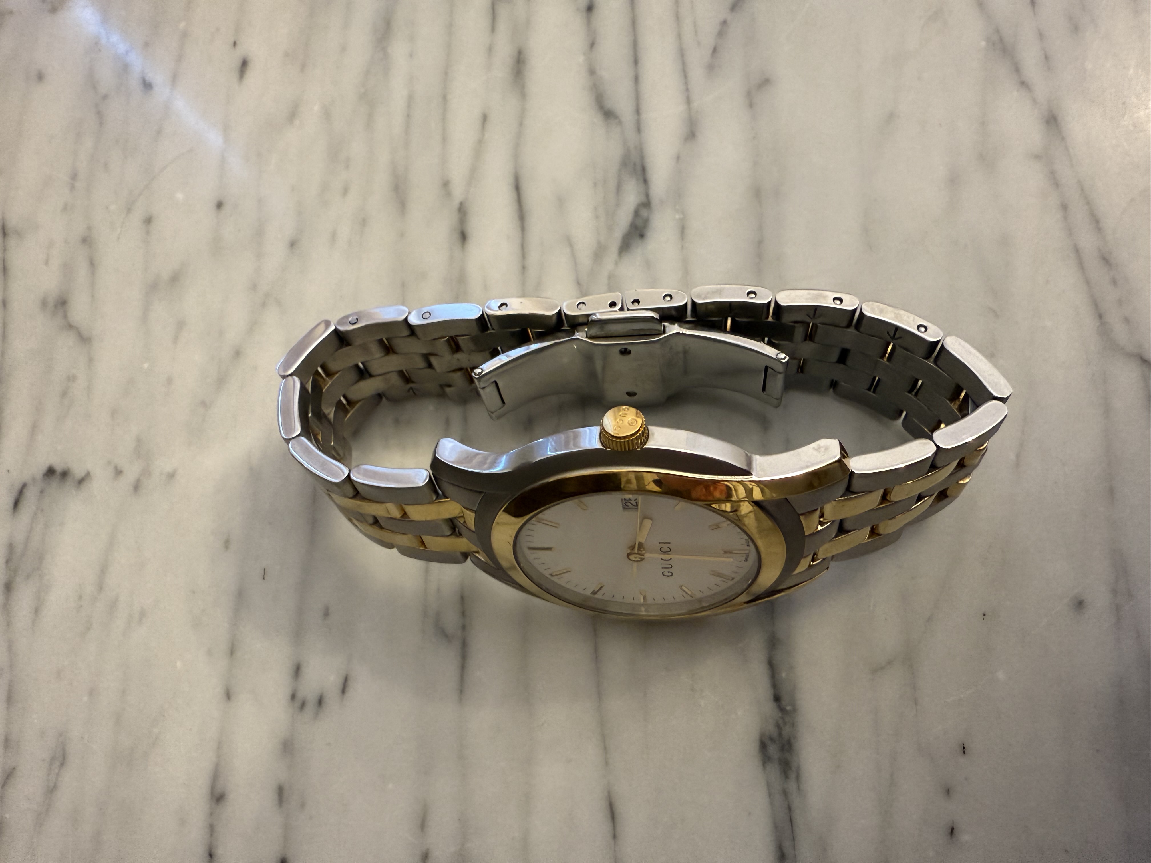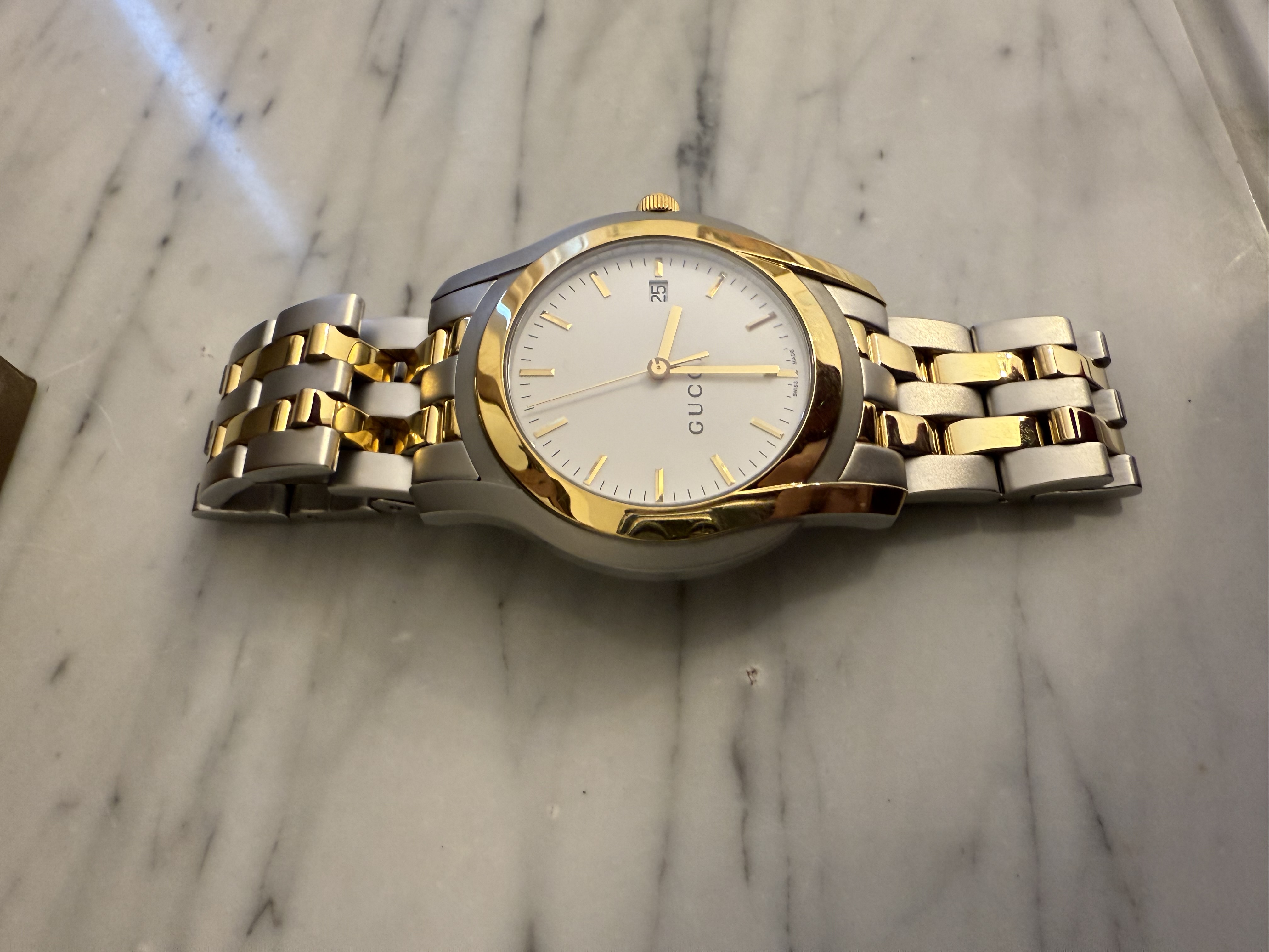 GUCCI szwajcarski zegarek męski, koperta 40mm, oryginalny na złoto-srebrnej bransolecie + pudełko