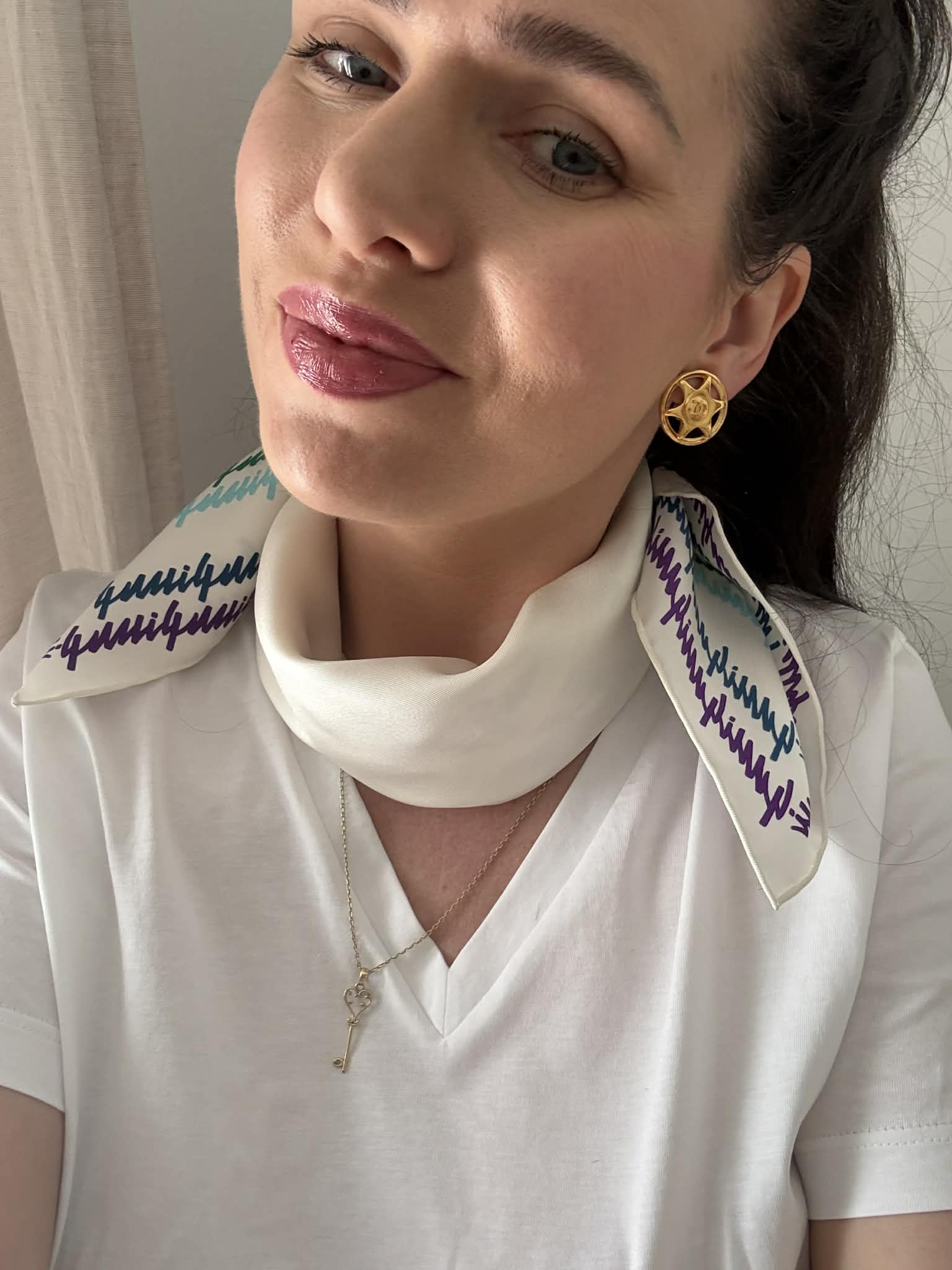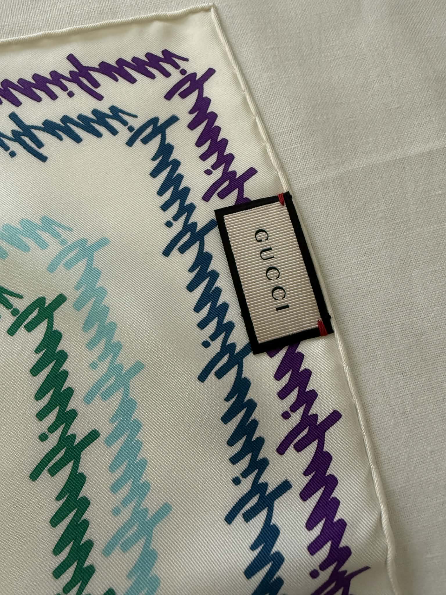 Elegancka chusta damska marki Gucci w wyjątkowym kolorowym wzorze na białym tle. Produkt w stanie idealnym – jak nowy, sprzedawany w komplecie z oryginalnym pudełkiem, dzięki czemu świetnie sprawdzi się również jako prezent.