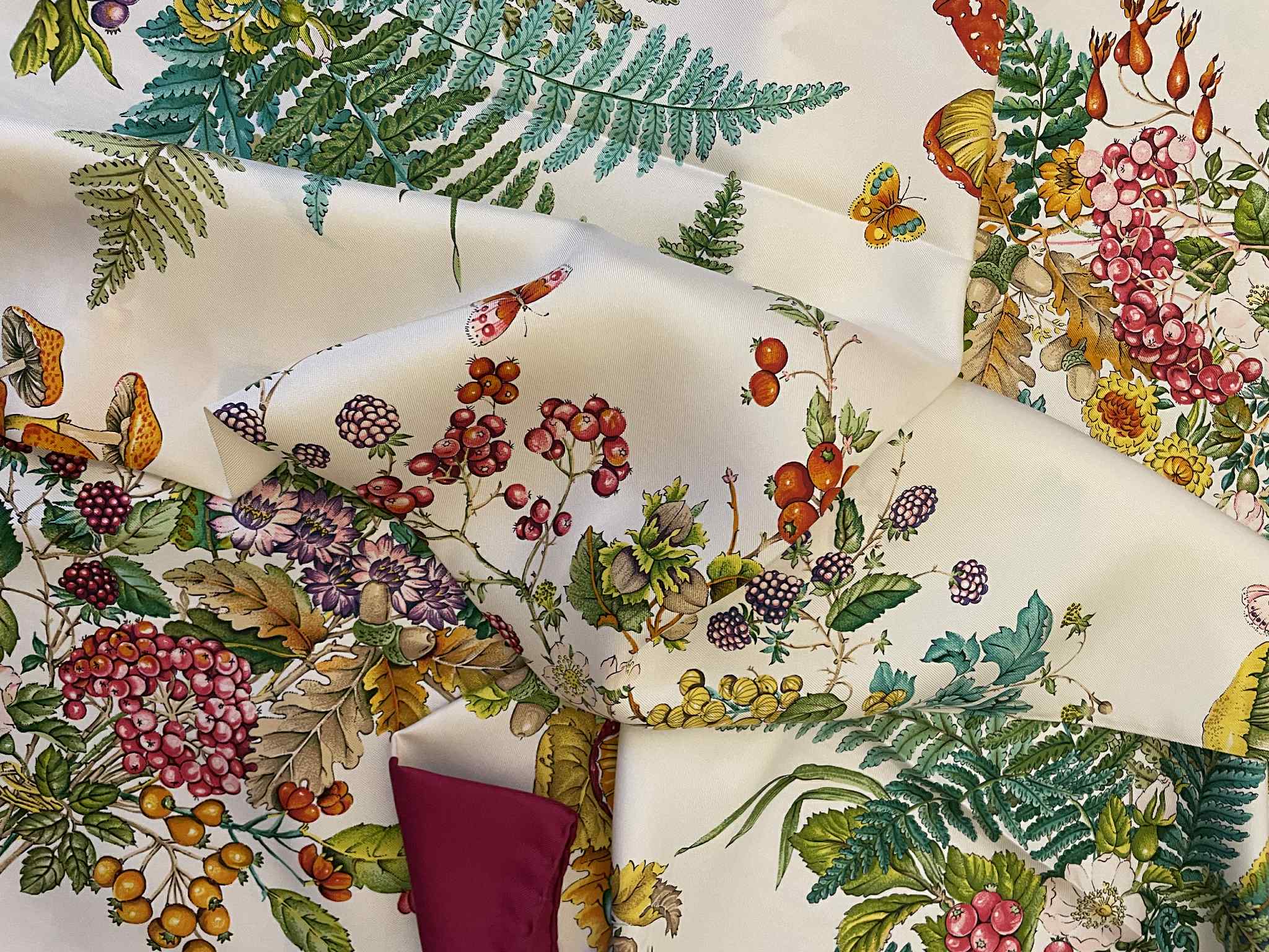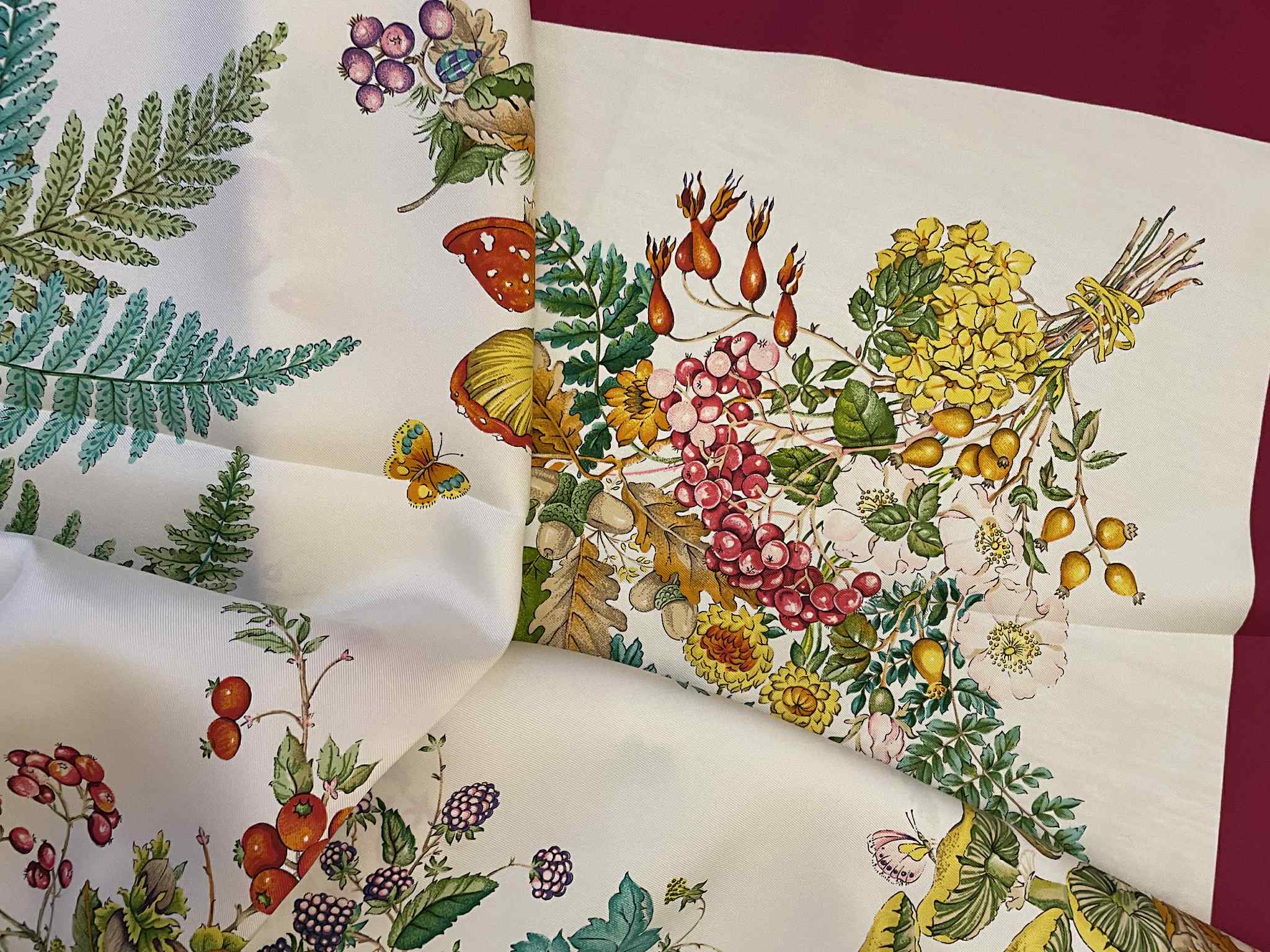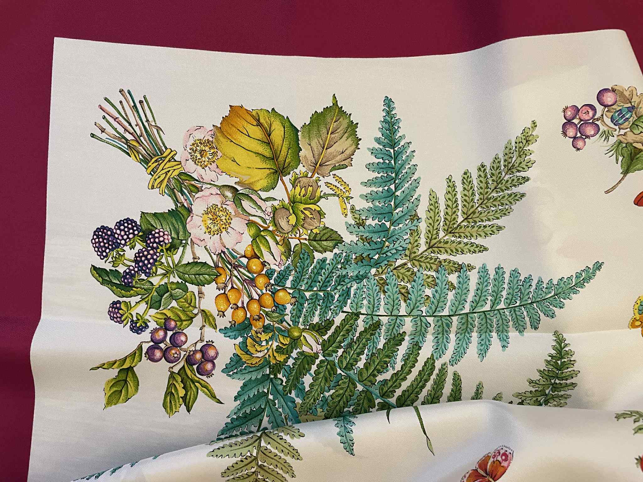 Ręcznie rolowane brzegi świadczą o wysokiej jakości wykończenia. Wzór przedstawia koszyk z grzybkami, otoczony obramowaniem w kolorze różowym