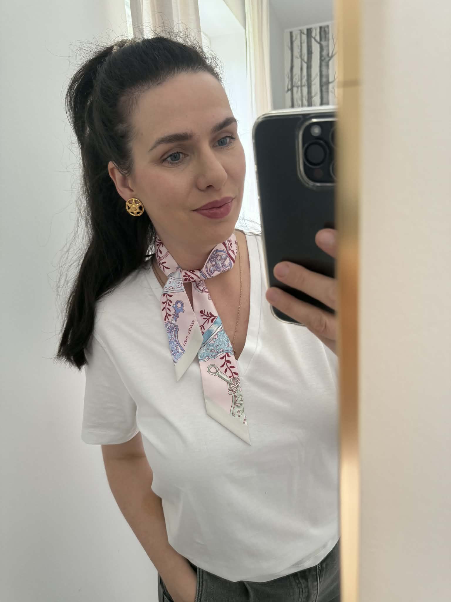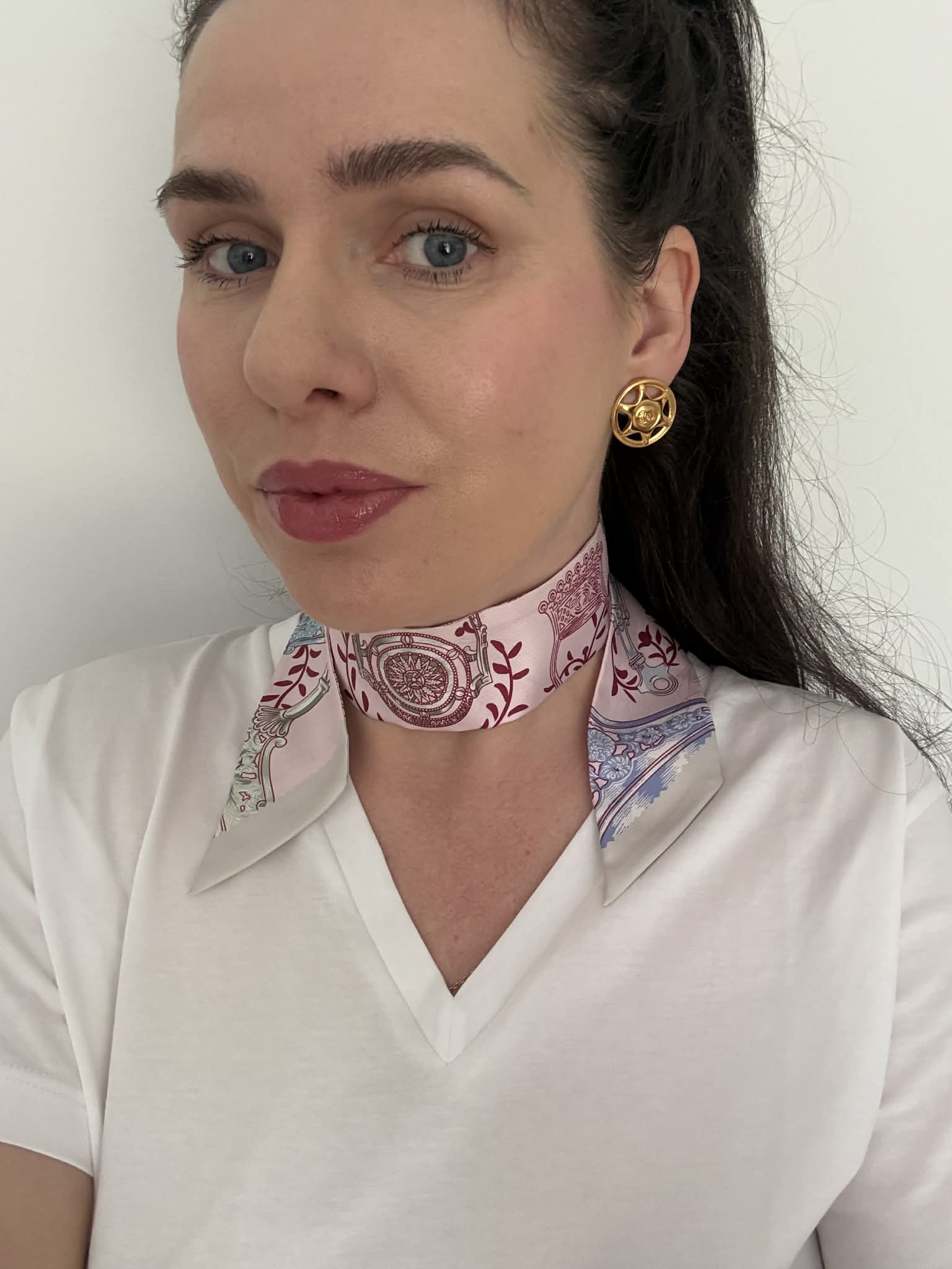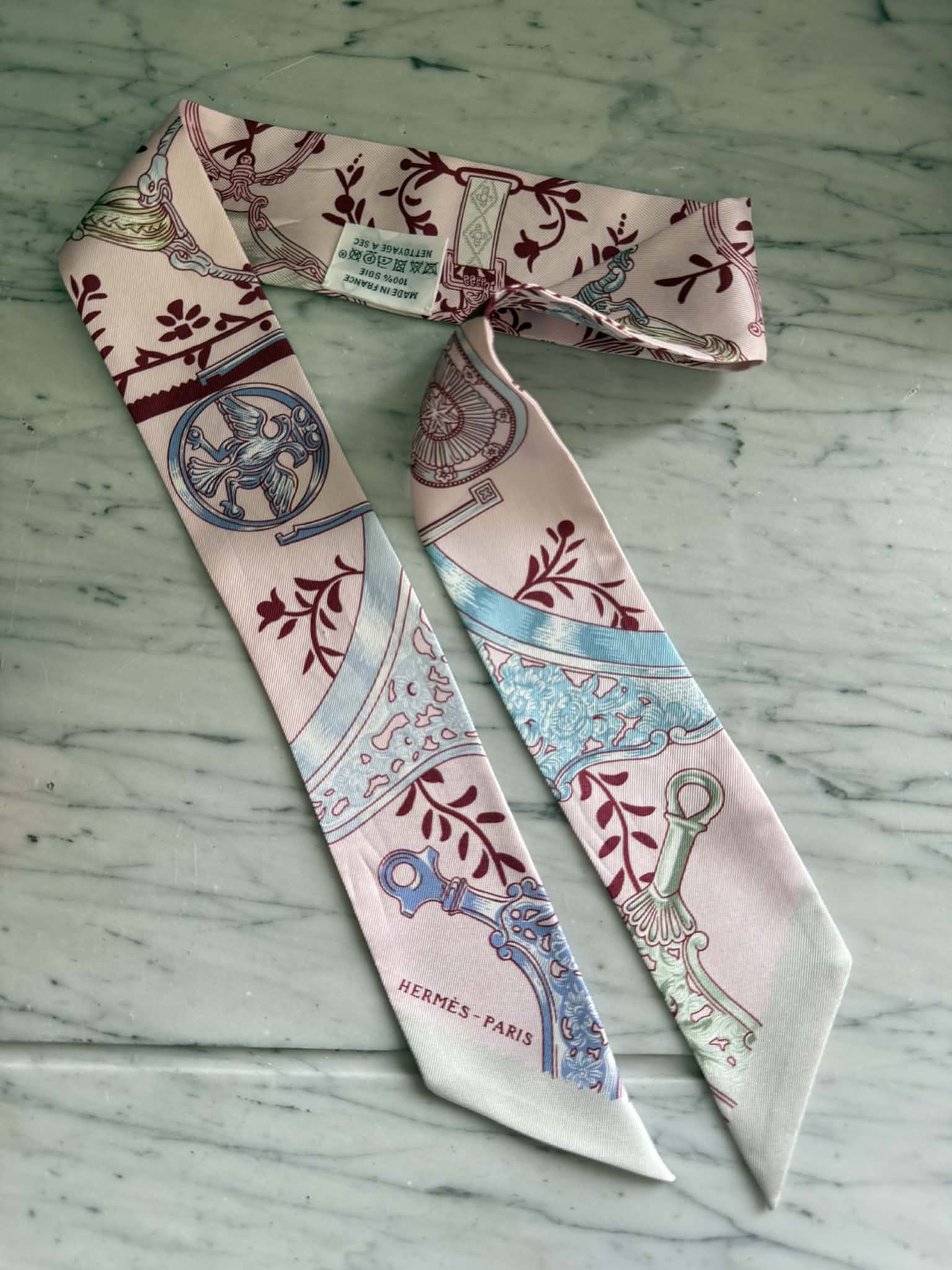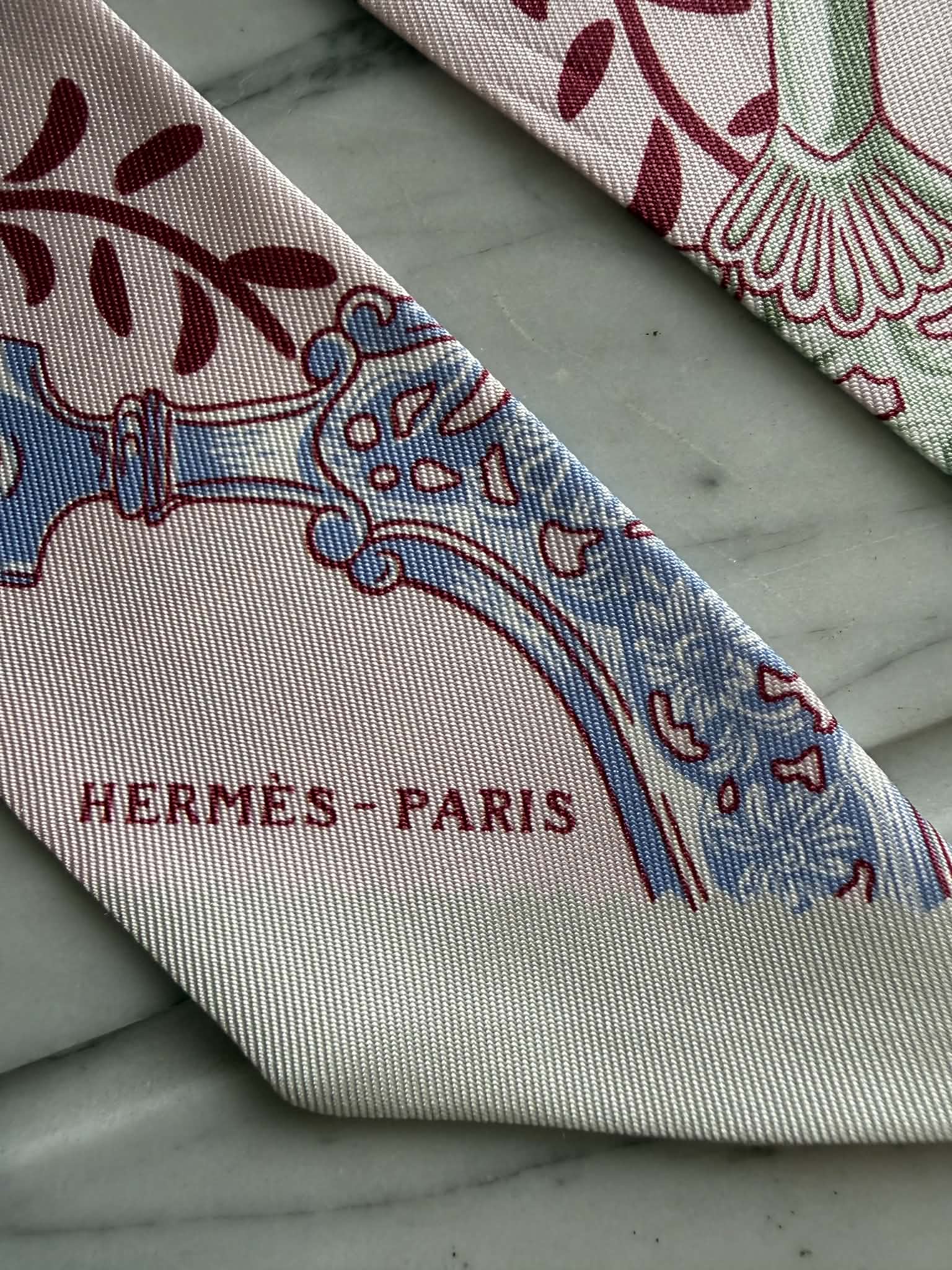 Wykonana z wysokiej jakości jedwabiu, może być noszona na wiele sposobów: na szyi, nadgarstku, we włosach lub przewiązana przy torebce. Apaszka jest w doskonałym stanie i sprzedawana w komplecie z oryginalnym pudełkiem Hermès – idealna również na prezent. Apaszka jest z kompletem metek.