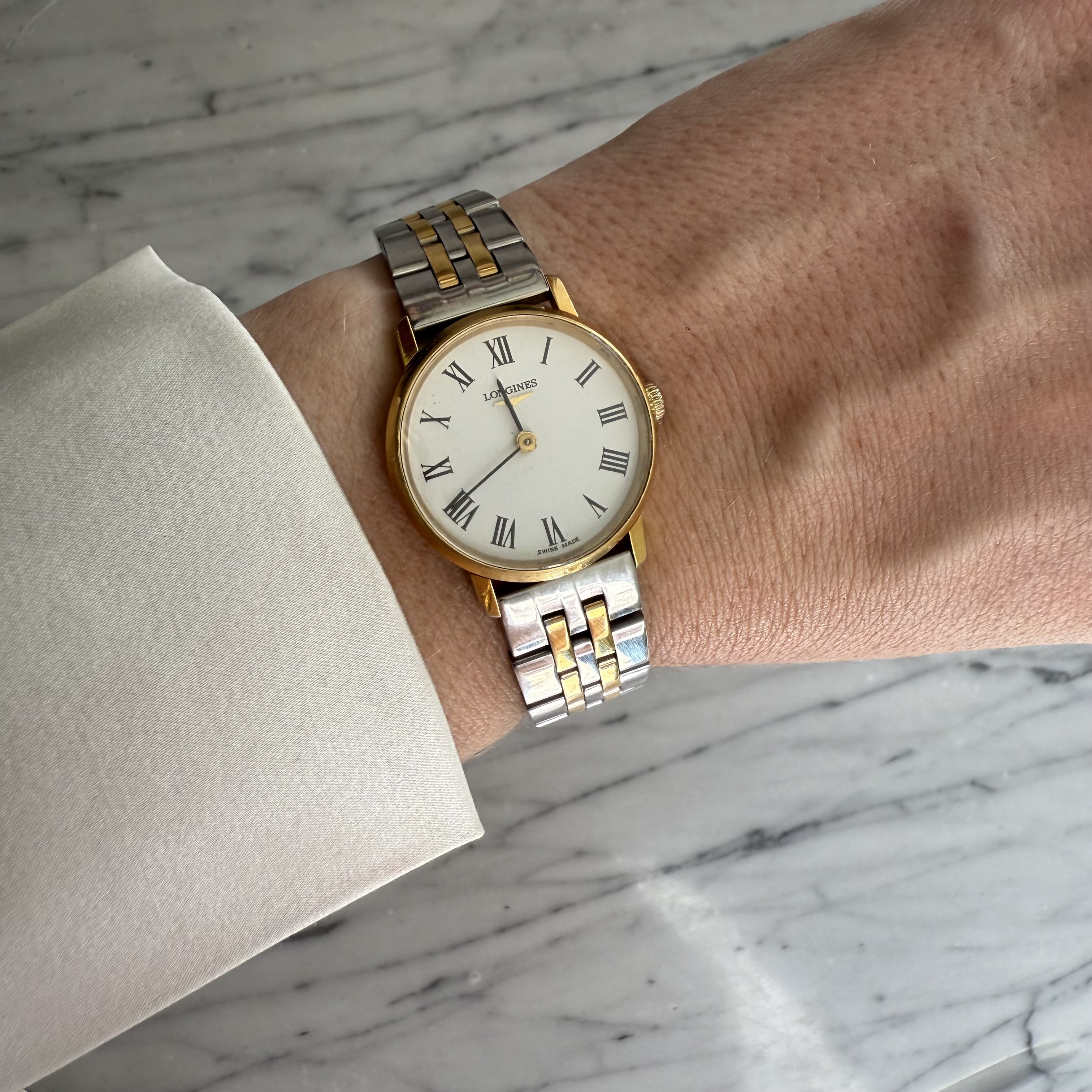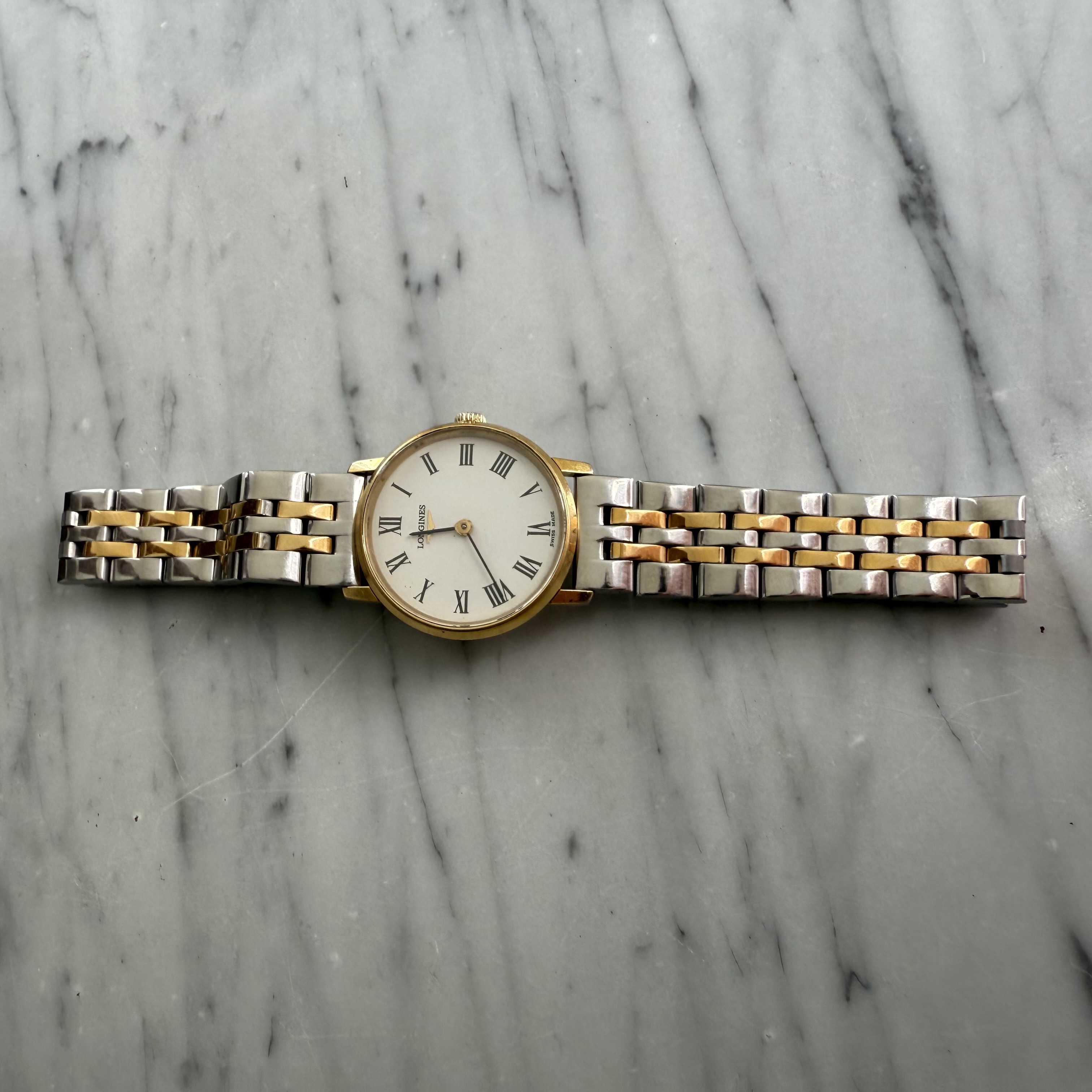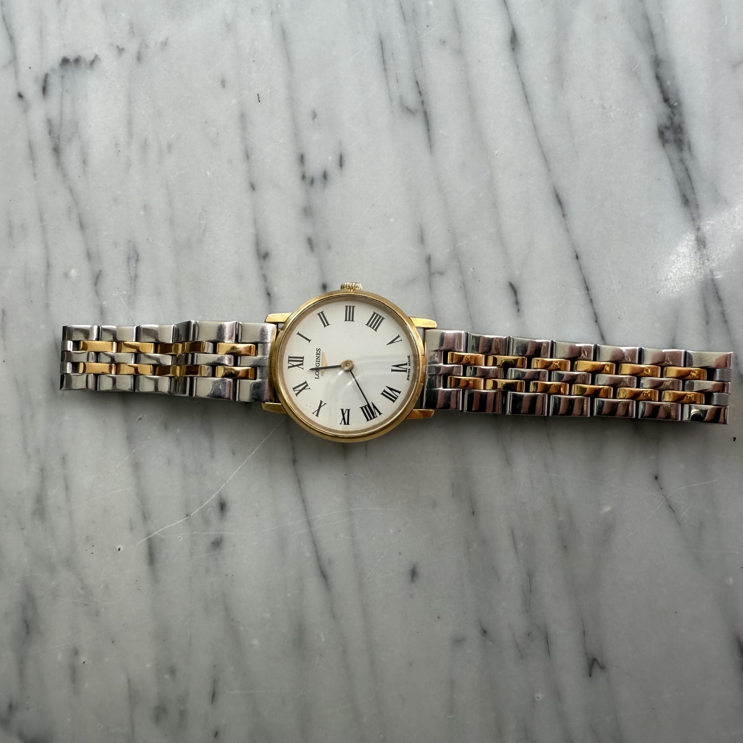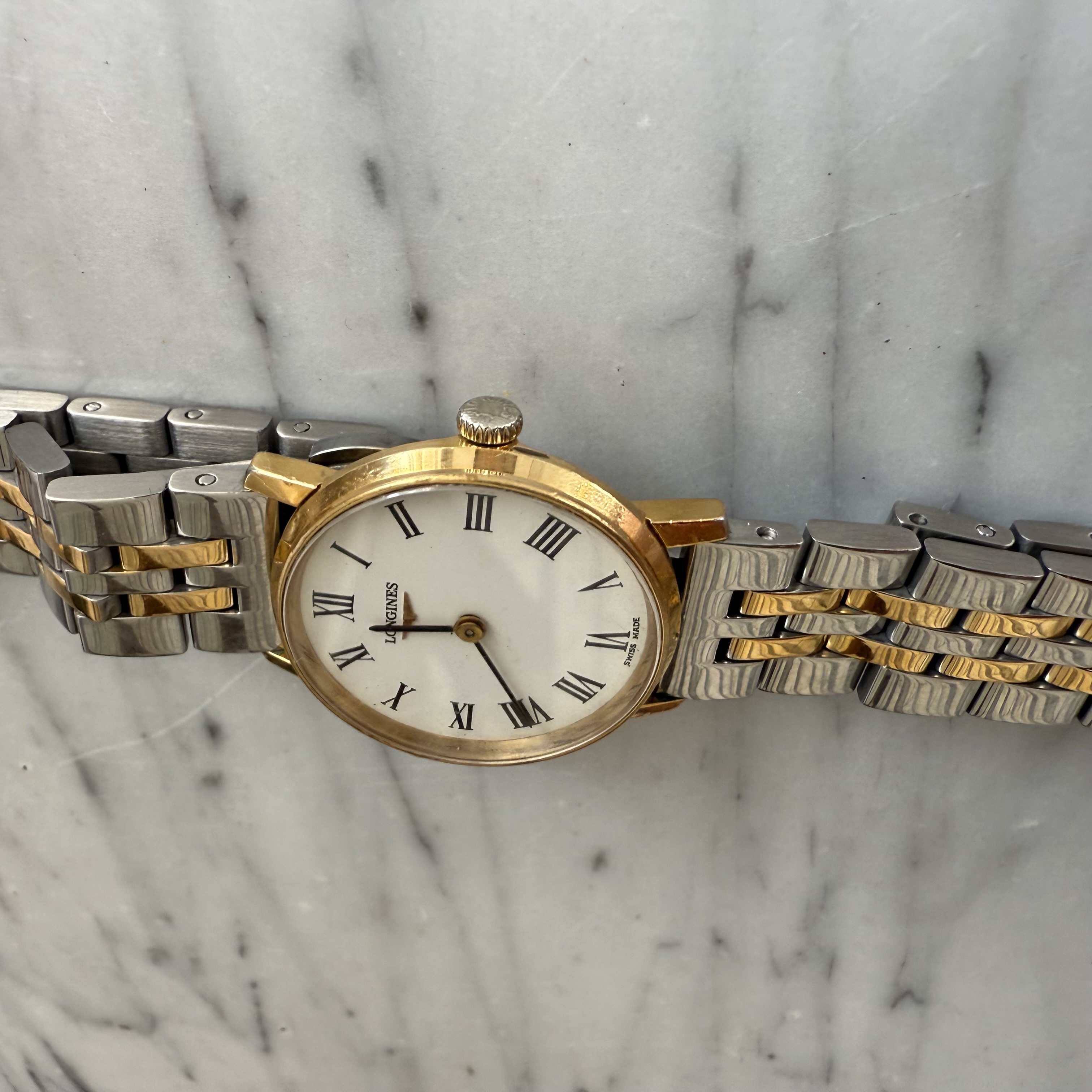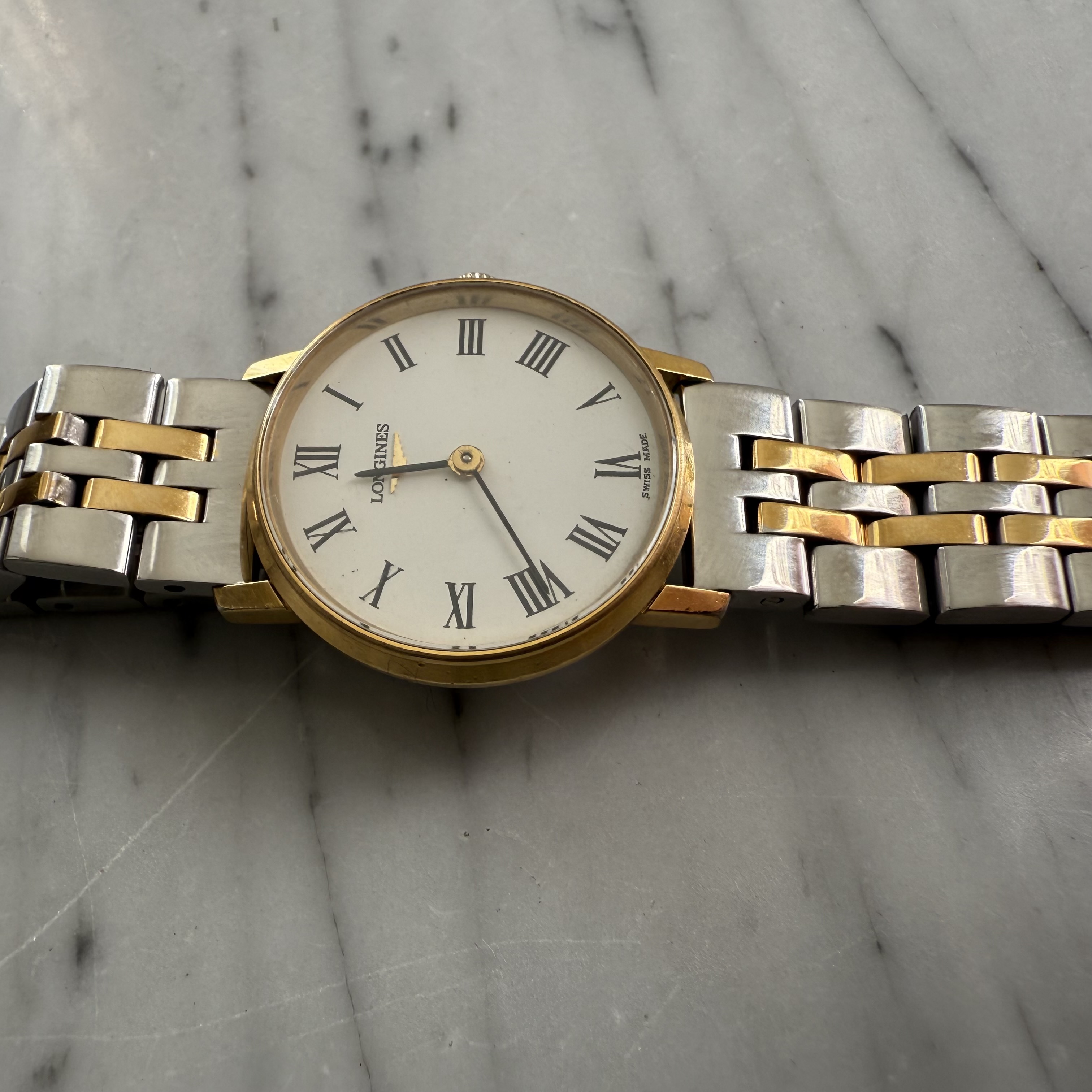 Longines, oryginalny szwajcarski zegarek z naciągiem manualnym, złoto-srebrna bransoleta bicolor