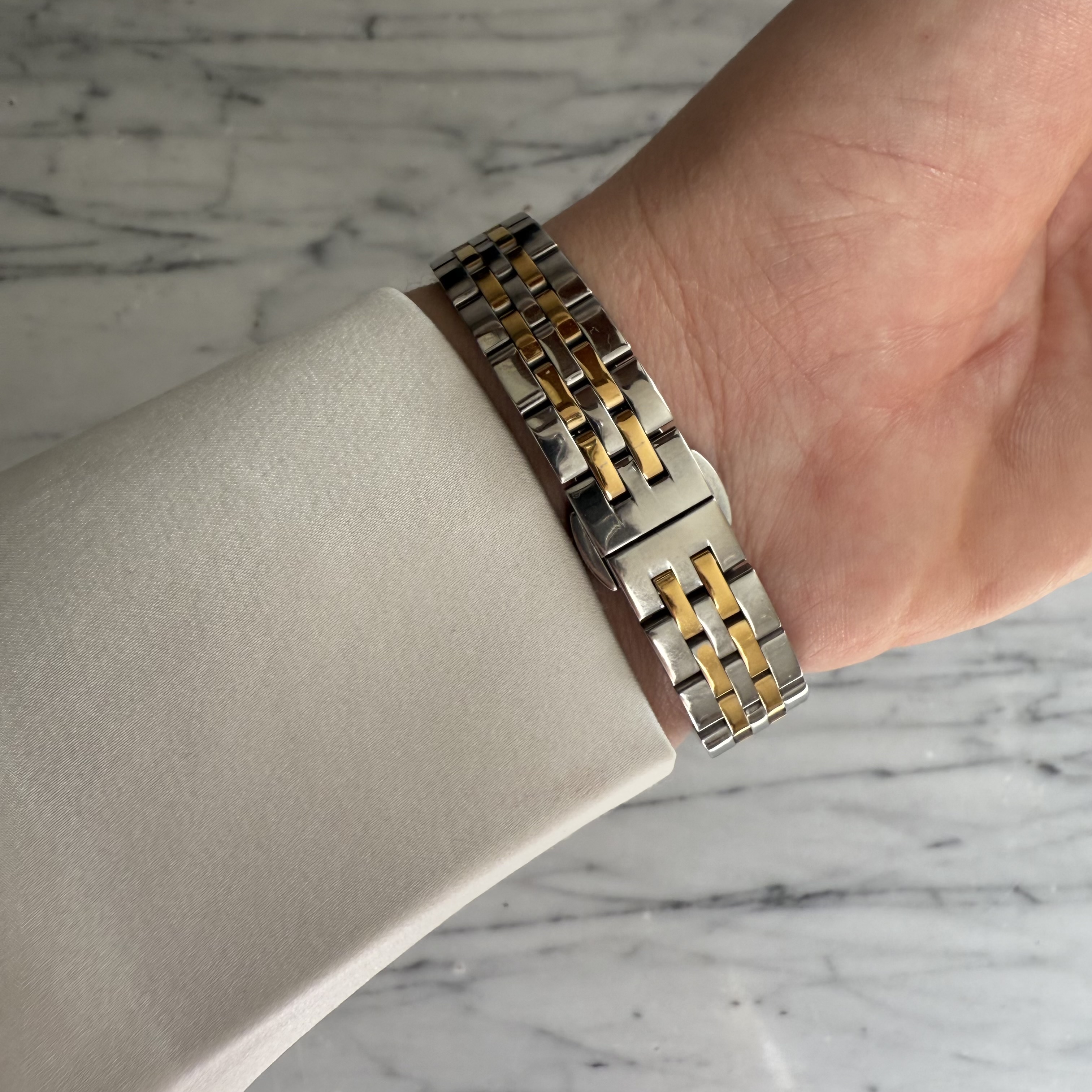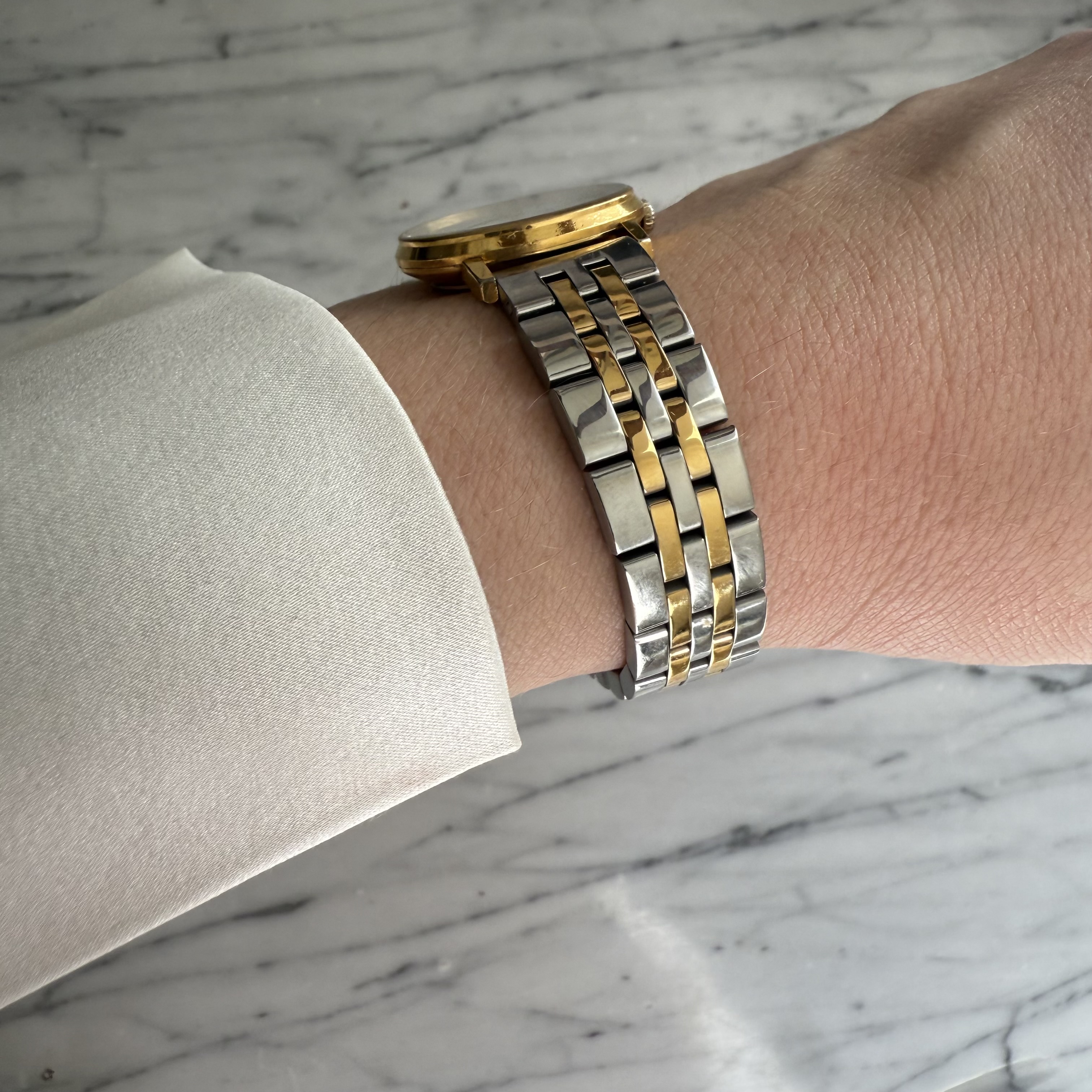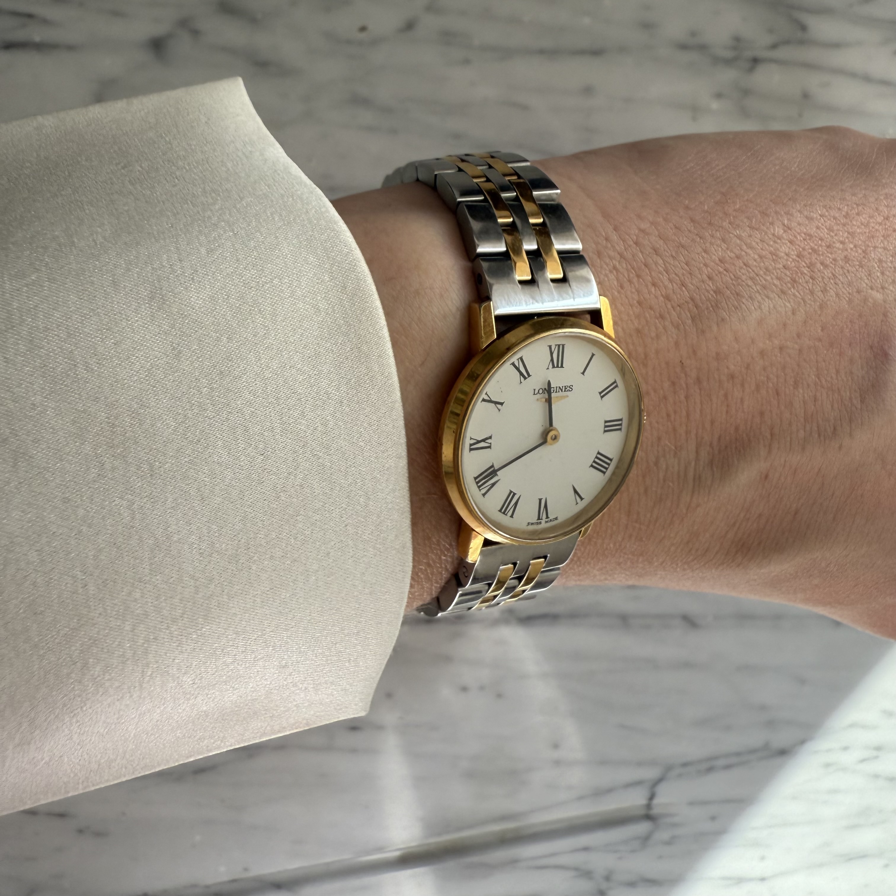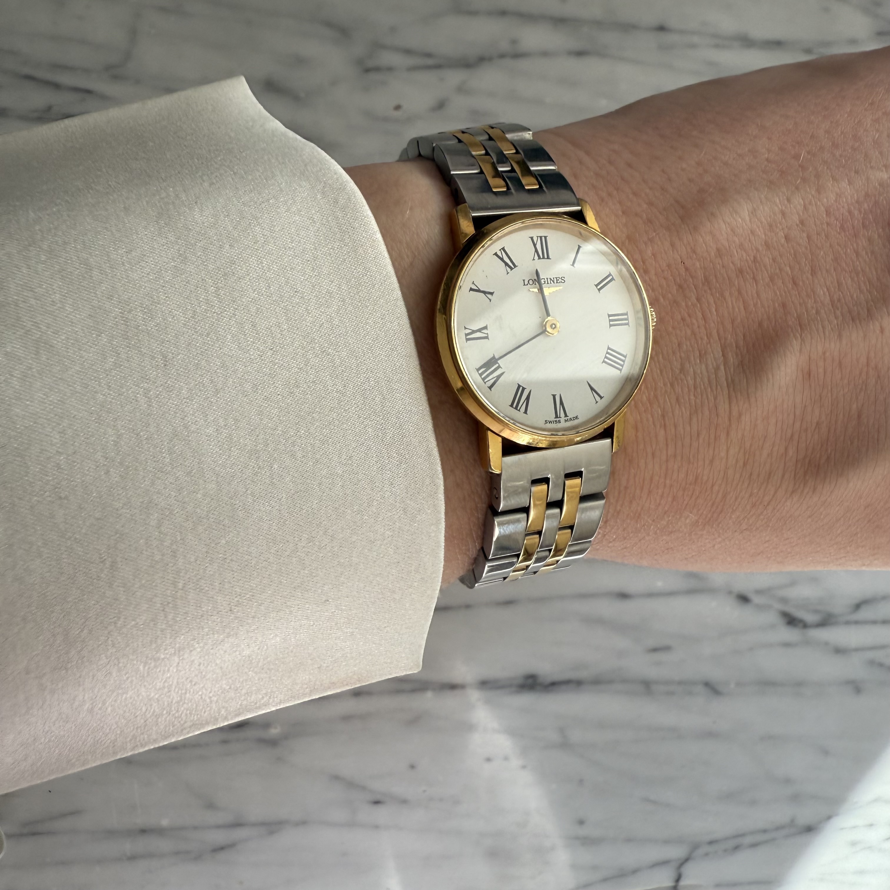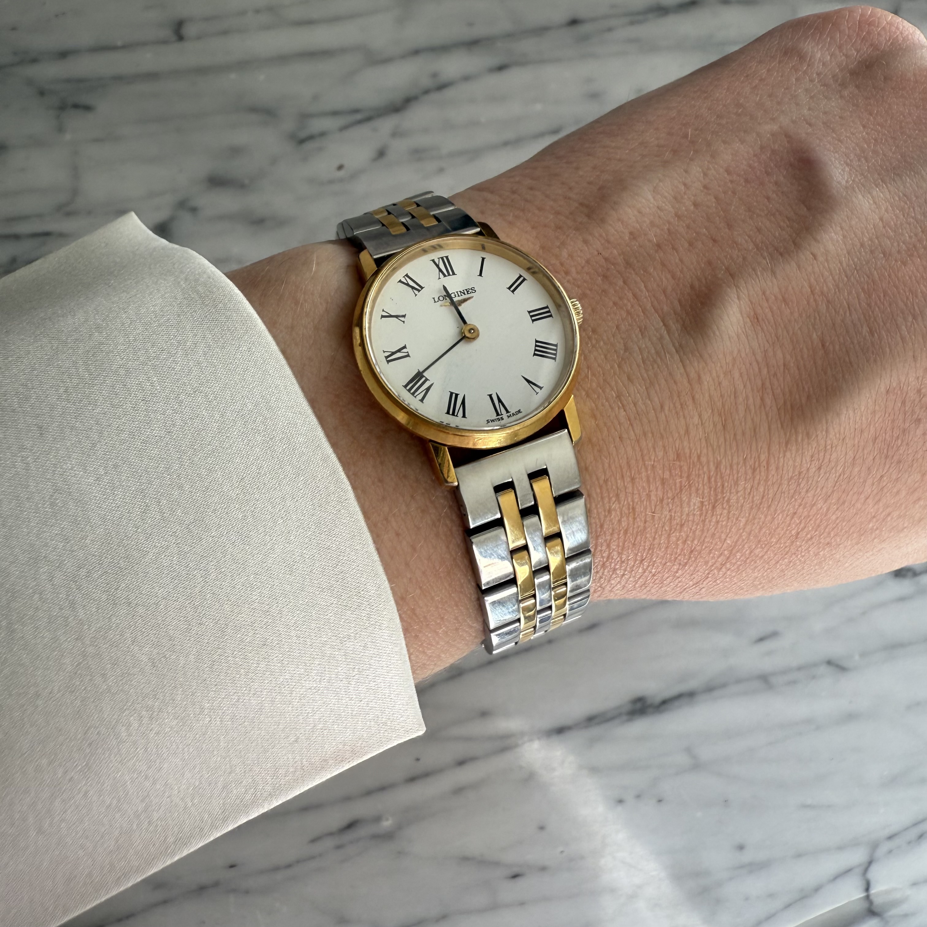 Longines, oryginalny szwajcarski zegarek z naciągiem manualnym, złoto-srebrna bransoleta bicolor