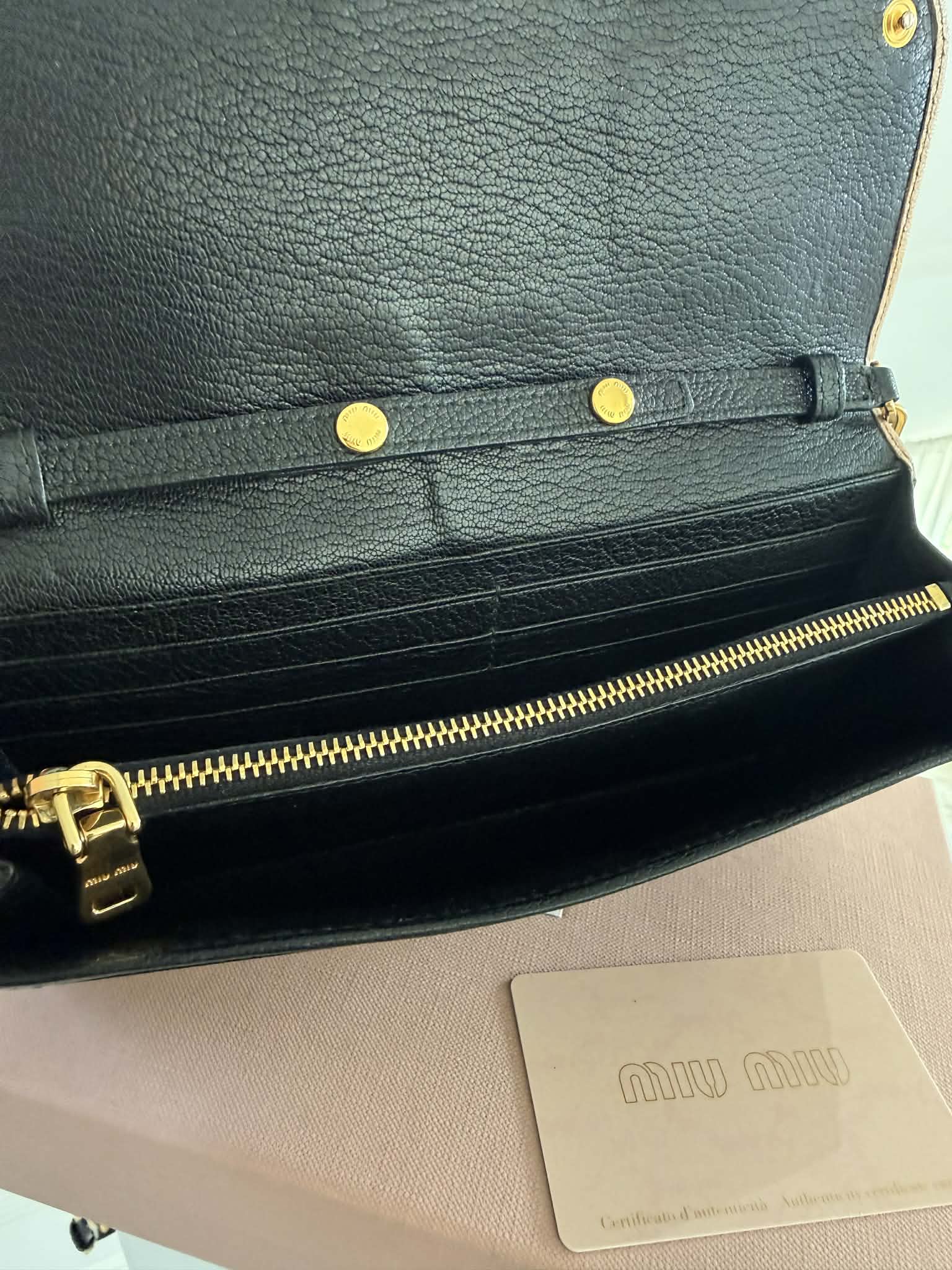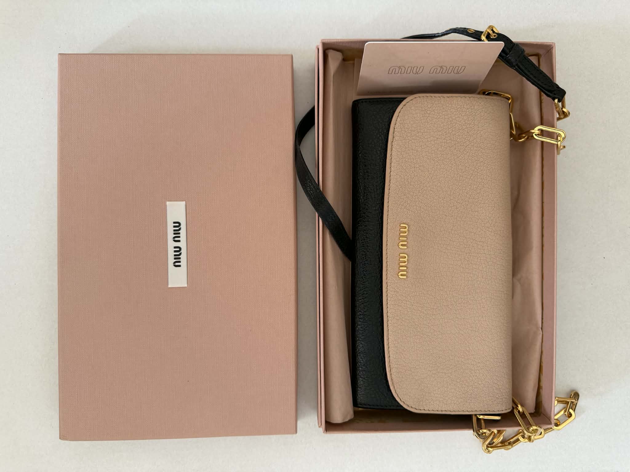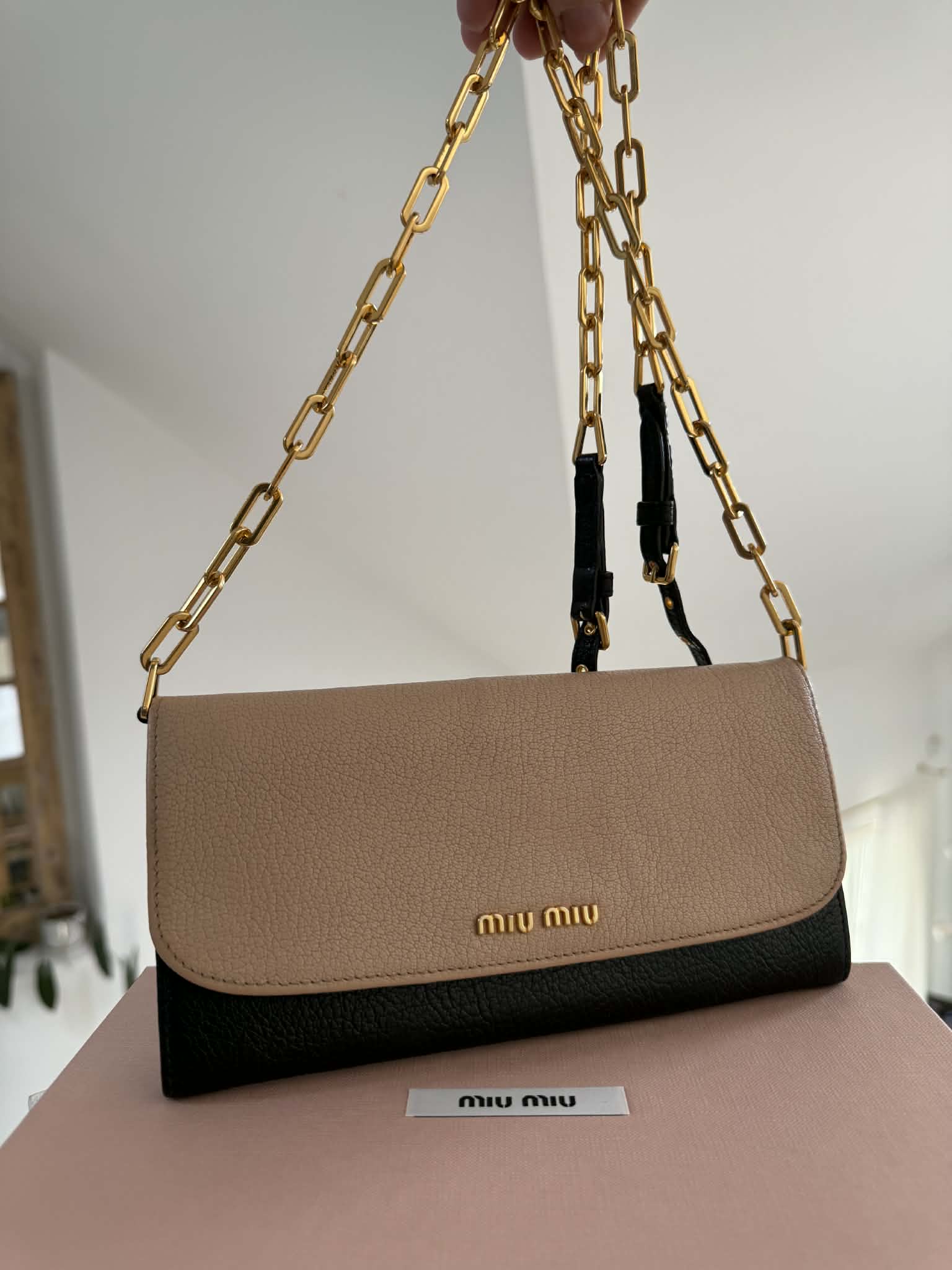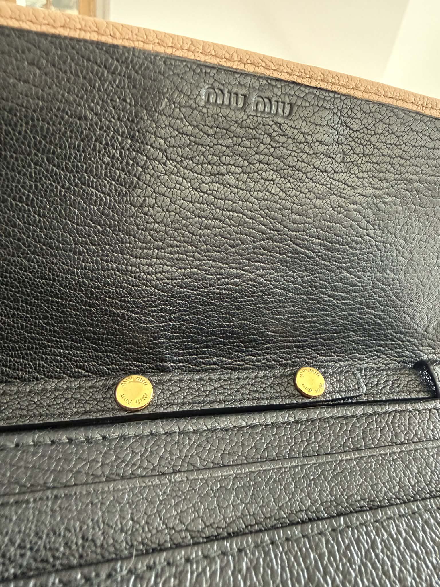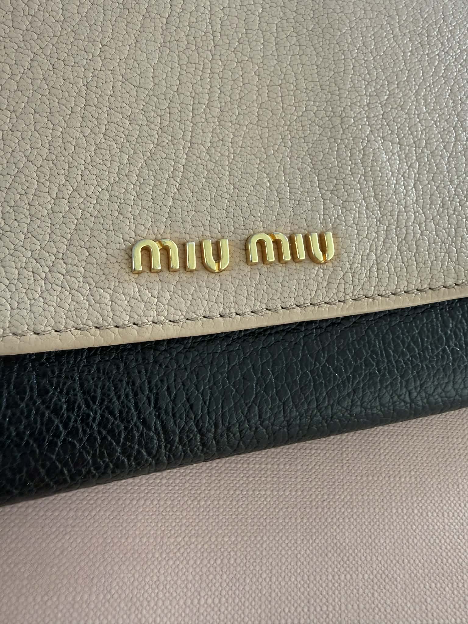 Stylowa i kompaktowa torebka na ramię marki Miu Miu, która łączy funkcjonalność portfela z elegancją małej torebki. Idealna na co dzień oraz na wyjścia – bez problemu pomieści telefon, karty.