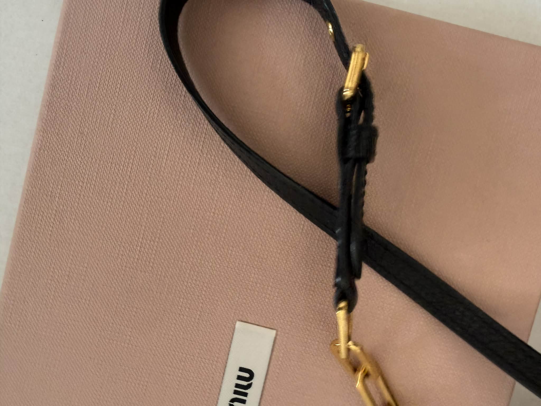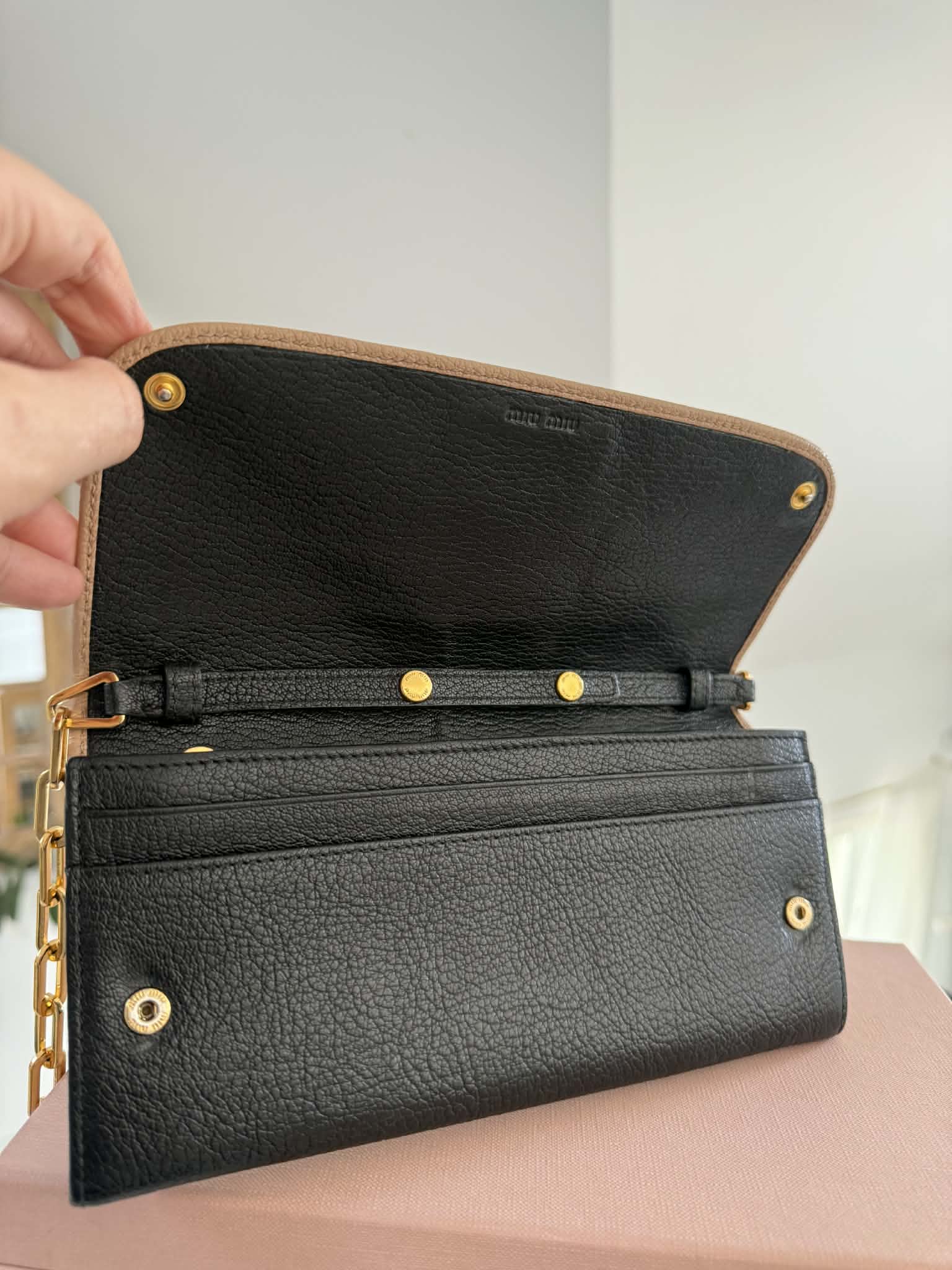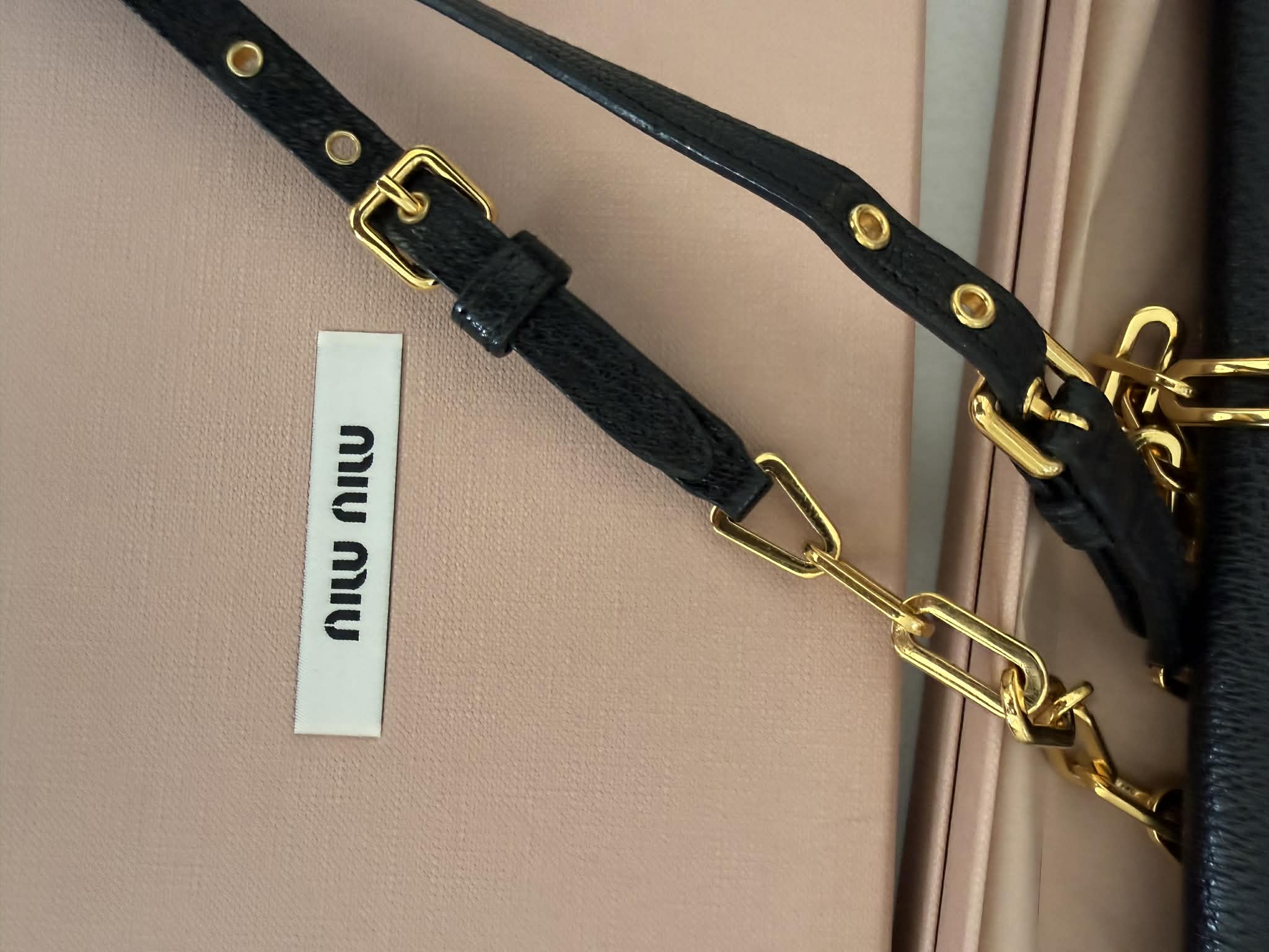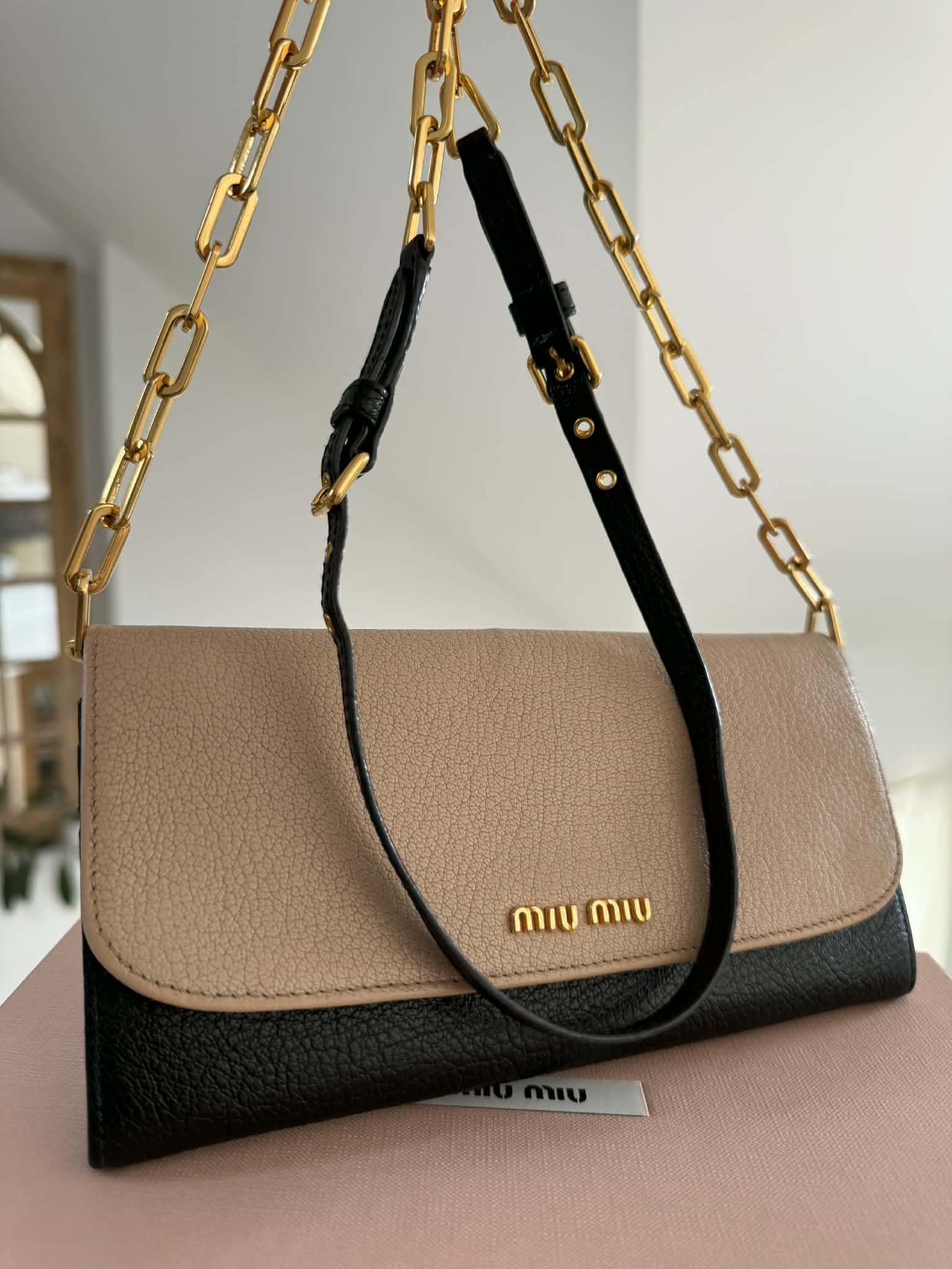 Stylowa i kompaktowa torebka na ramię marki Miu Miu, która łączy funkcjonalność portfela z elegancją małej torebki. Idealna na co dzień oraz na wyjścia – bez problemu pomieści telefon, karty.