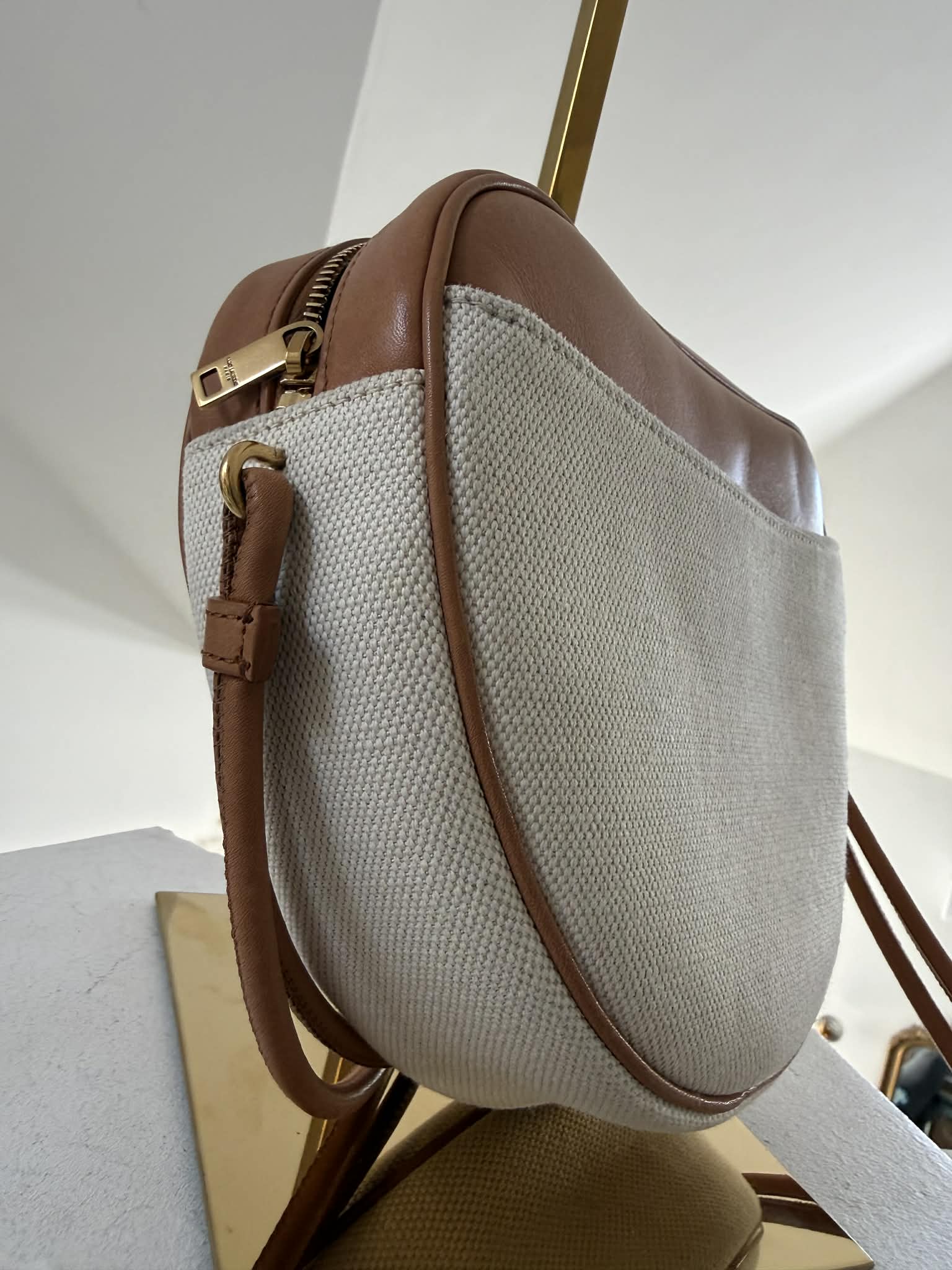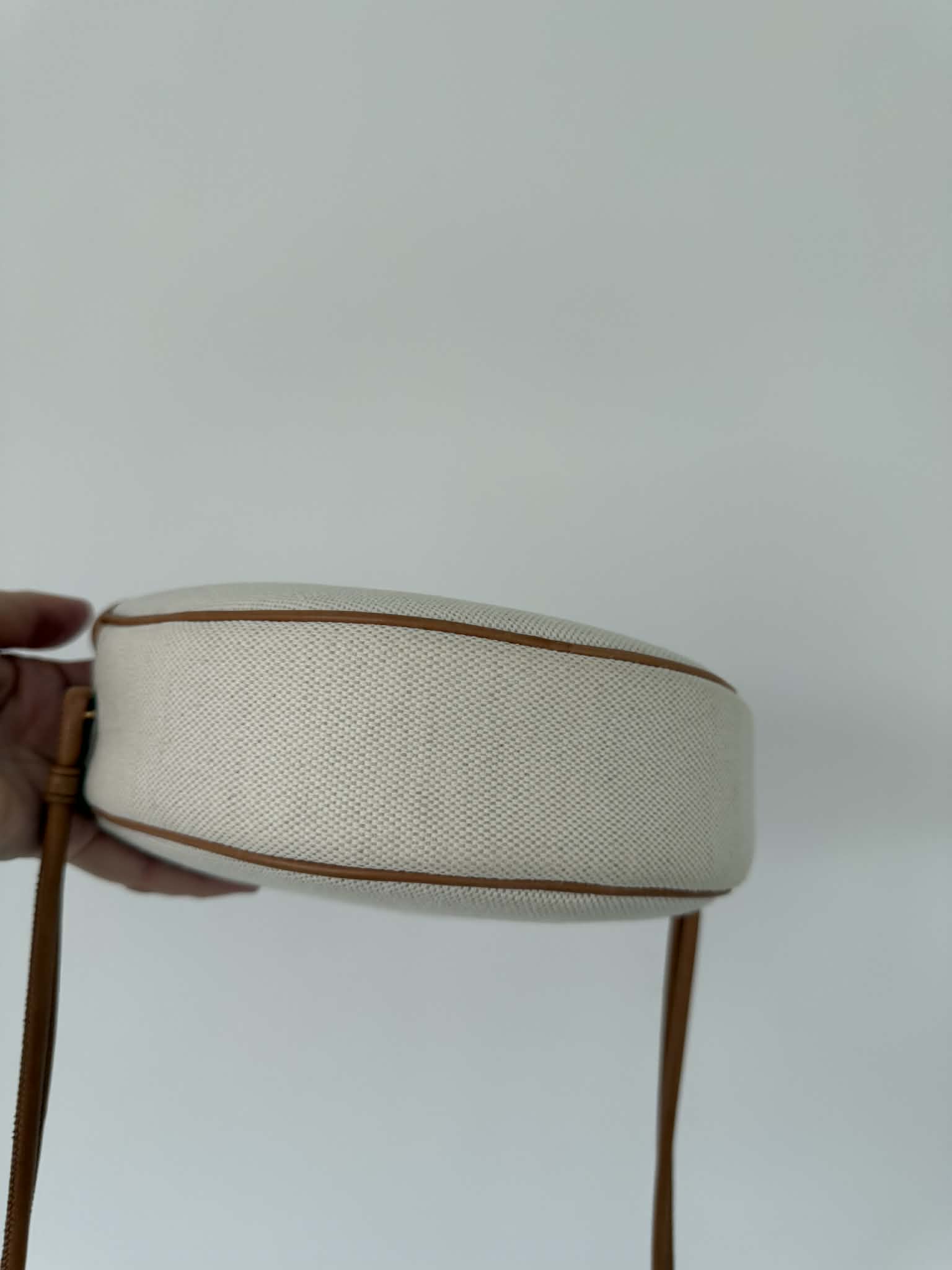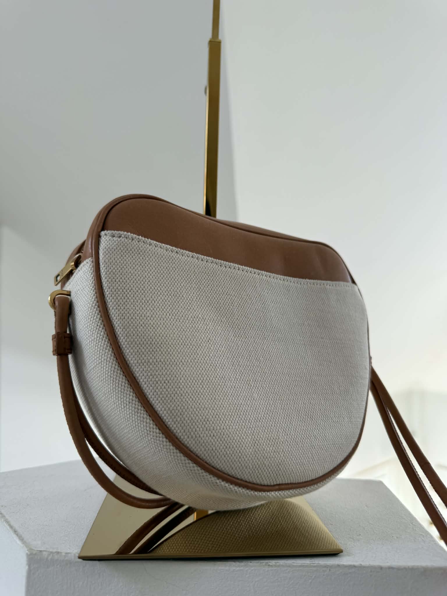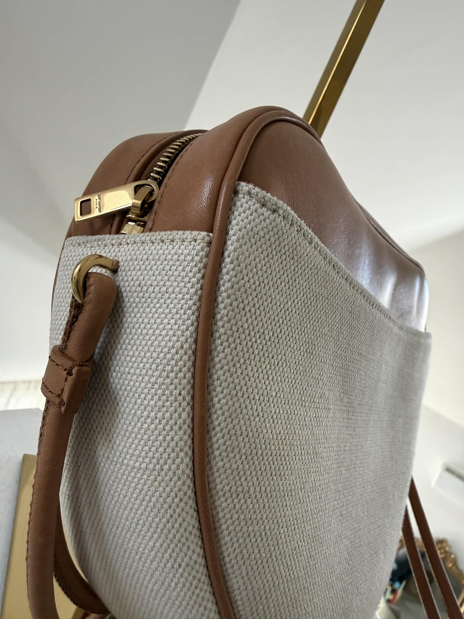 Torebka została wykonana z wysokiej jakości canvasu oraz skóry naturalnej, co zapewnia trwałość i elegancki wygląd. Klasyczne połączenie kolorów białego i brązowego oraz charakterystyczny monogram marki podkreślają jej luksusowy charakter.