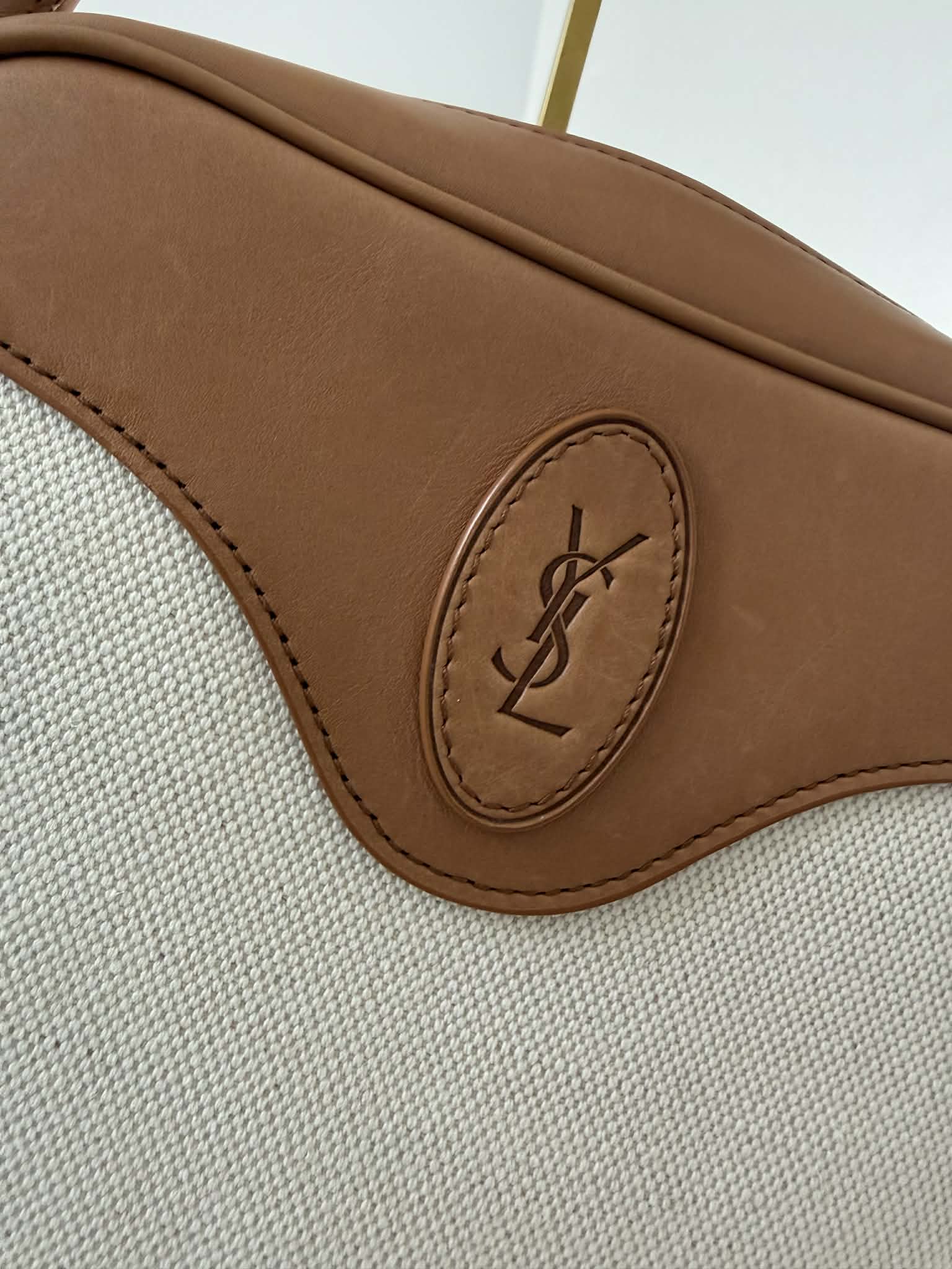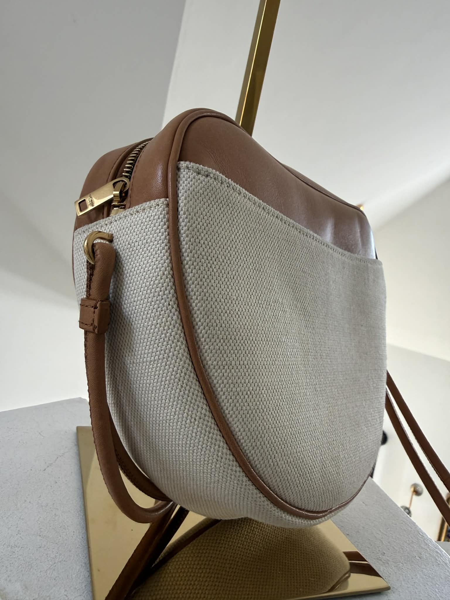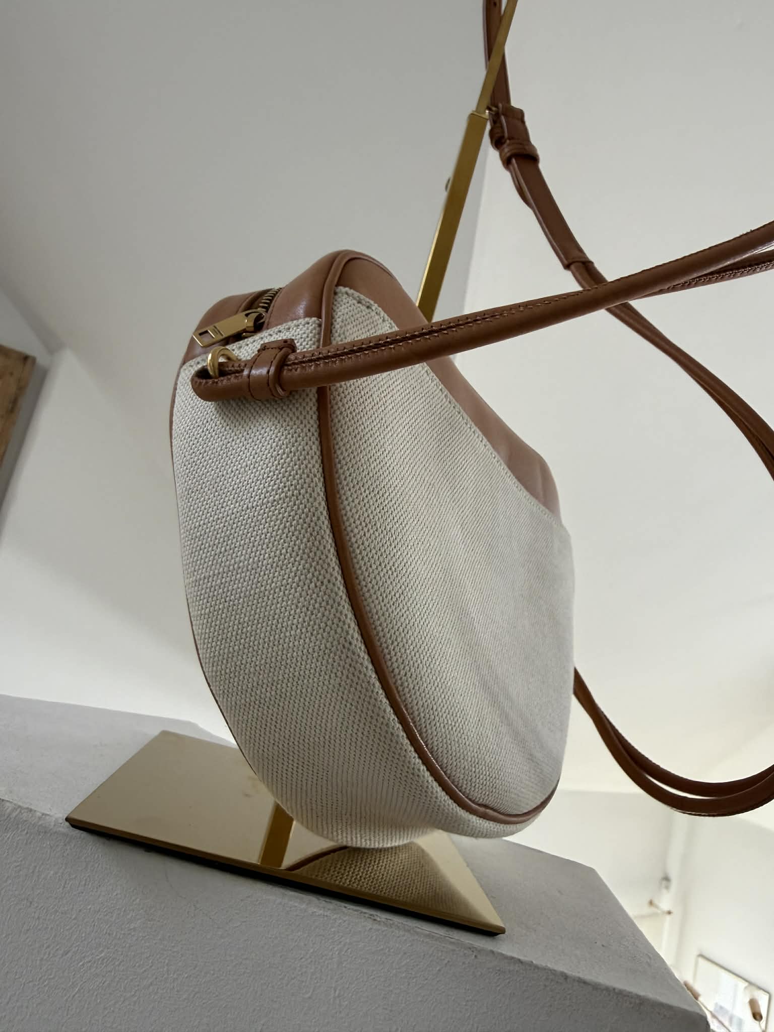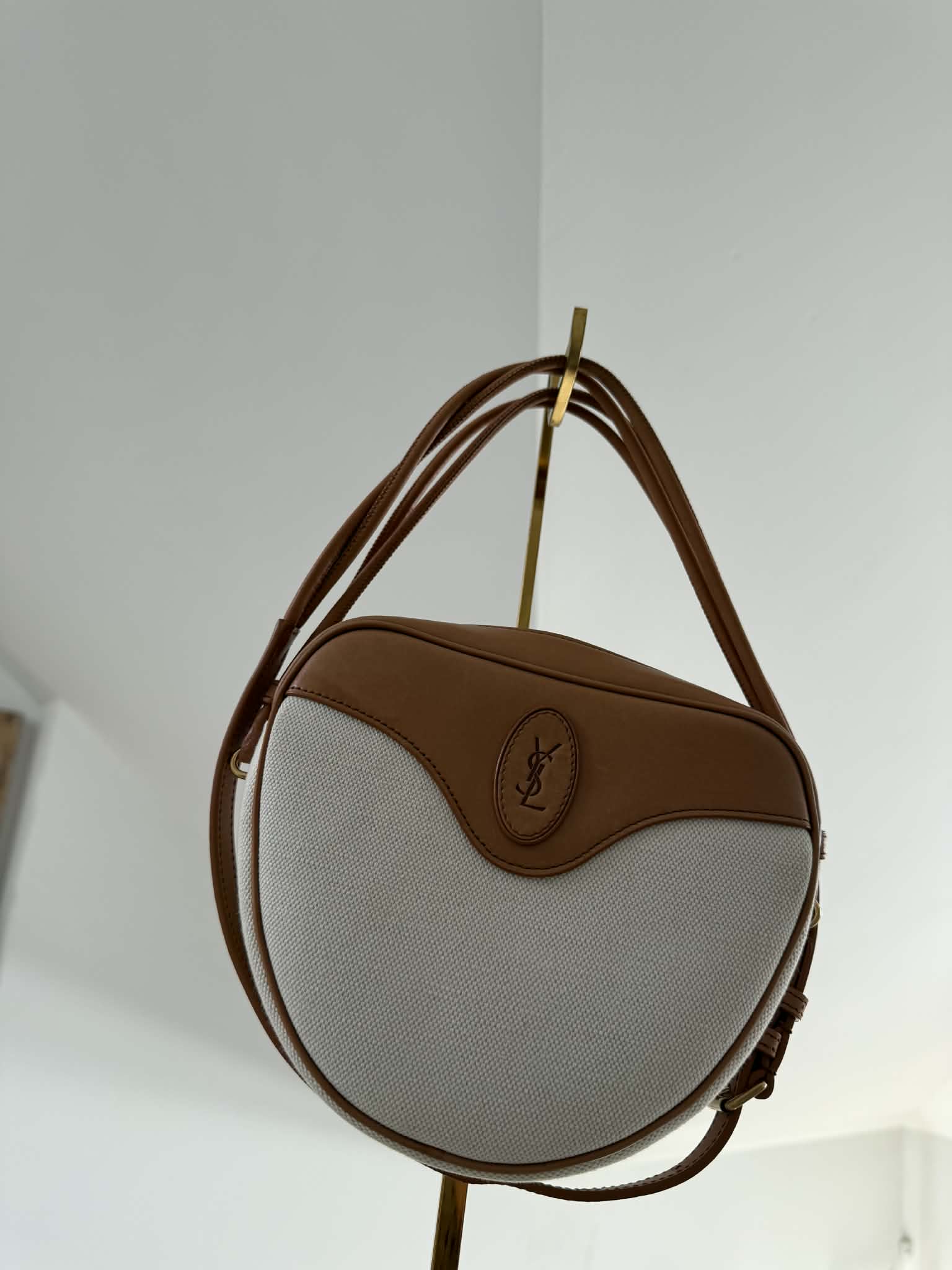 Torebka została wykonana z wysokiej jakości canvasu oraz skóry naturalnej, co zapewnia trwałość i elegancki wygląd. Klasyczne połączenie kolorów białego i brązowego oraz charakterystyczny monogram marki podkreślają jej luksusowy charakter.