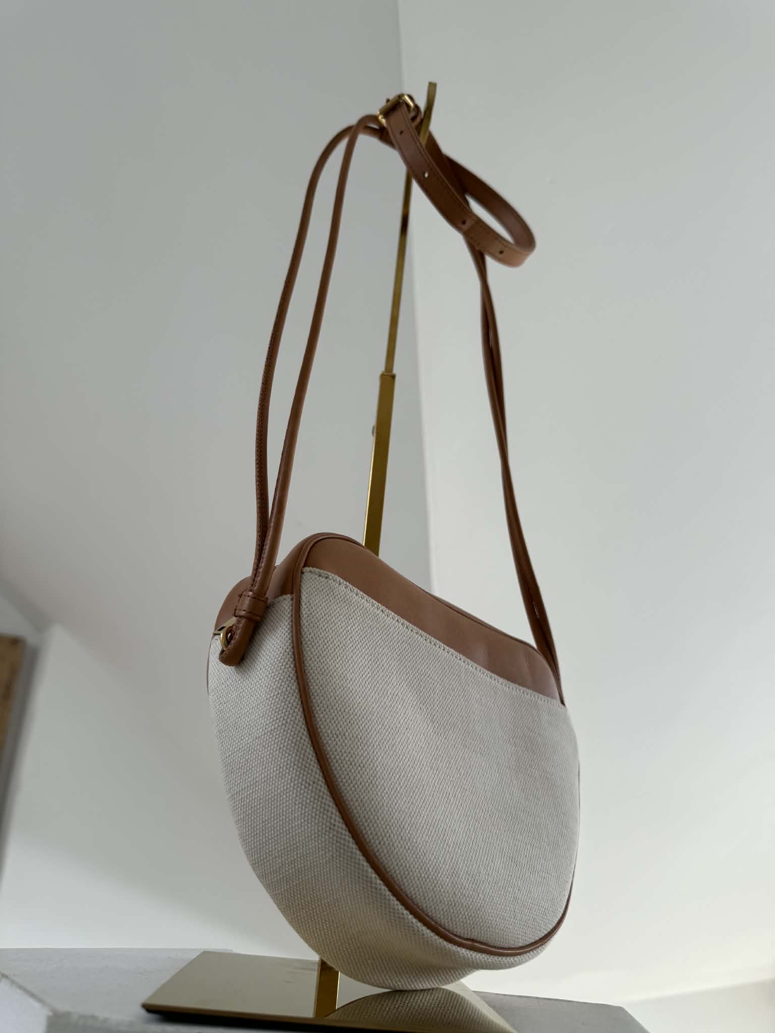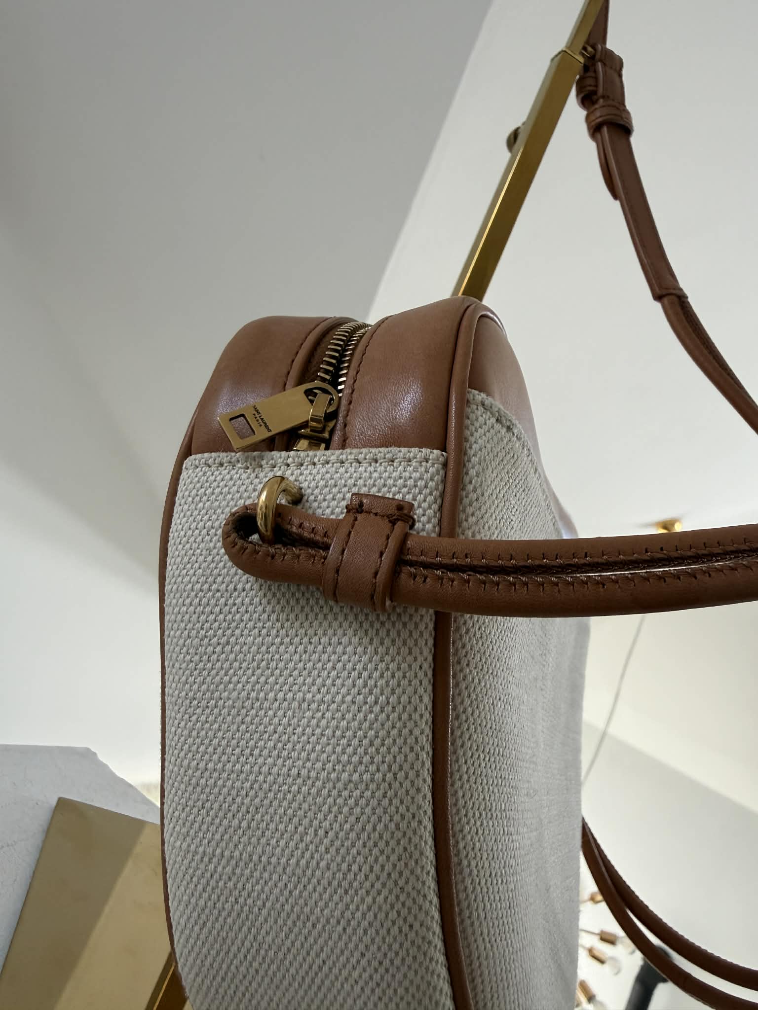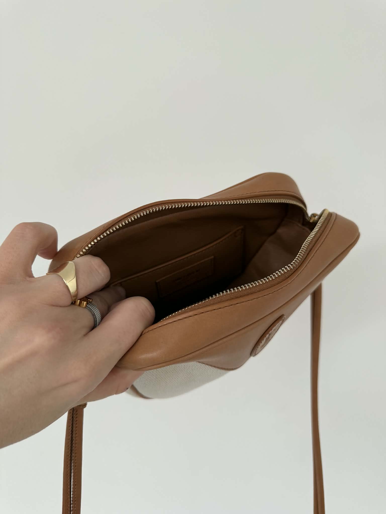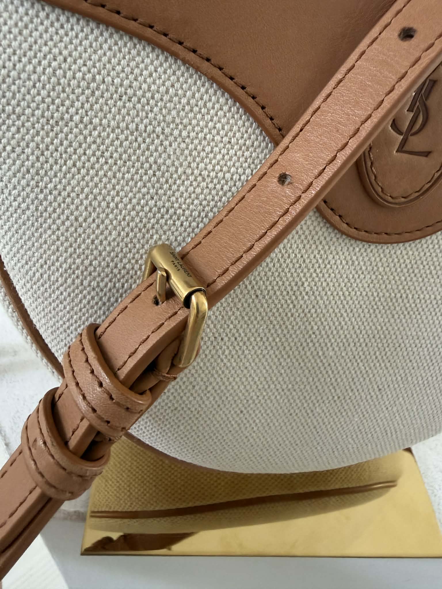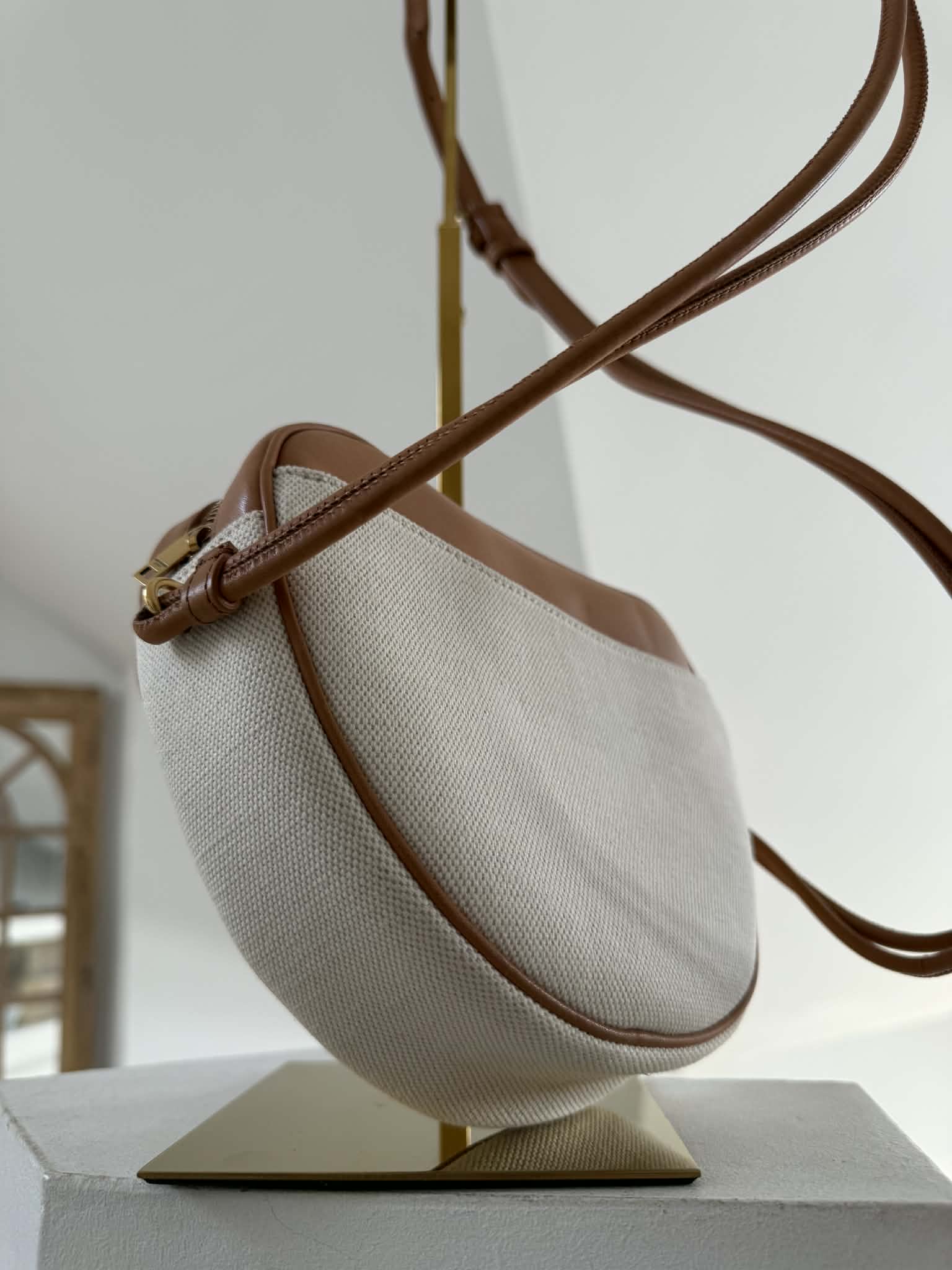 Torebka została wykonana z wysokiej jakości canvasu oraz skóry naturalnej, co zapewnia trwałość i elegancki wygląd. Klasyczne połączenie kolorów białego i brązowego oraz charakterystyczny monogram marki podkreślają jej luksusowy charakter.