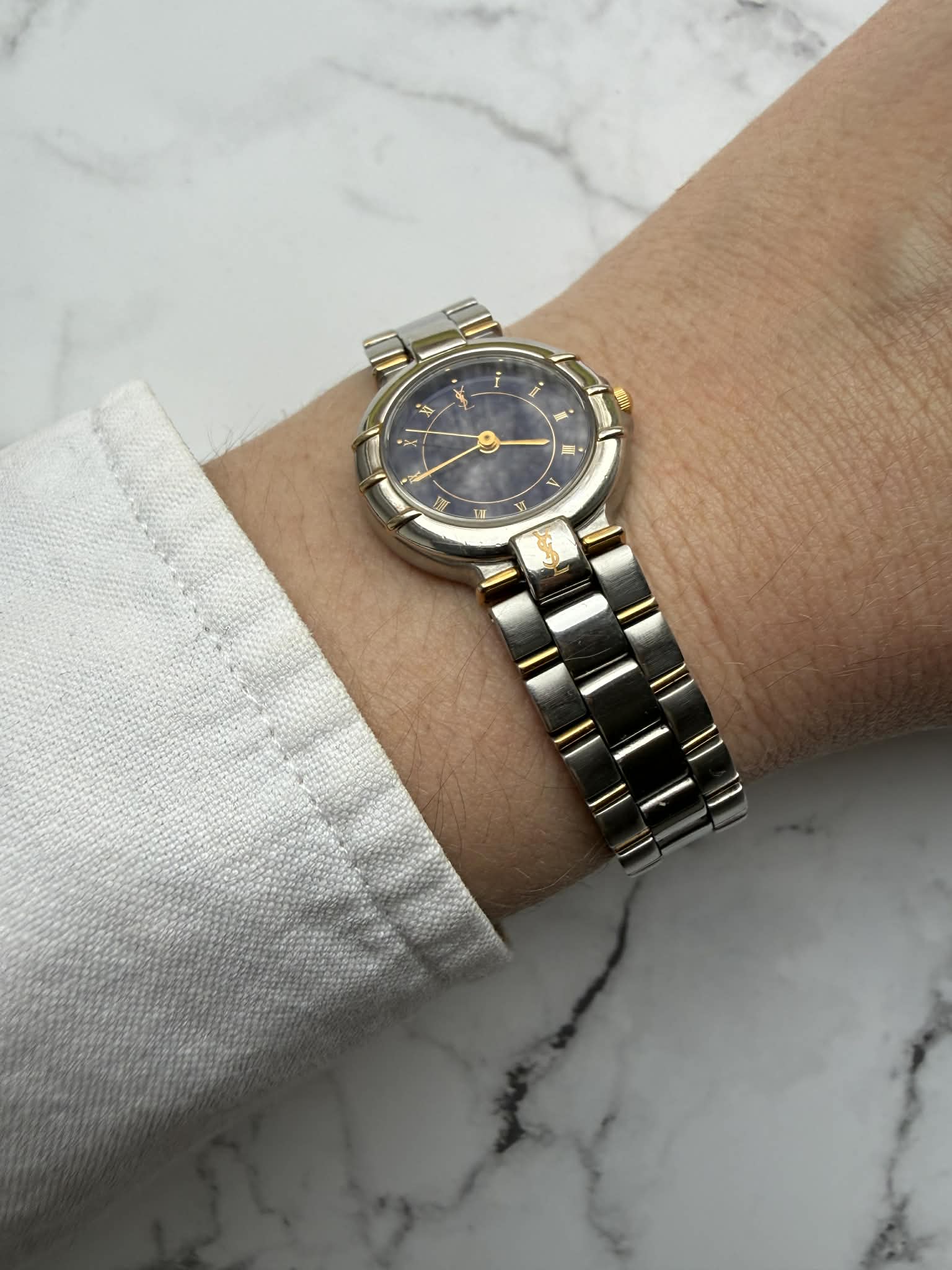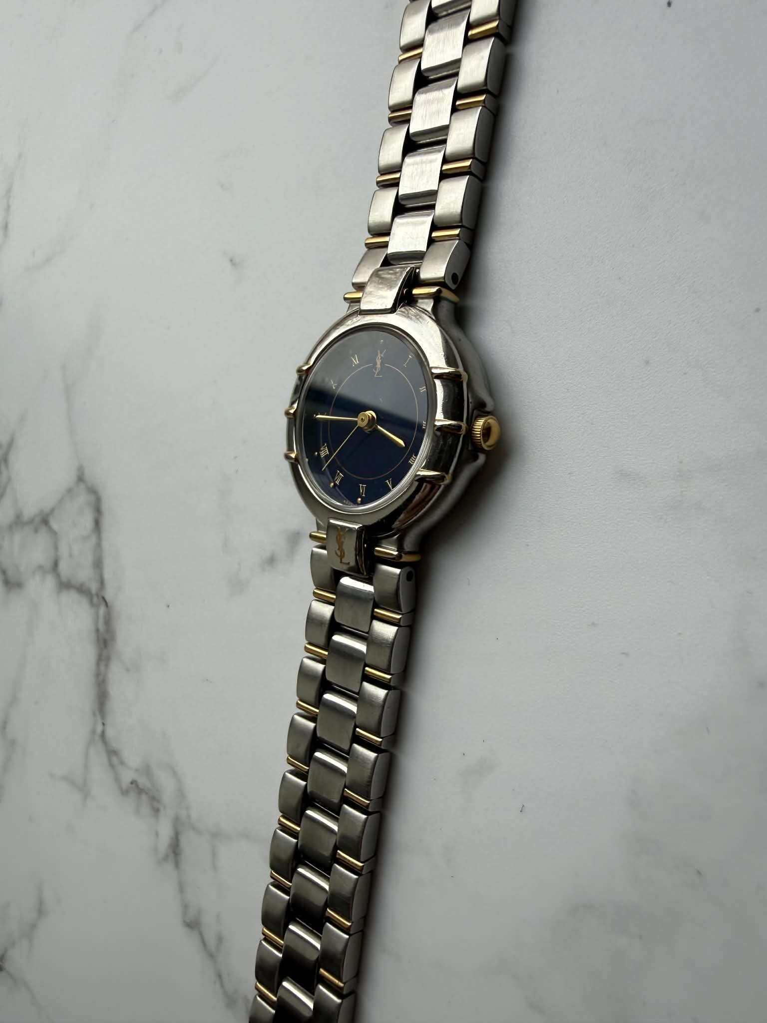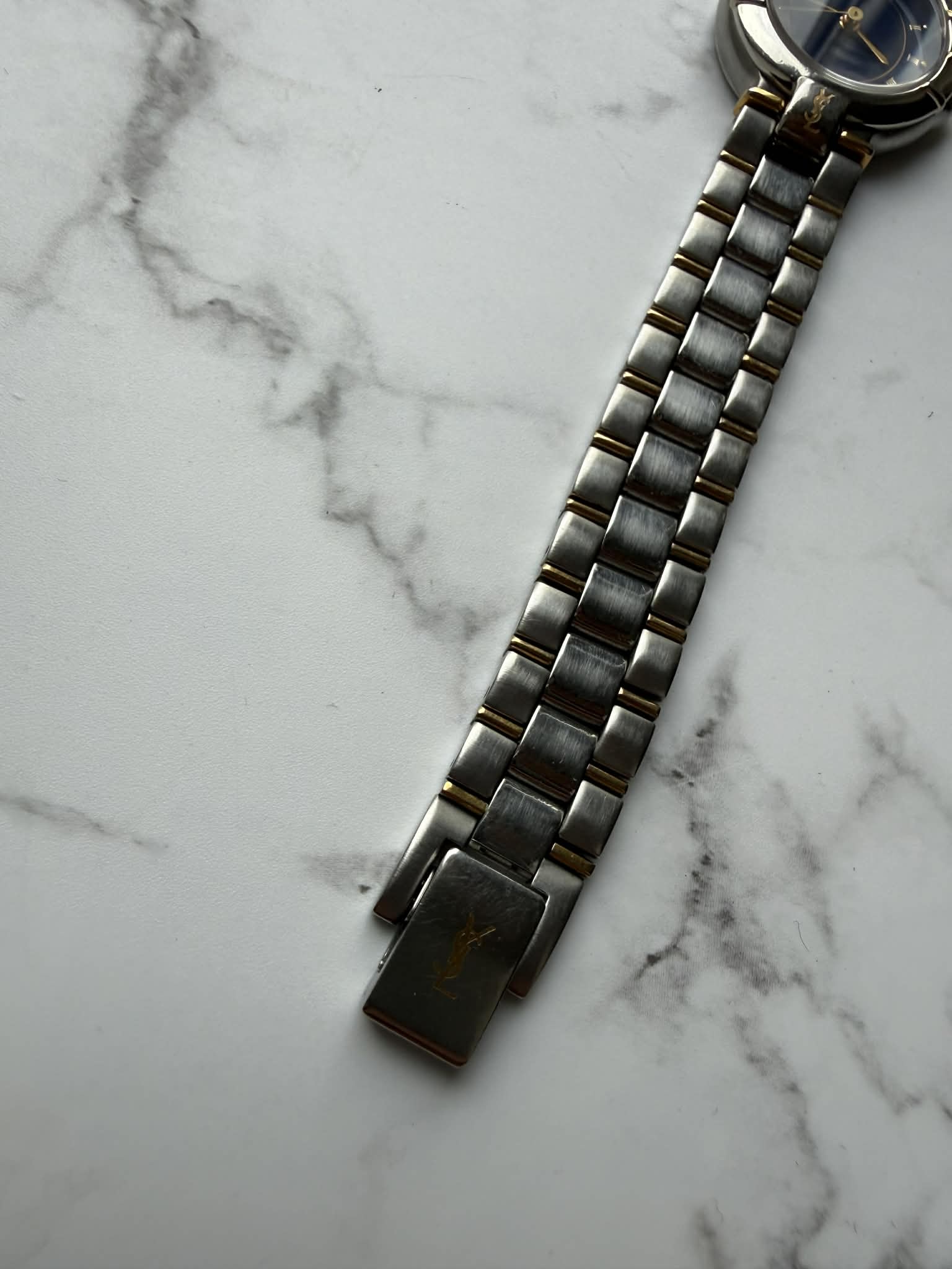 YSL oryginalny zegarek vintage, złoto-srebrny, koperta 25mm, niebieska tarcza, oryginalny