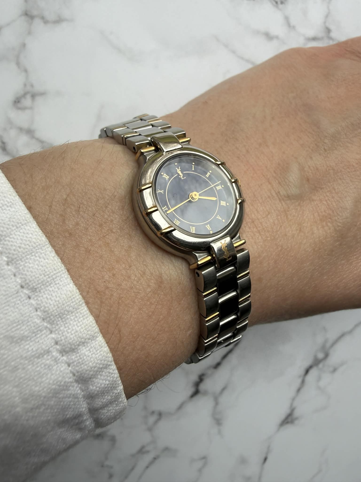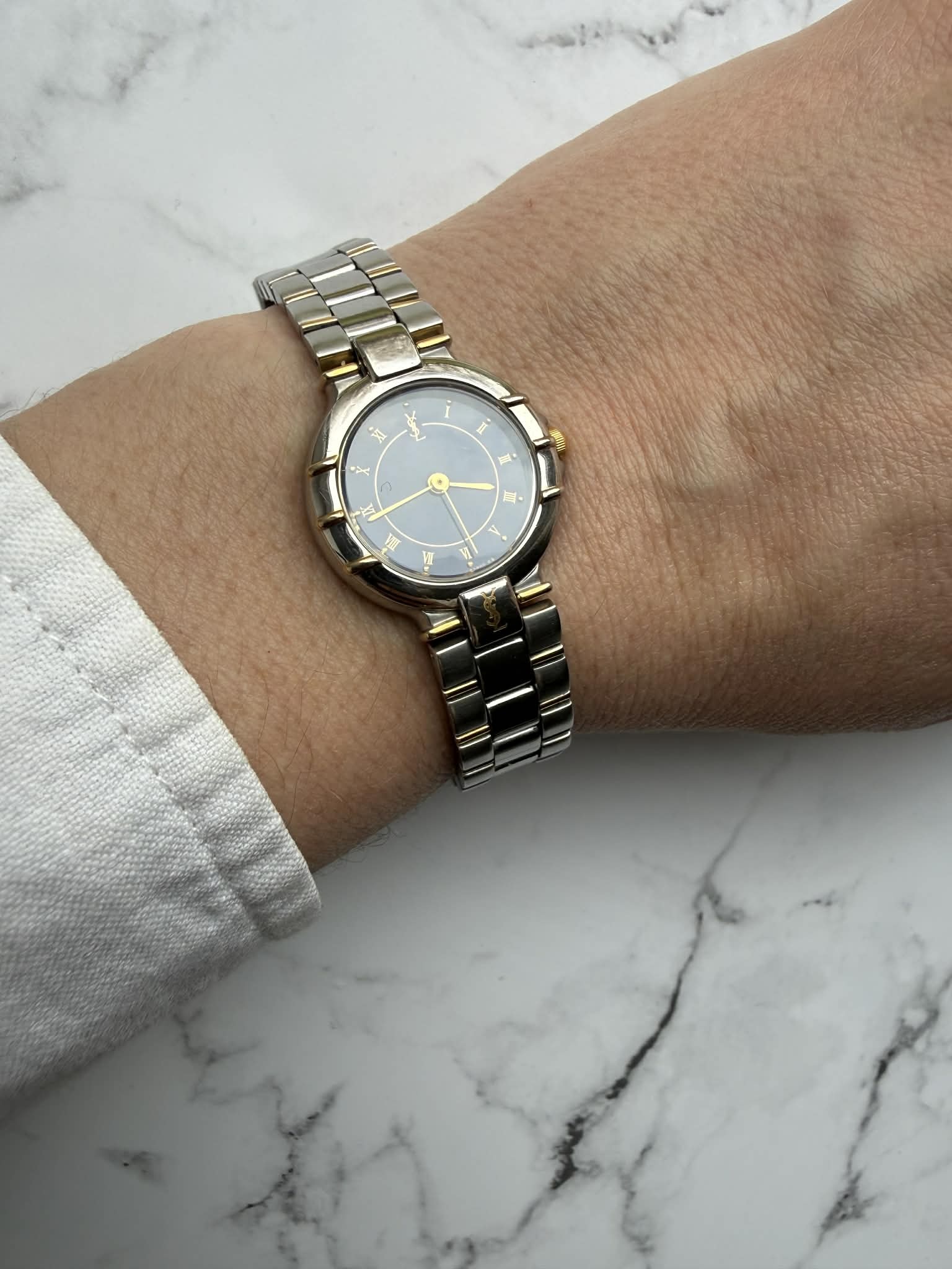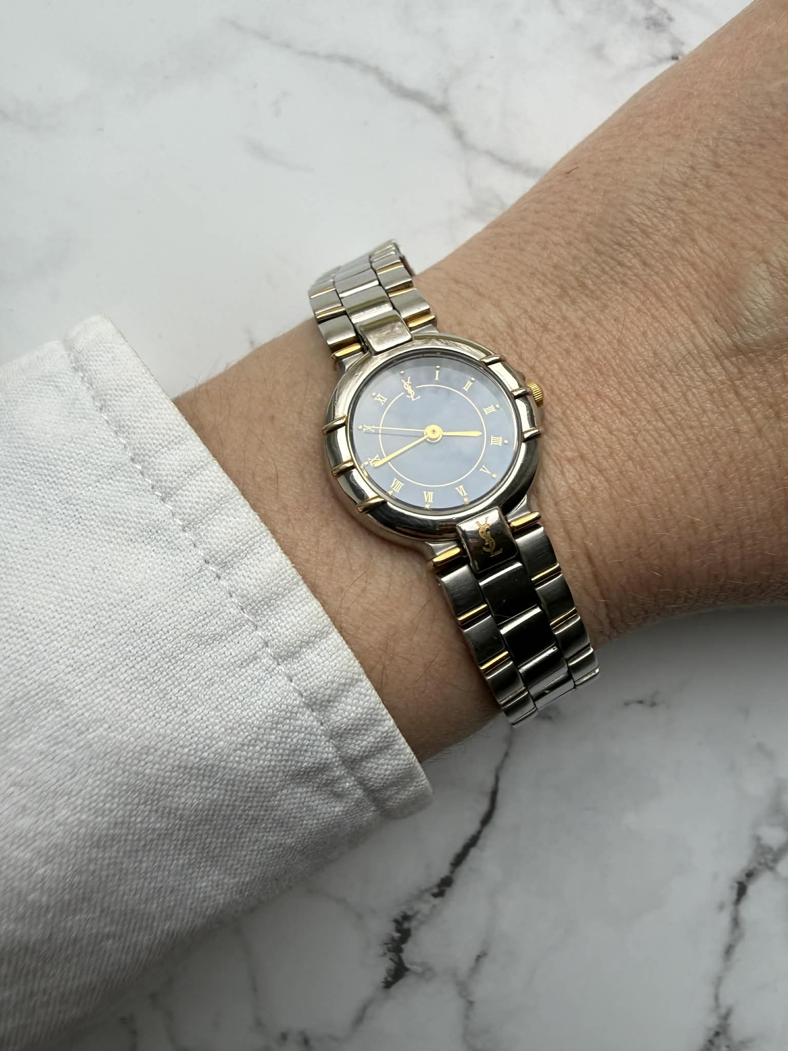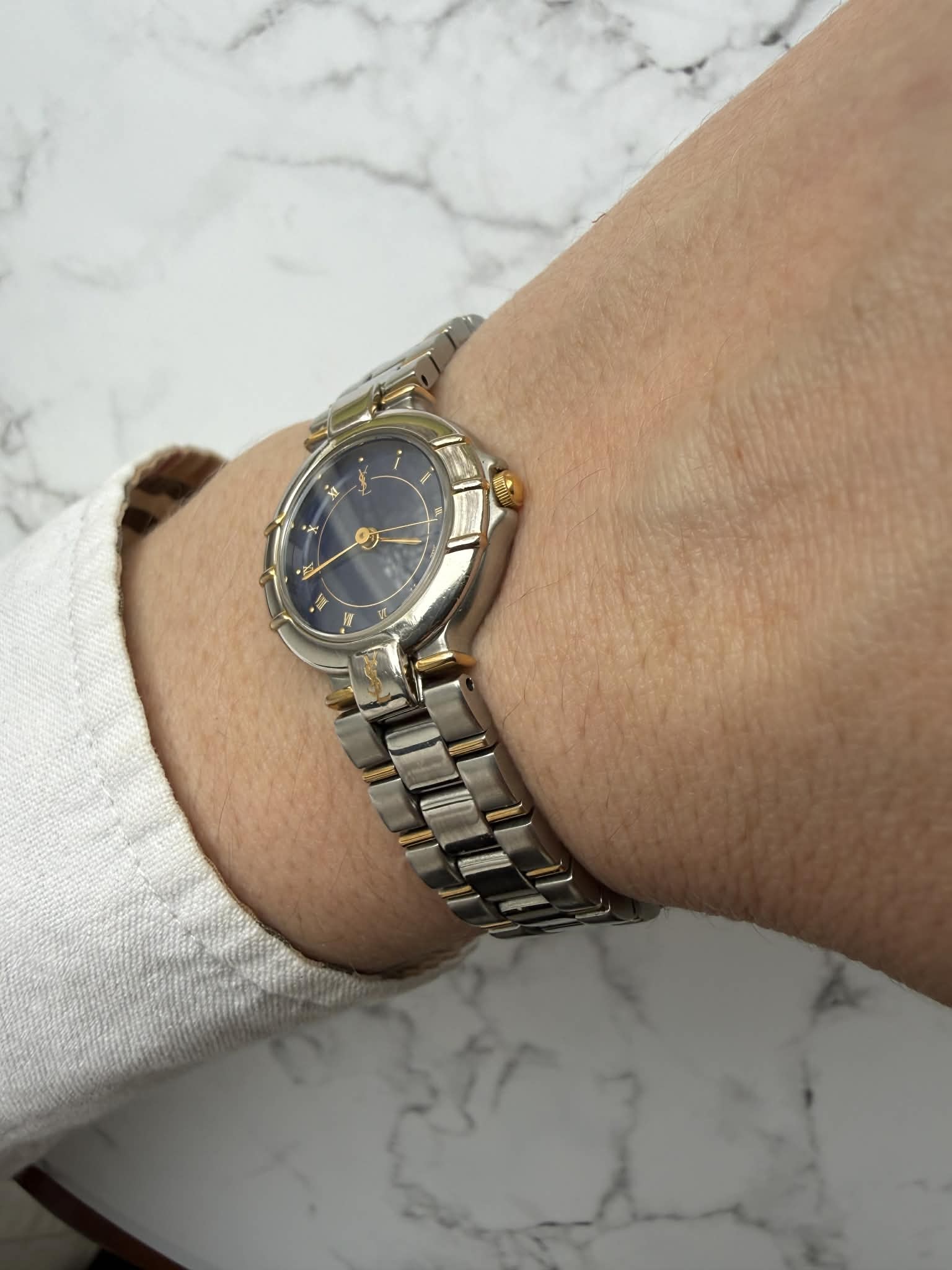YSL oryginalny zegarek vintage, złoto-srebrny, koperta 25mm, niebieska tarcza, oryginalny